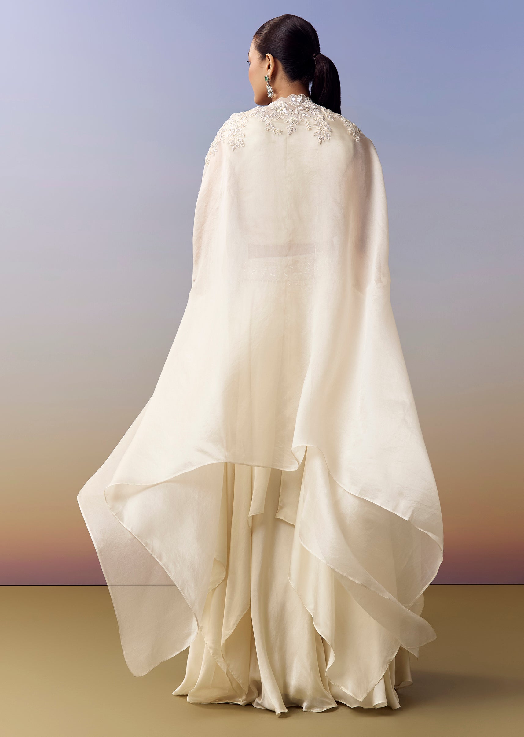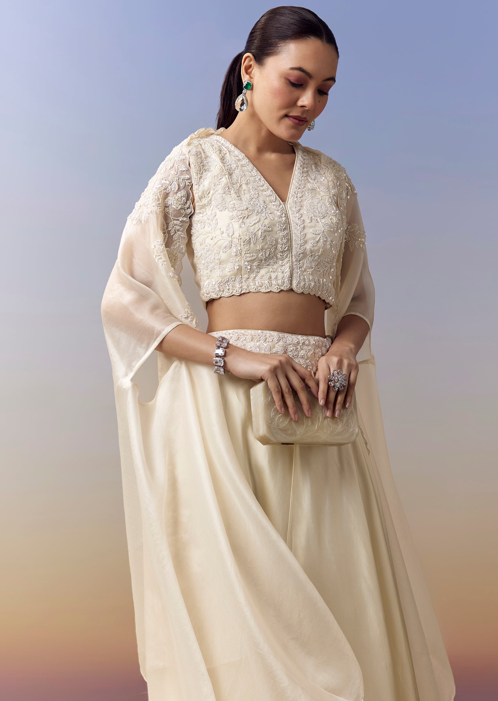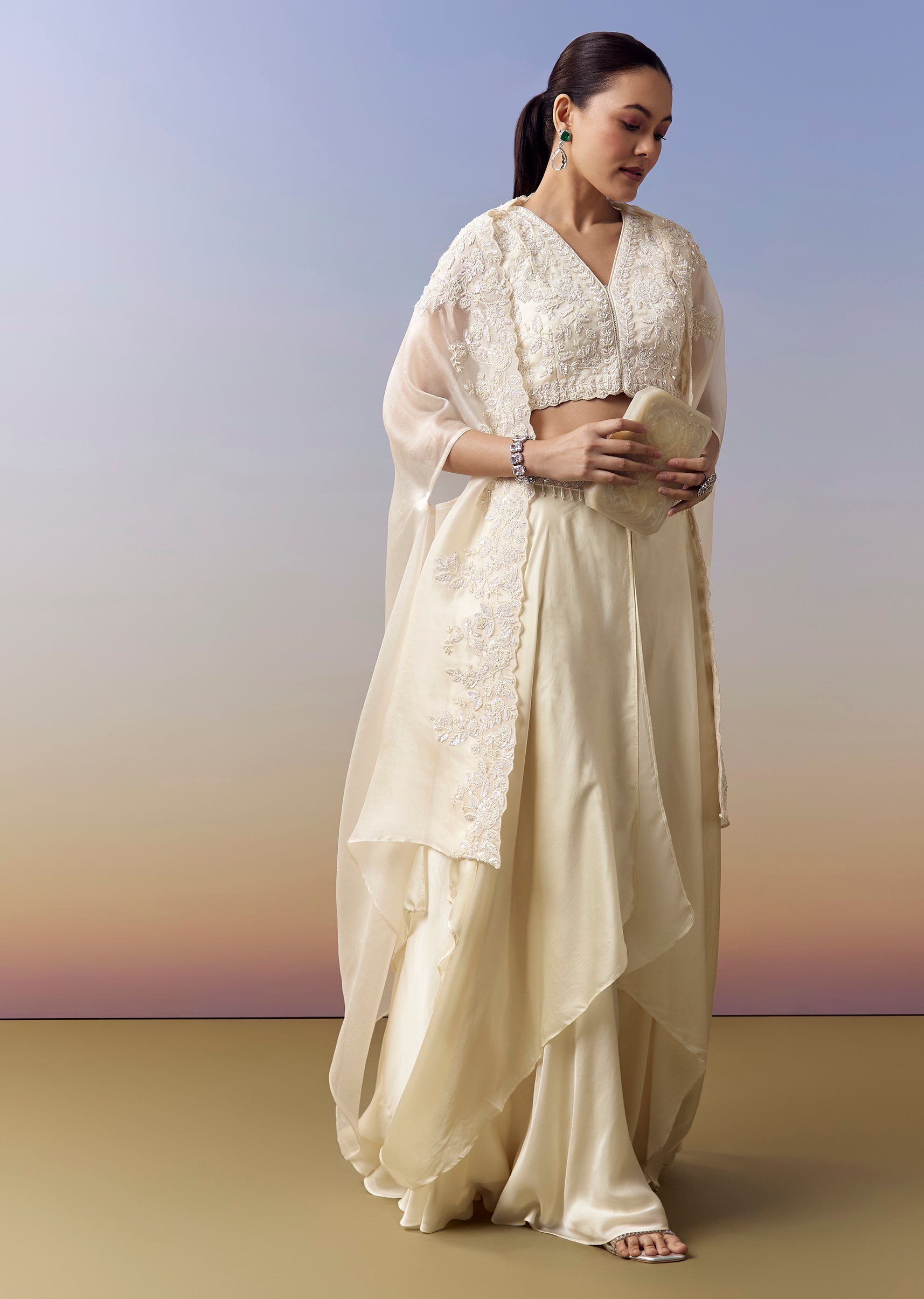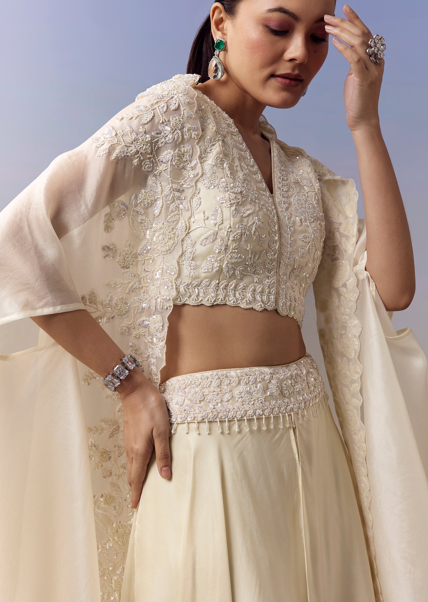 White Indo Western Crop Top Skirt Set With Moti Work And Cape