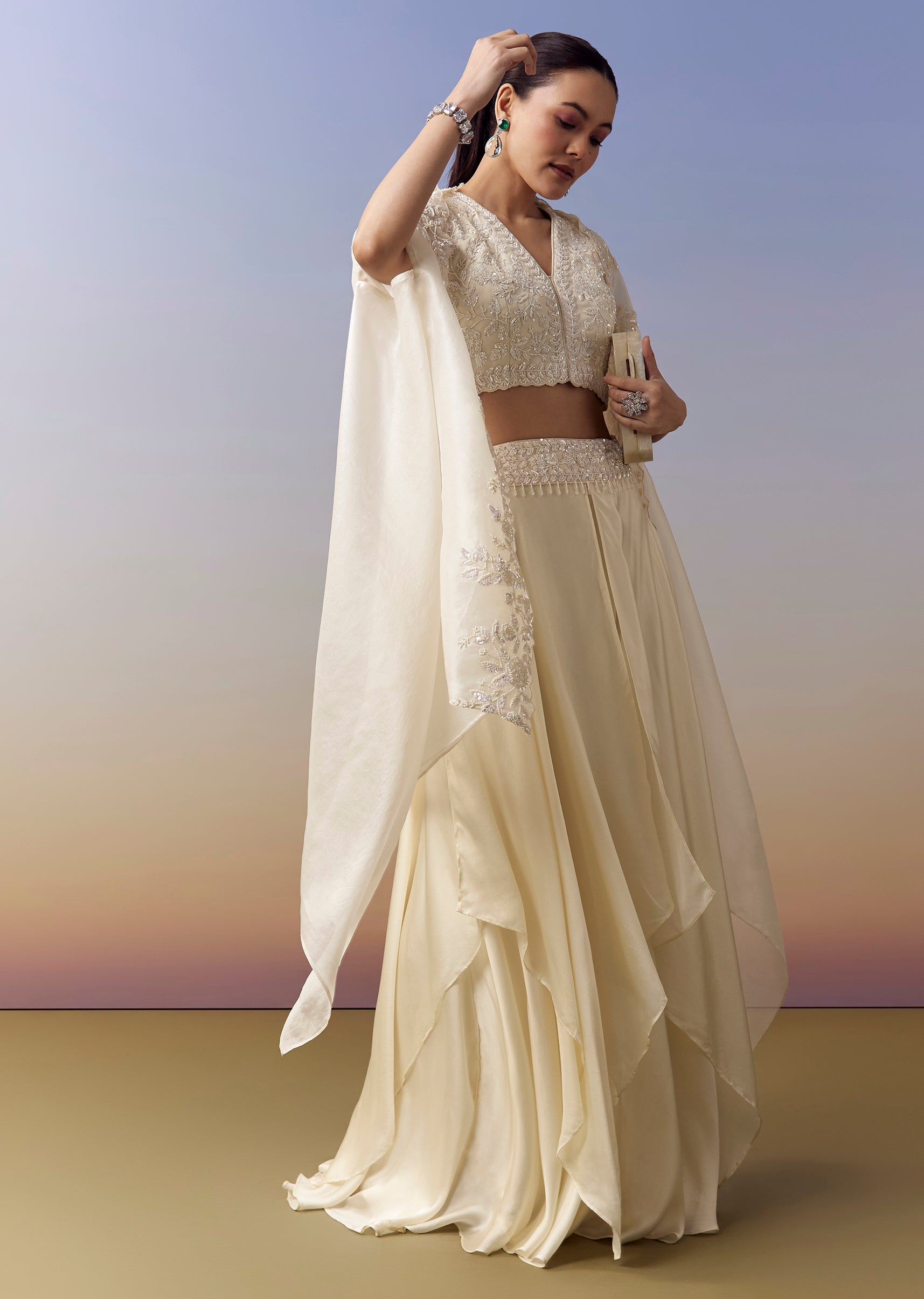 Graceful and refined, this white Indo Western crop top and skirt set is a timeless choice for sangeet, engagement and reception celebrations. The satin base lends a soft sheen, while the crop top is embellished with delicate moti work that adds subtle elegance. The embroidered cape drapes beautifully, enhancing the outfit with fluid movement and festive charm. Finished with a sleeveless V neckline, this ensemble balances sophistication with contemporary appeal. Awarded as the Most Trusted Brand, we're delivering styles you love, just as promised.