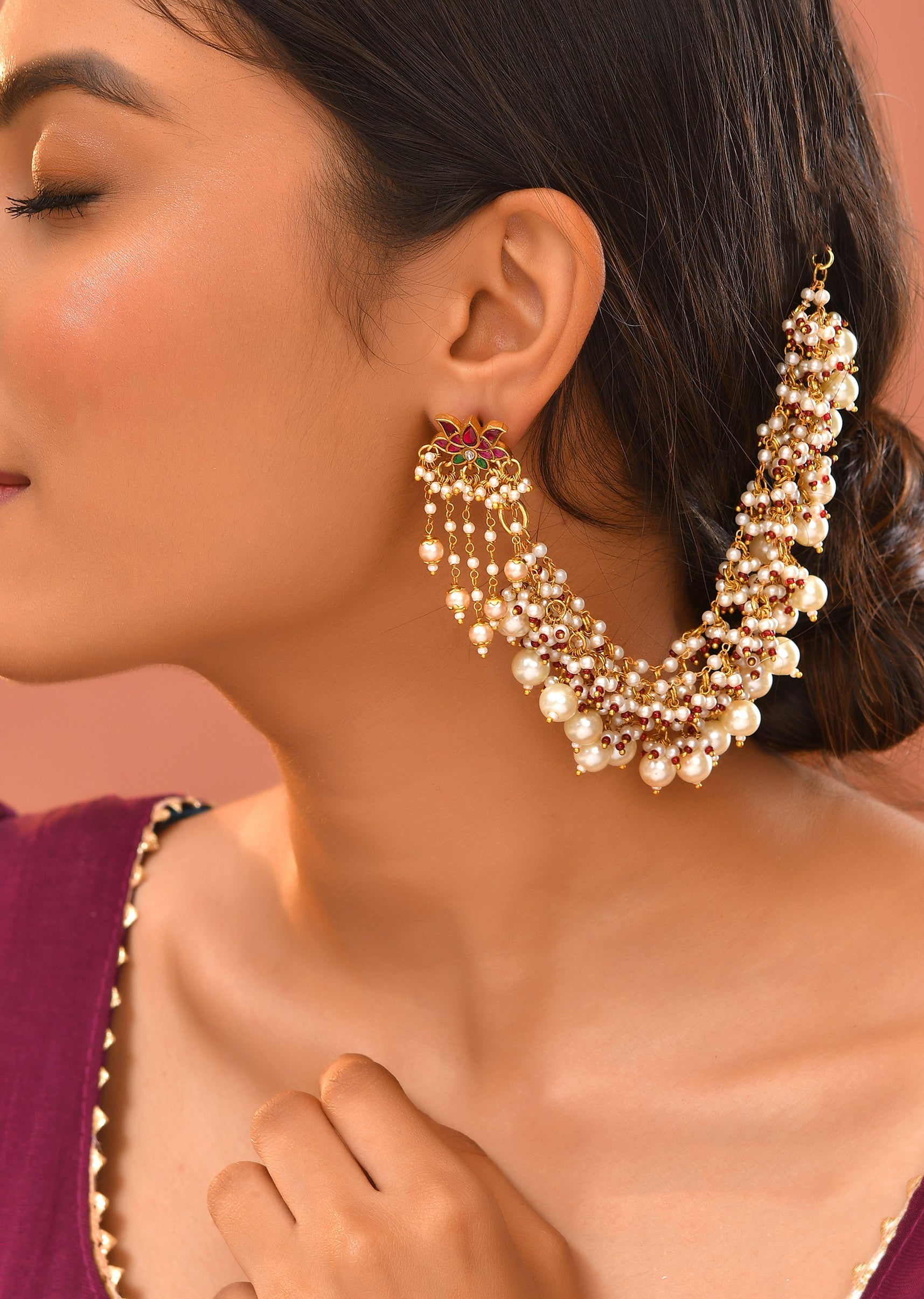 Add a touch of refined elegance to your look with this white kundan cluster bead drop earchain set, crafted with delicate detailing for a soft, traditional sparkle. Perfect for weddings... More Product Details