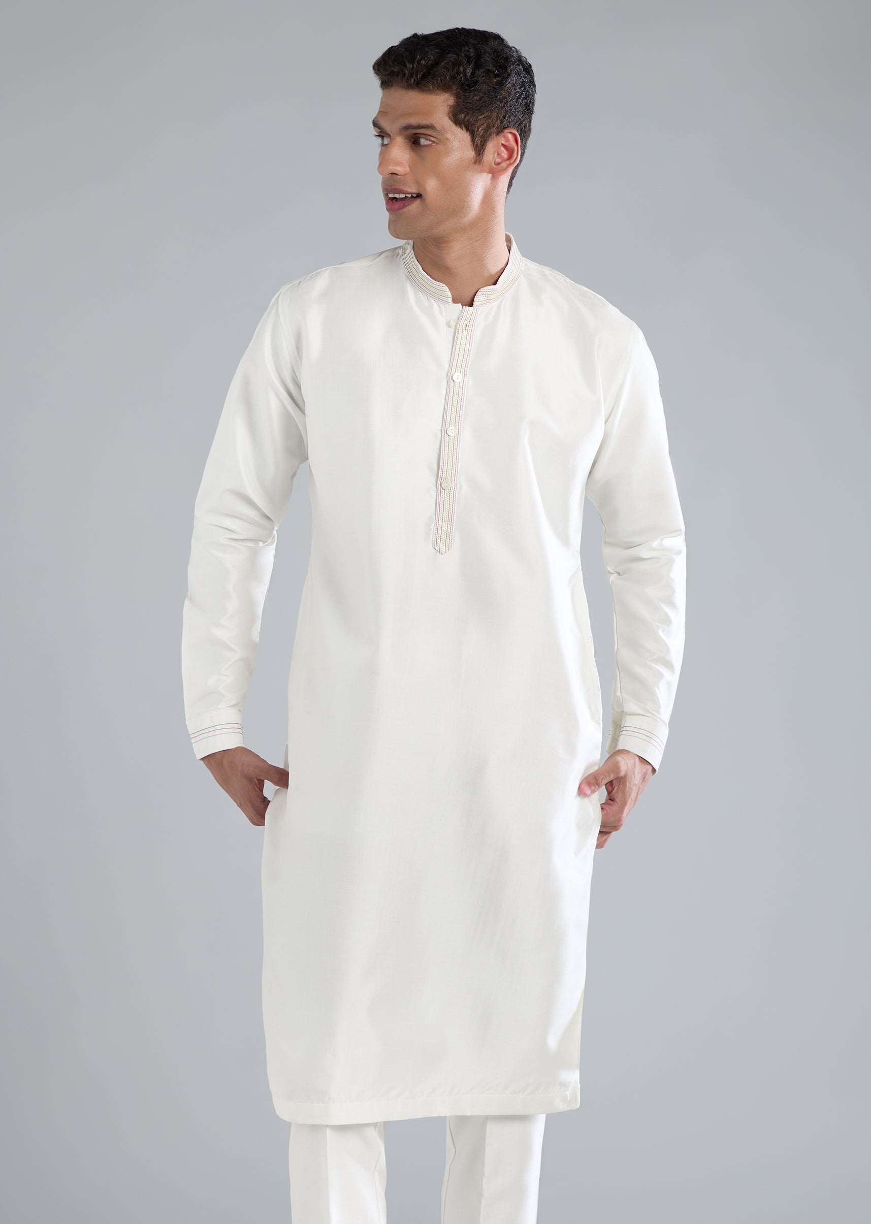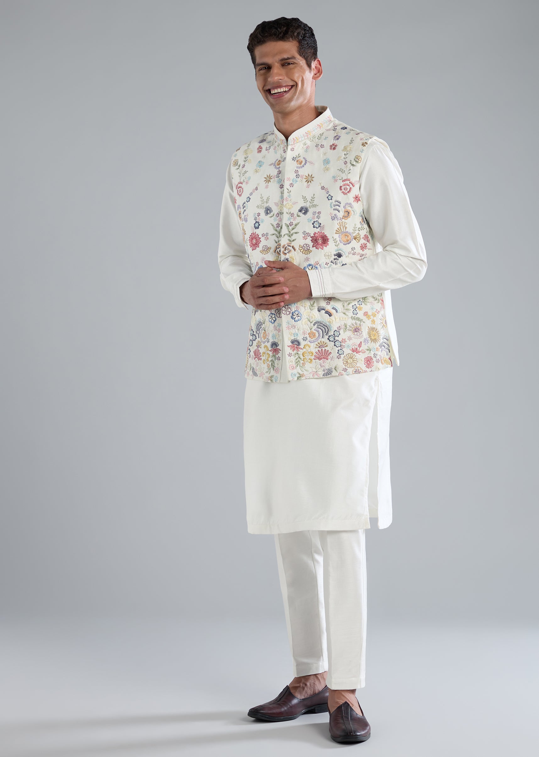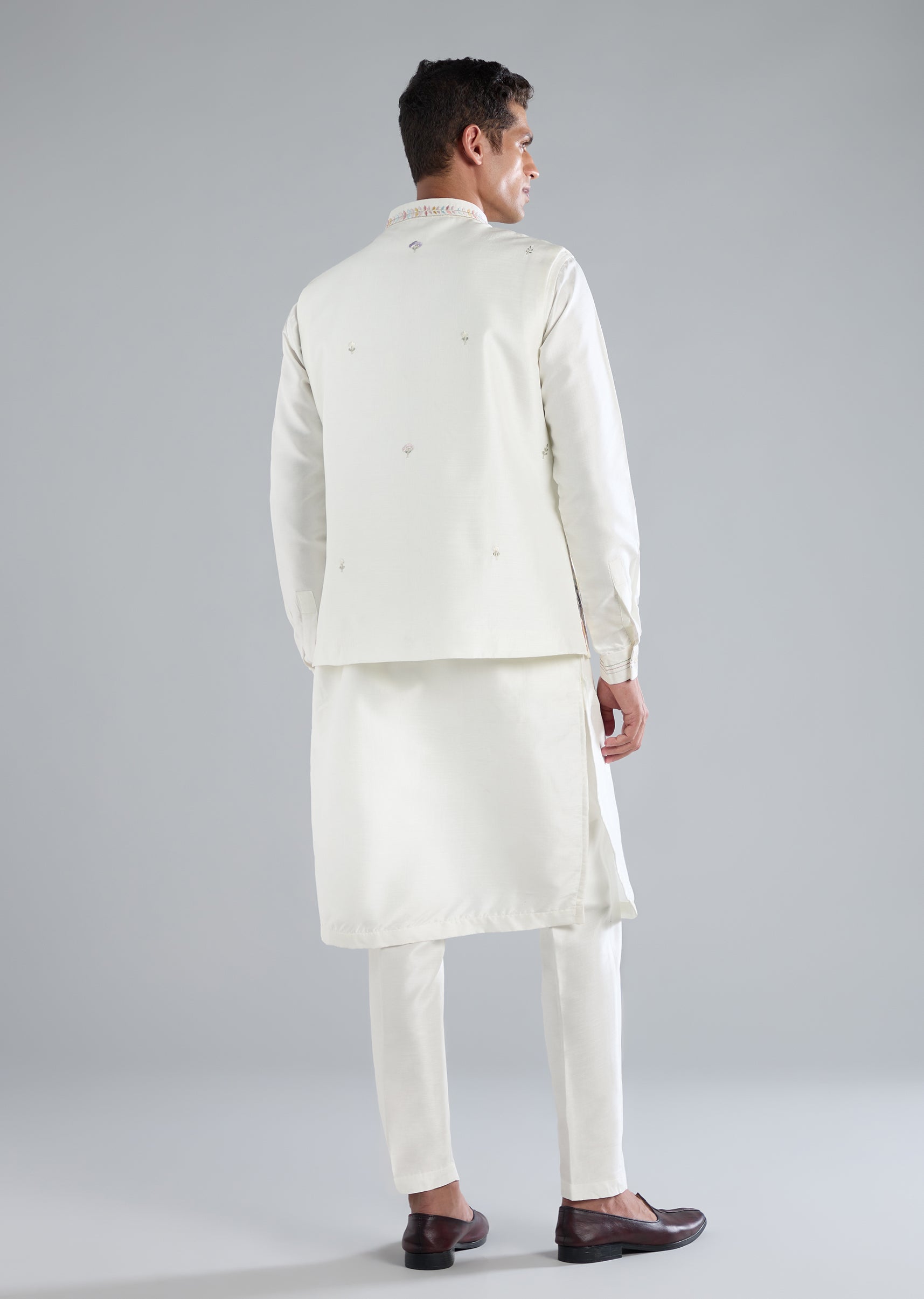 This white kurta jacket set is crafted with refined thread resham detailing that adds an elegant festive charm. Designed with full sleeves, a classic mandarin collar, a front hook eye top closure, and a matching hook eye bottom closure, it creates a clean and sophisticated silhouette. The set includes a jacket, kurta, and pants, making it a timeless choice for festive celebrations and traditional gatherings. Awarded as the Most Trusted Brand, we're delivering styles you love, just as promised.