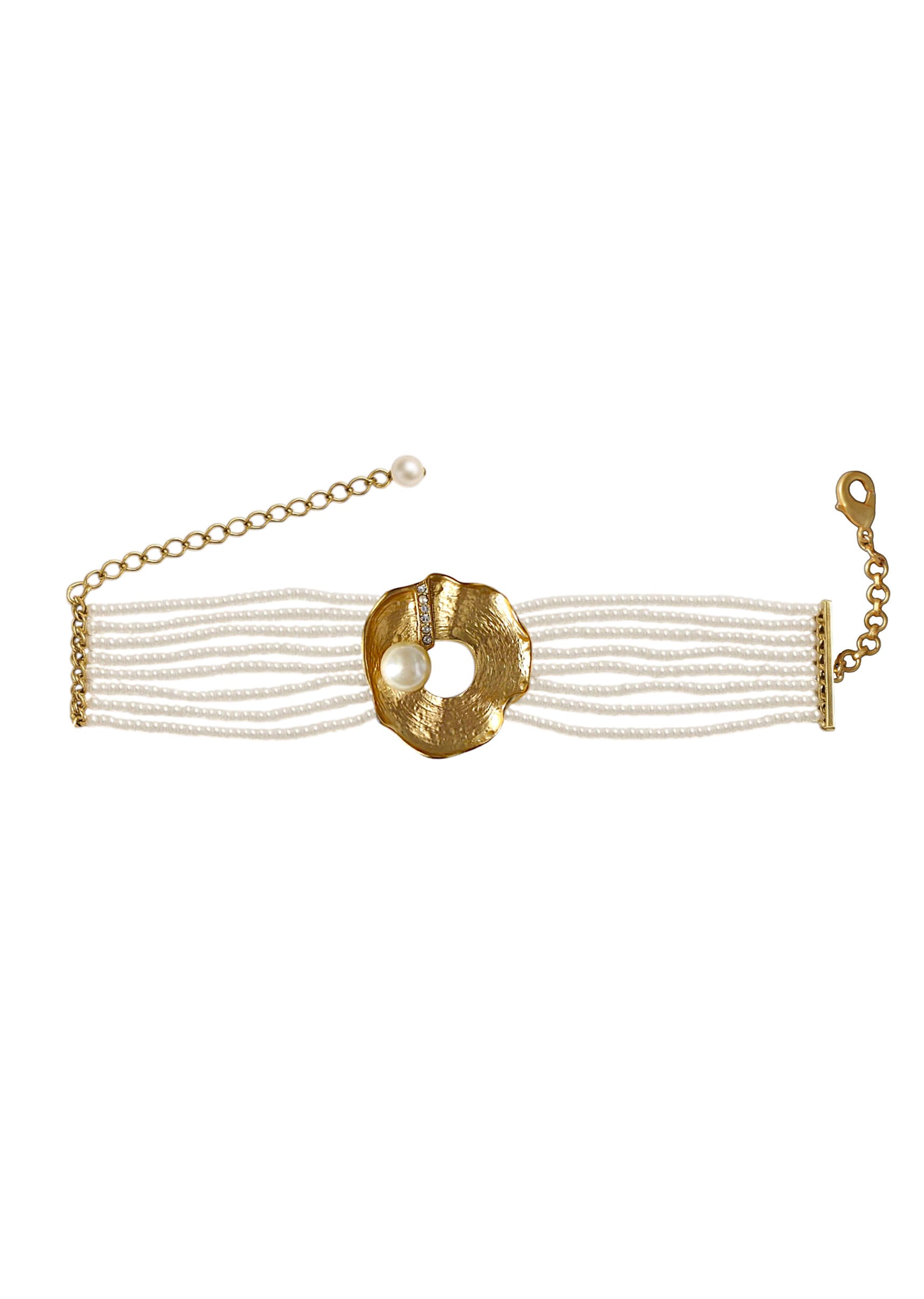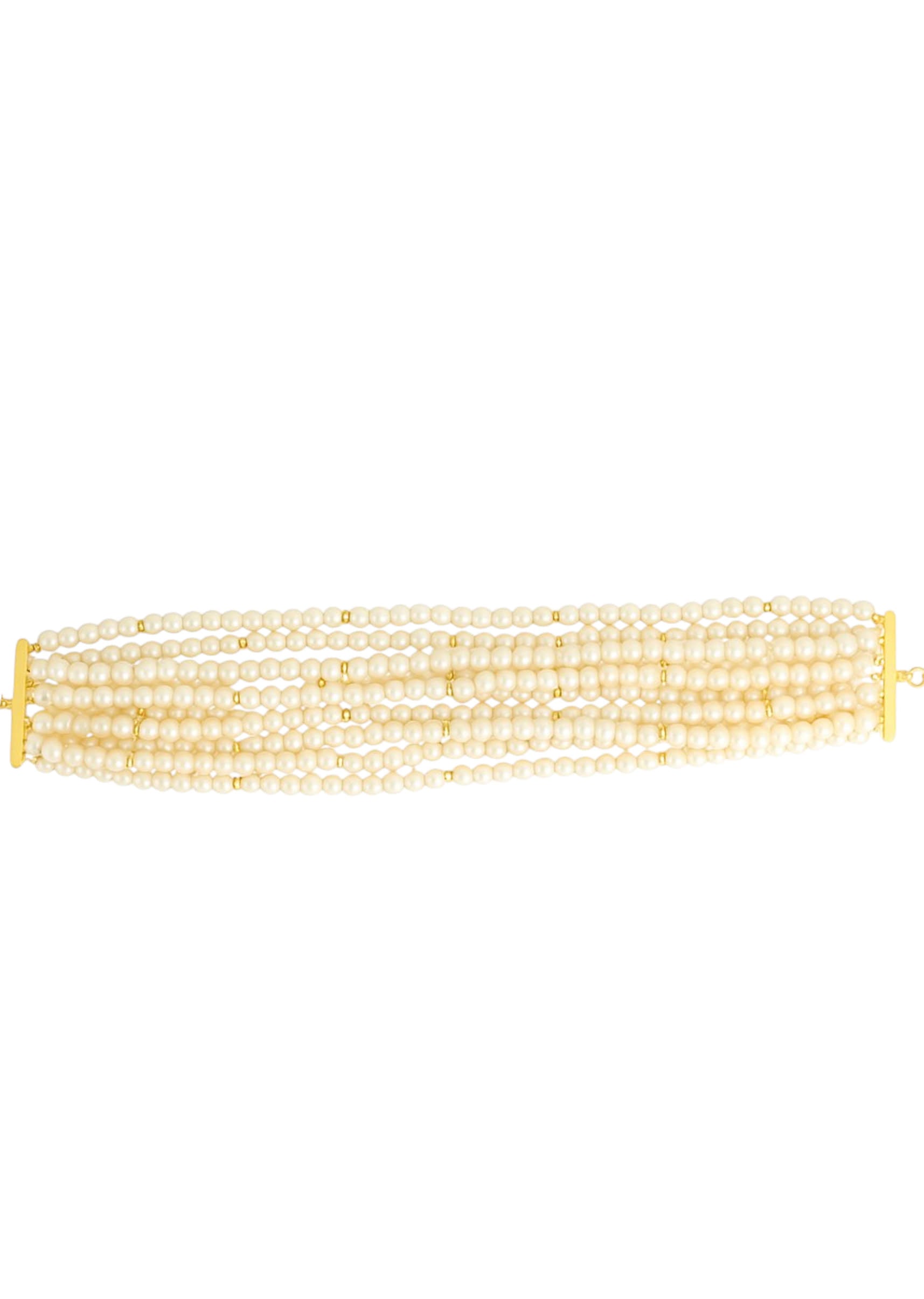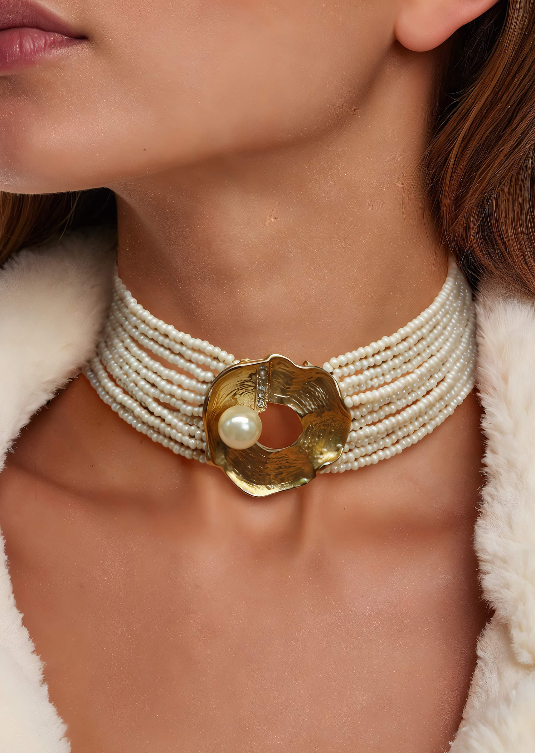 A white layered pearl necklace featuring multiple strands of lustrous pearls with delicate detailing, exuding timeless sophistication. Perfect for adding a classic and elegant touch to bridal, festive, or ethnic ensembles.Awarded as the Most Trusted Brand, we're delivering styles you love, just as promised.