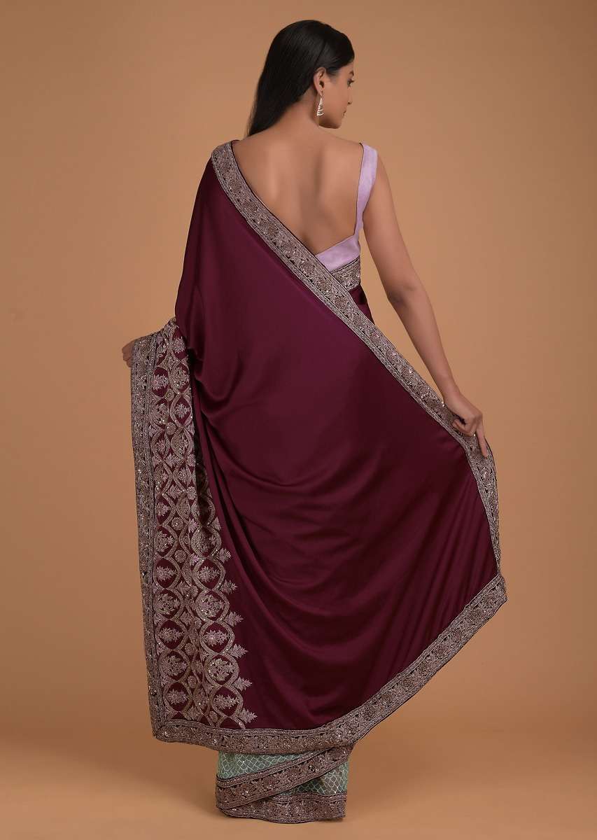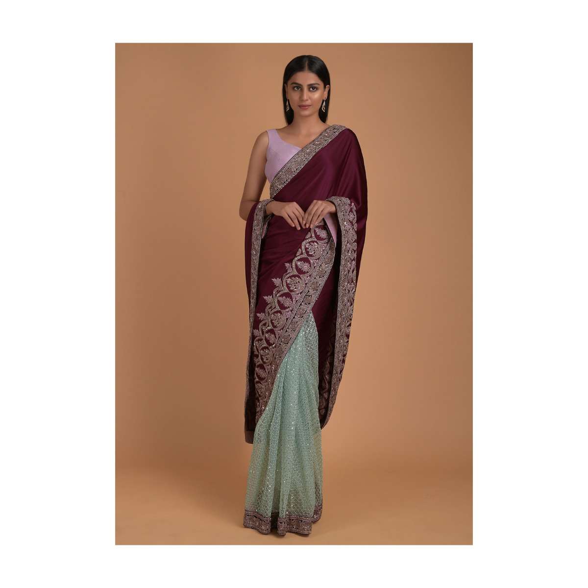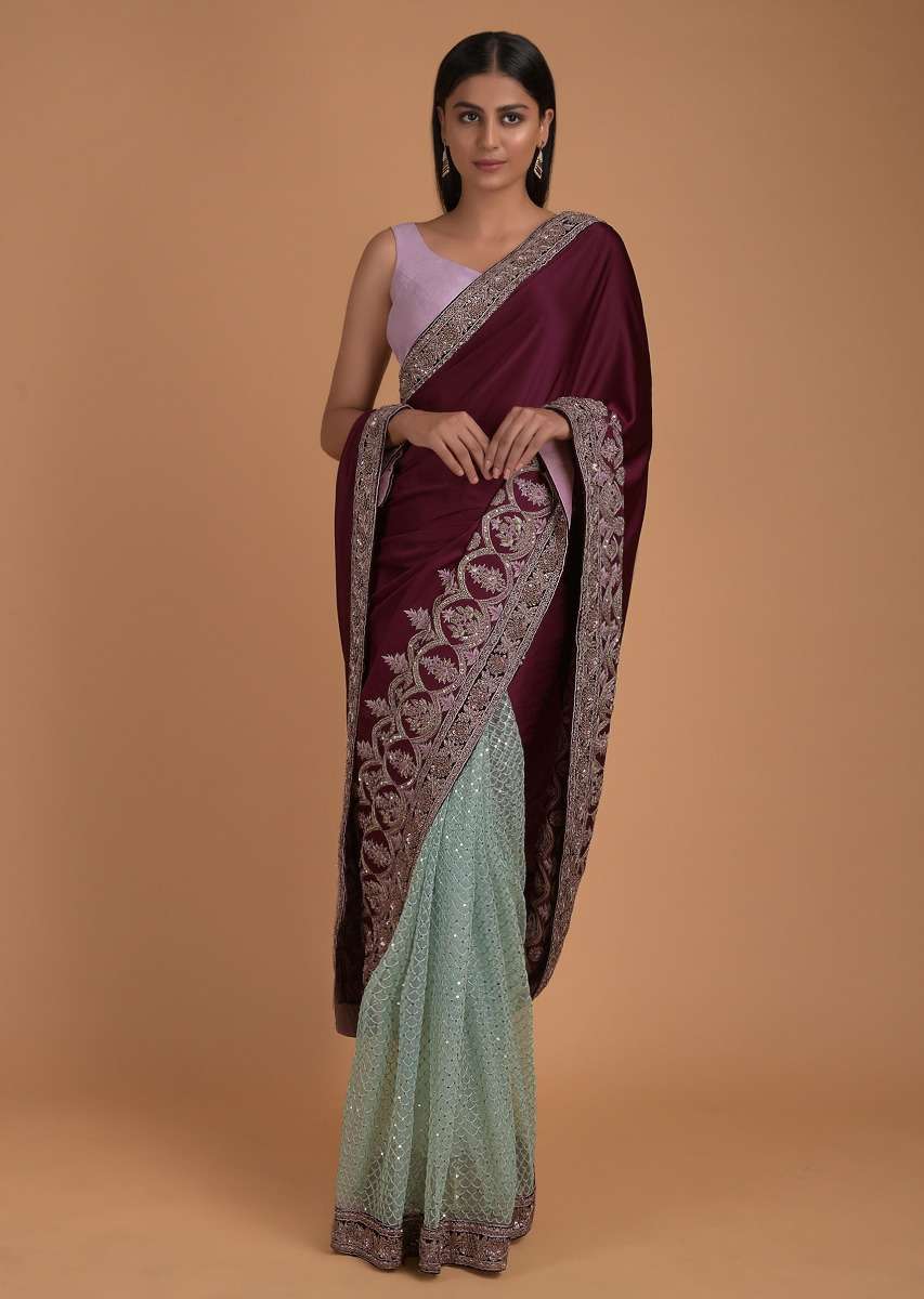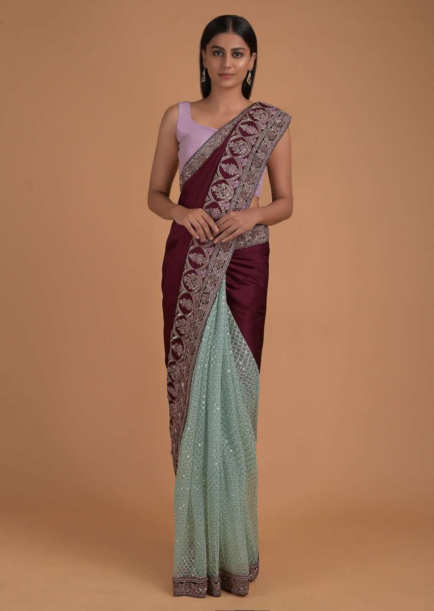 Wine And Turq Half And Half Saree With Satin Pallu And Net Pleats With Scallop Embroidery Online - Kalki Fashion