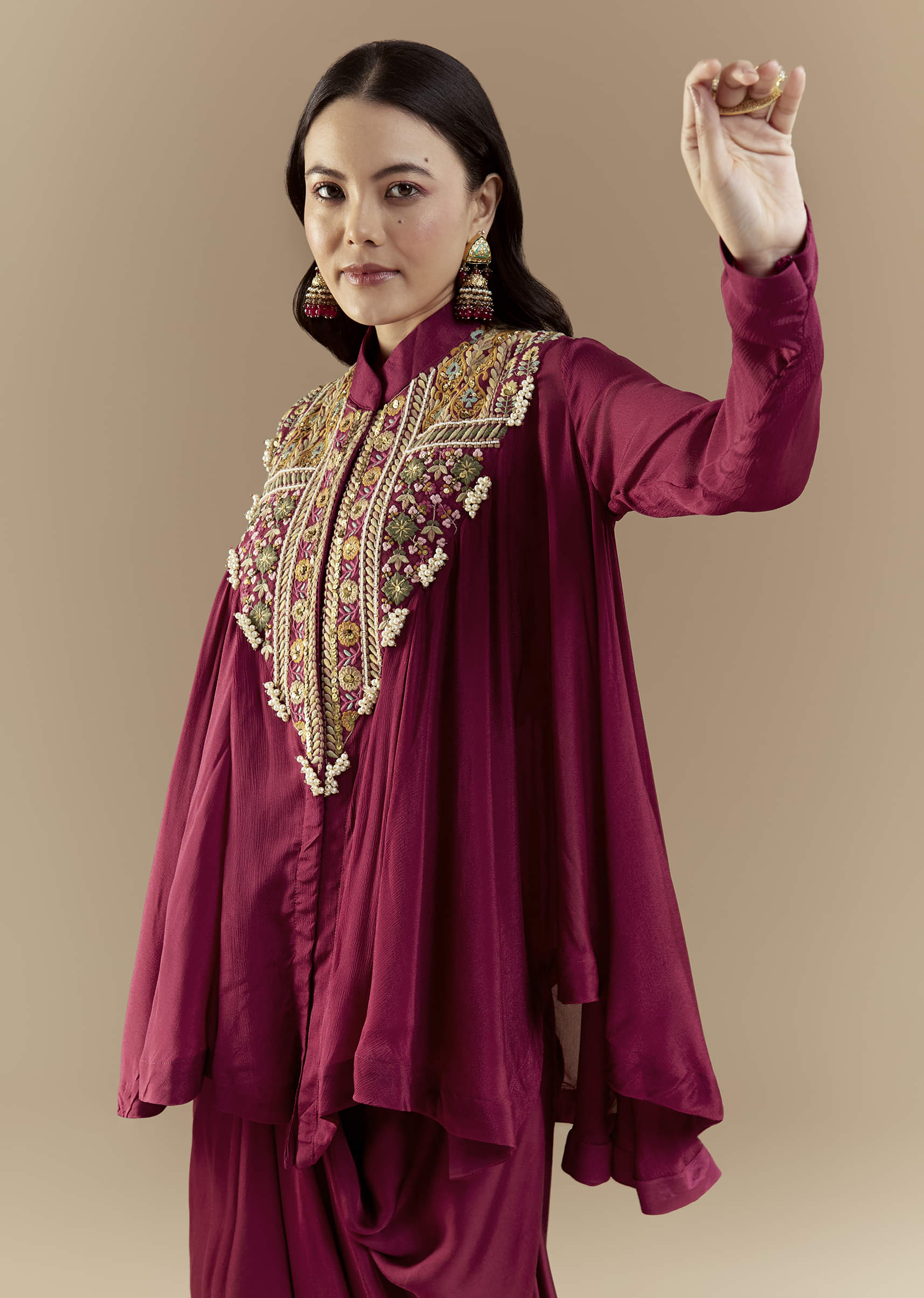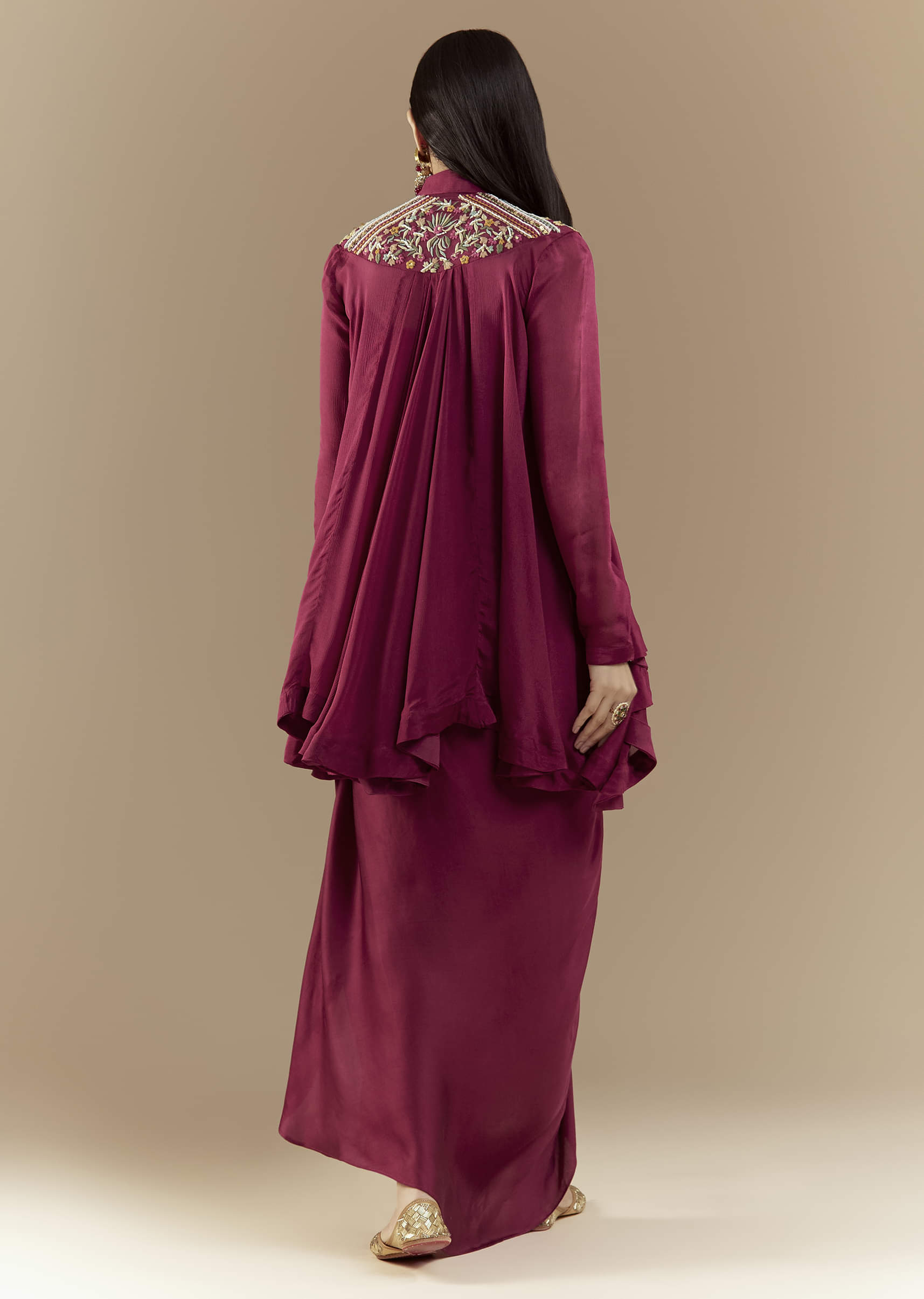 Wine Chinon Asymmetric Cape Top and Skirt Set