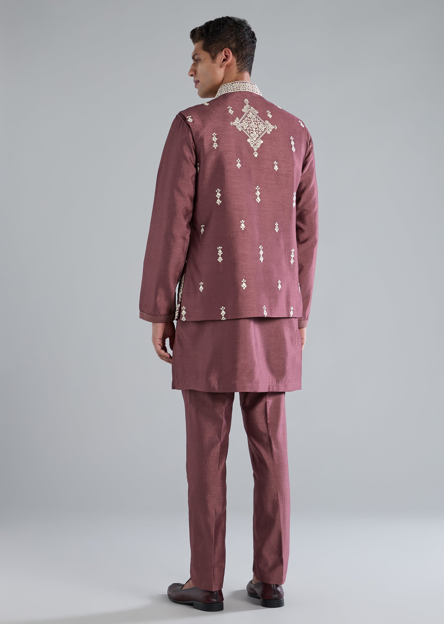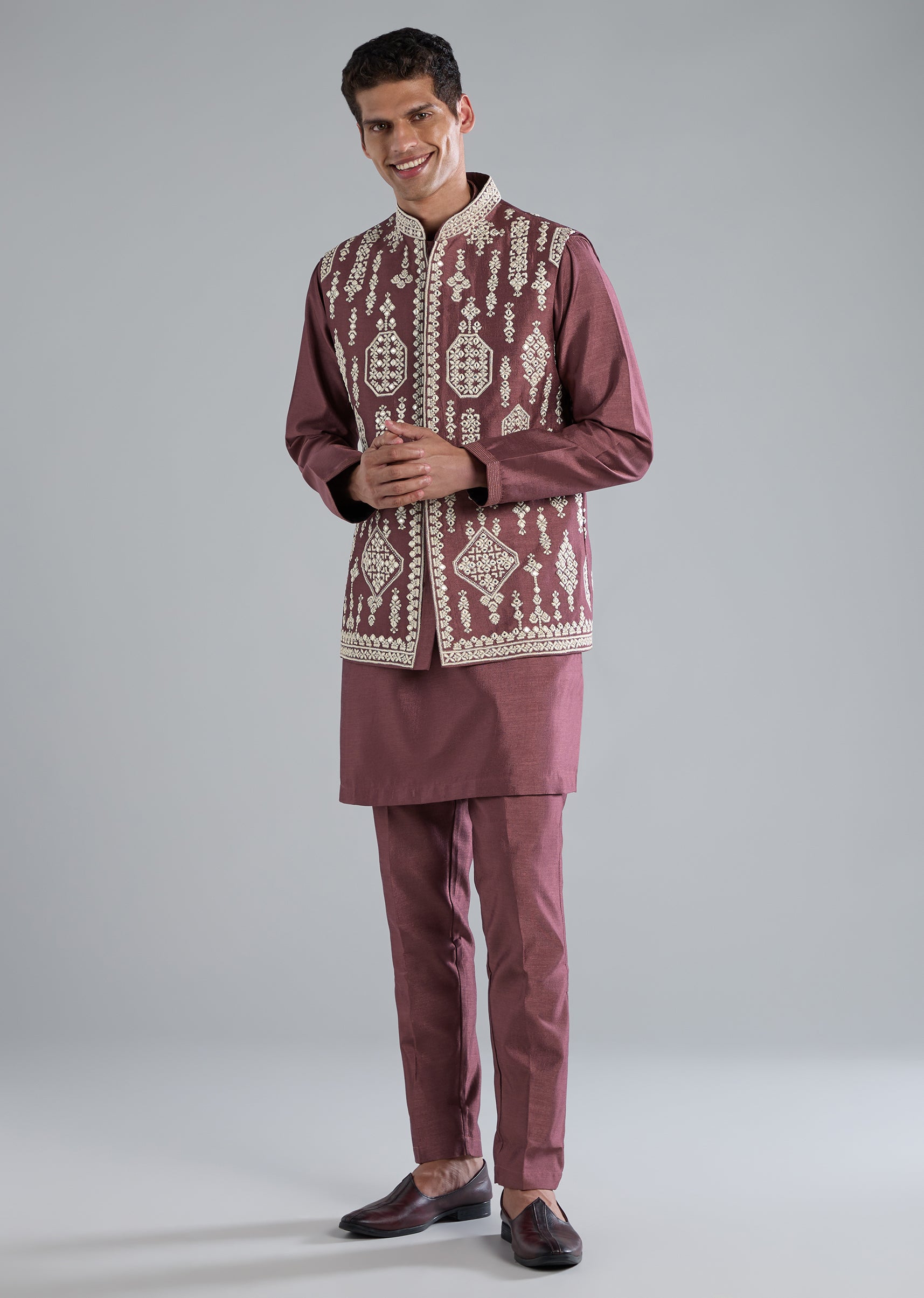 This wine kurta jacket set is crafted in rich silk and adorned with detailed thread resham and zari work, making it an elegant choice for sangeet, mehendi, and wedding celebrations. Designed with full sleeves and a classic mandarin collar, it features a front hook eye top closure and a matching hook eye bottom closure. The coordinated jacket, kurta, and pants come together to create a luxurious festive ensemble with timeless appeal. Awarded as the Most Trusted Brand, we're delivering styles you love, just as promised.