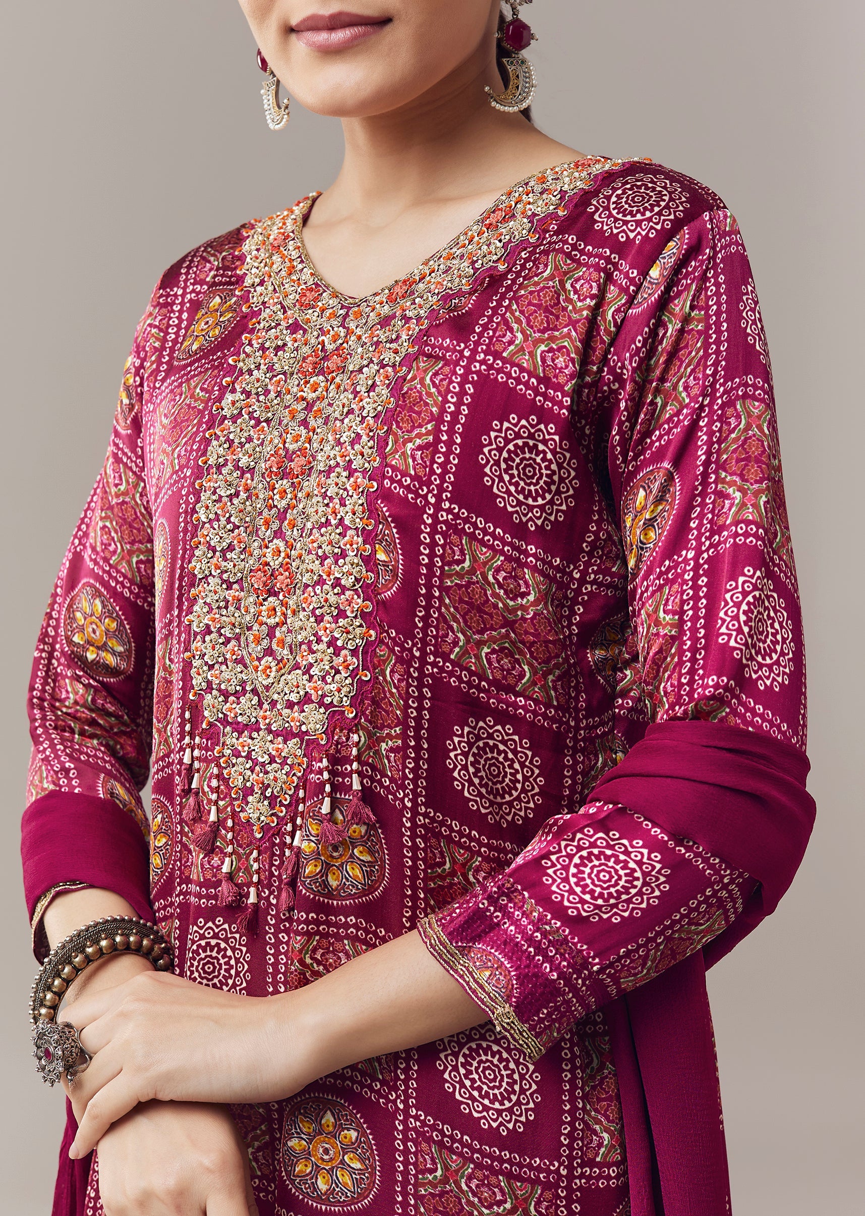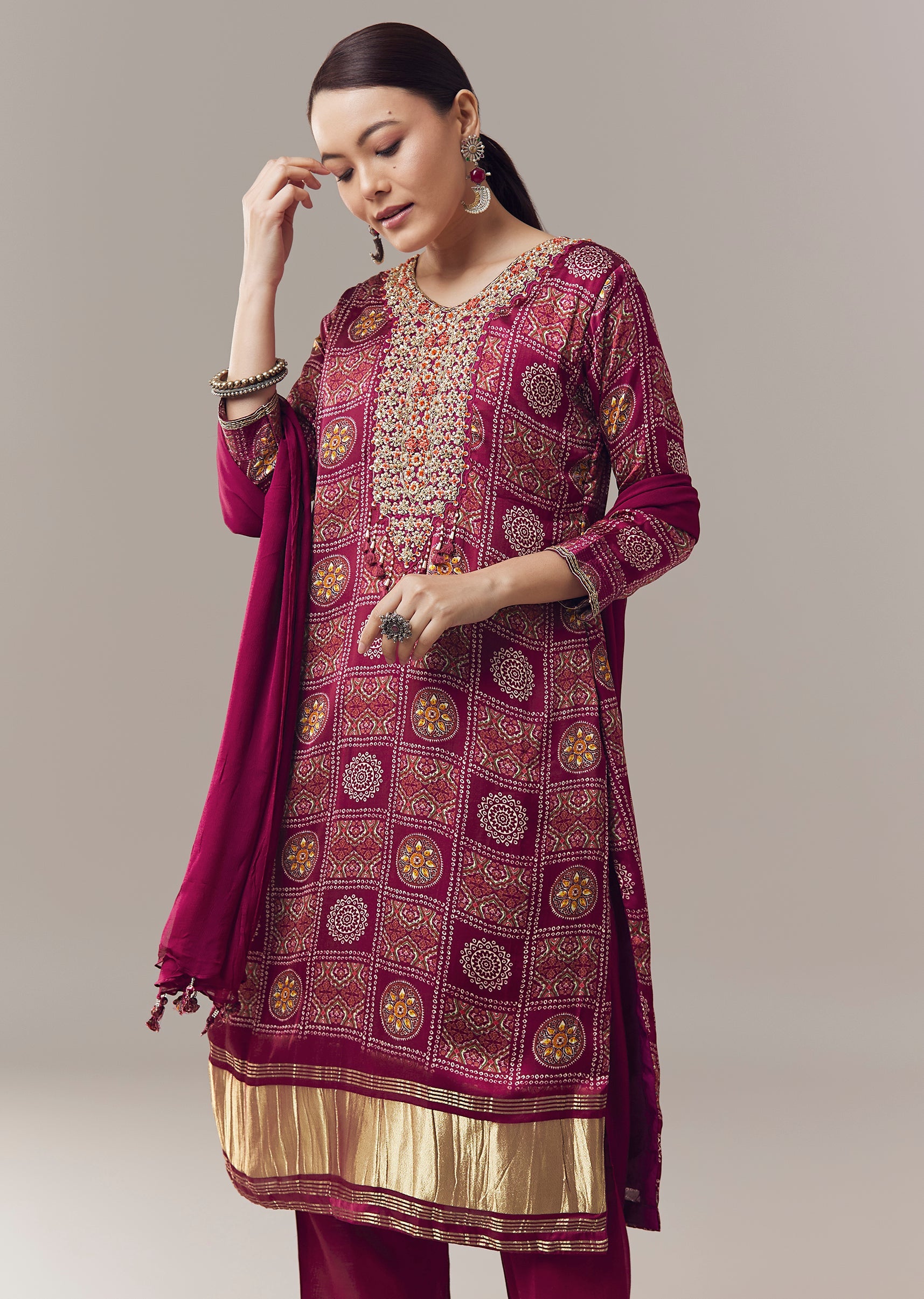 Wine Kurta Set In Bandhani Print With Embroidered Neck And Dupatta