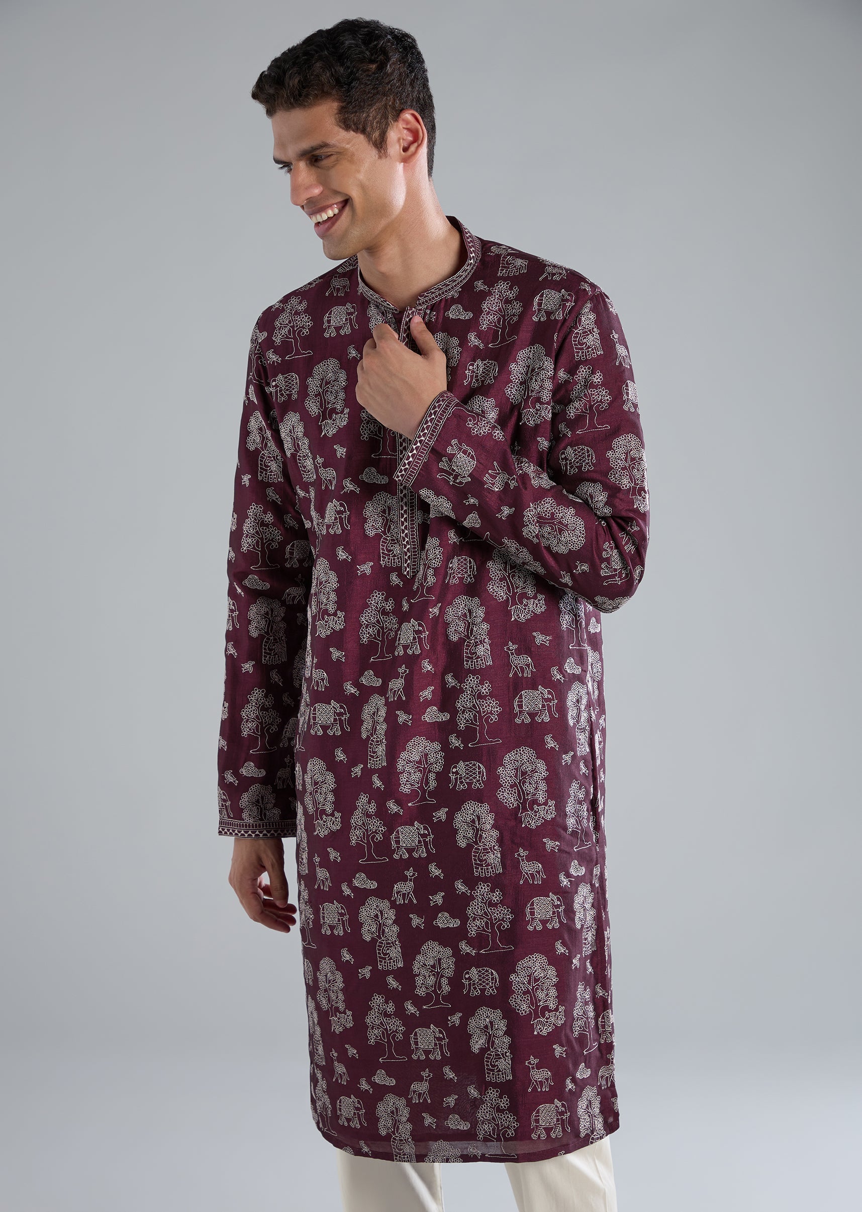 Rich and refined, this wine kurta set is crafted in smooth silk fabric and finished with subtle thread and resham detailing. The mandarin collar and full sleeves lend a classic structure, while the front hook eye closure keeps the look clean and polished. Paired with comfortable drawstring pants, this set is perfect for evening festivities, intimate celebrations, or family gatherings. Slight variation in color is possible due to photography. Awarded as the Most Trusted Brand, we're delivering styles you love, just as promised.