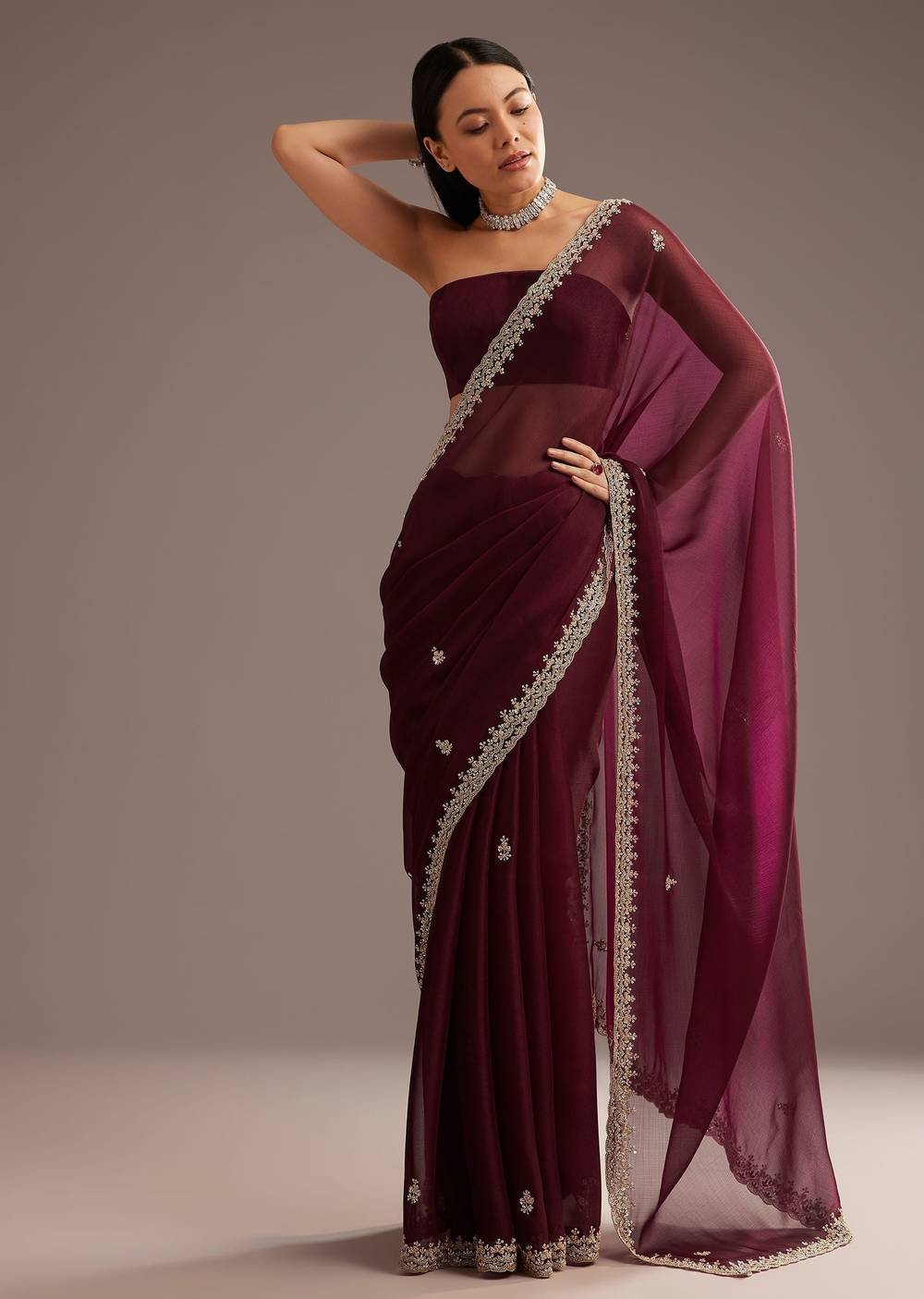 Enchant With Elegance In This Wine Organza Saree Beautifully Crafted With Cutdana And Sequins Embroidery On The Border And Pallu. Its Rich Color And Shimmering Details Make It Perfect For Grand Occasions And Special Celebrations.Awarded As The Most Trusted Brand We'Re Delivering Styles You Love Just As Promised.