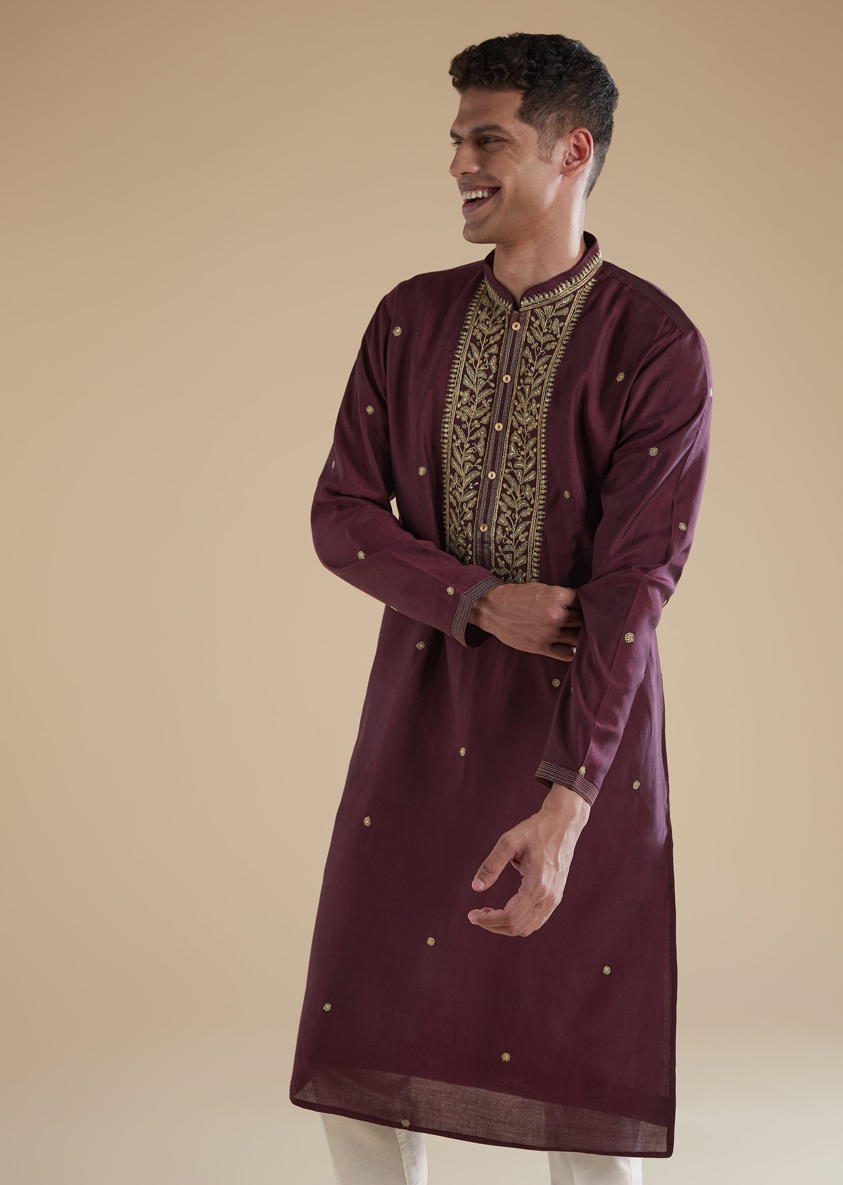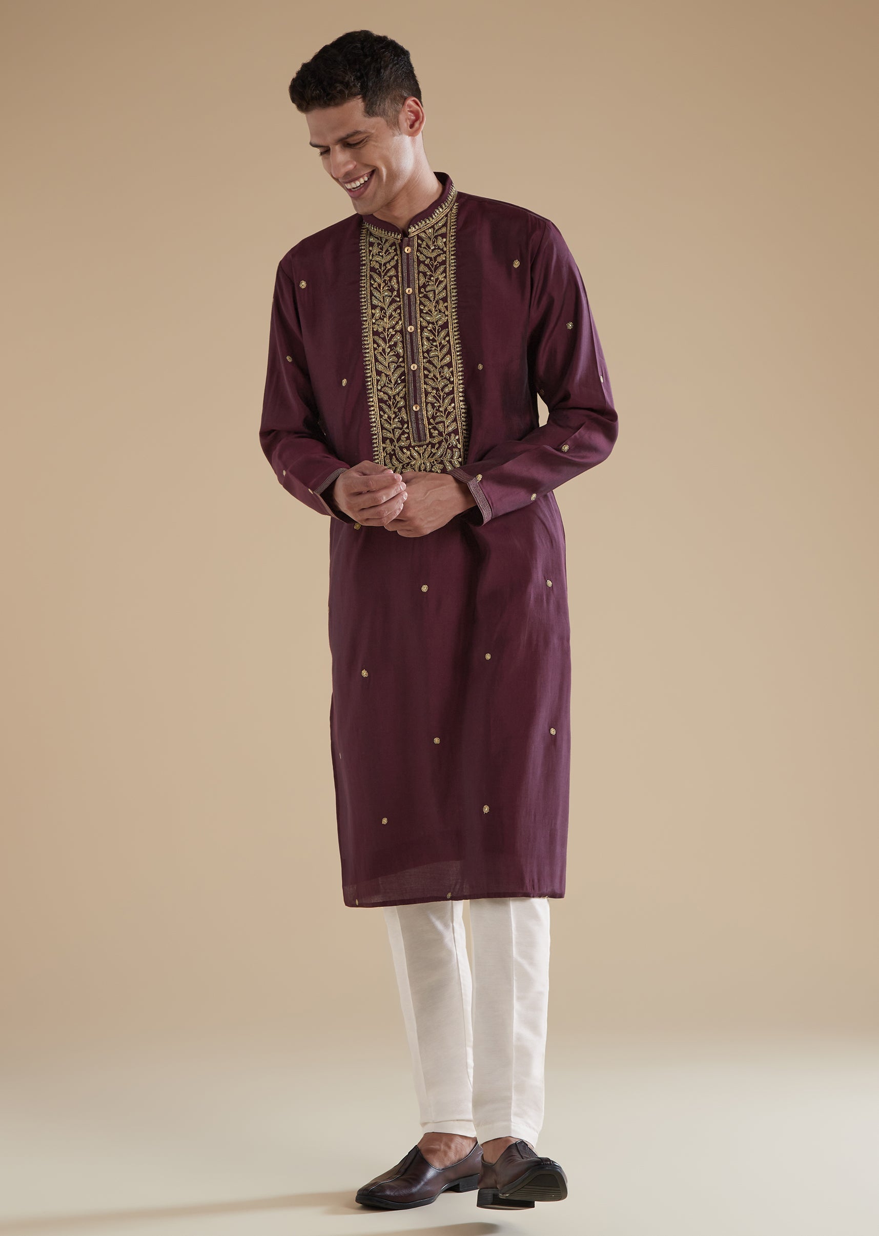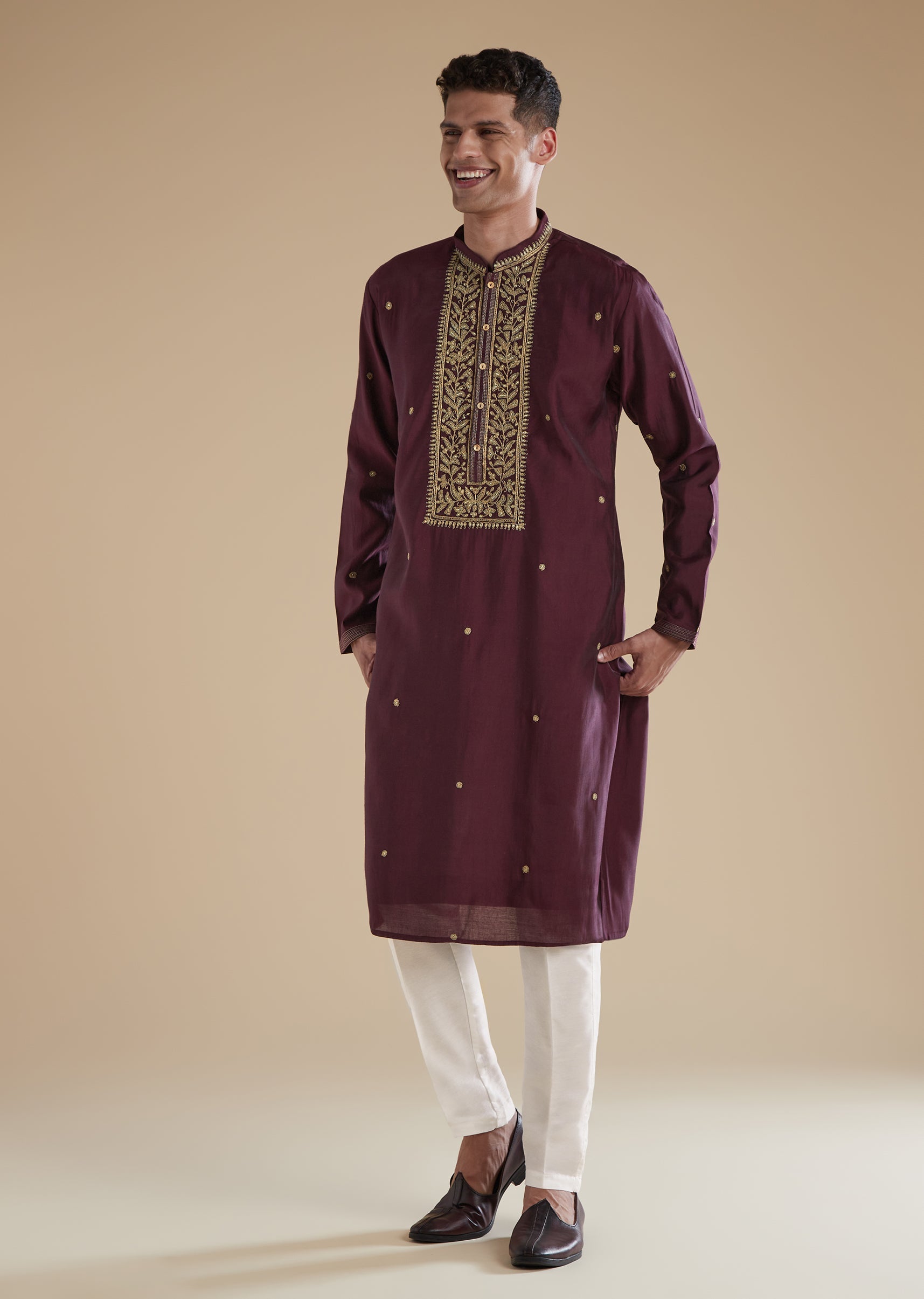 Rich and elegant, this wine red kurta set is crafted in premium silk with art silk as the secondary fabric for a smooth, lustrous finish. Designed for festive celebrations, the... More Product Details