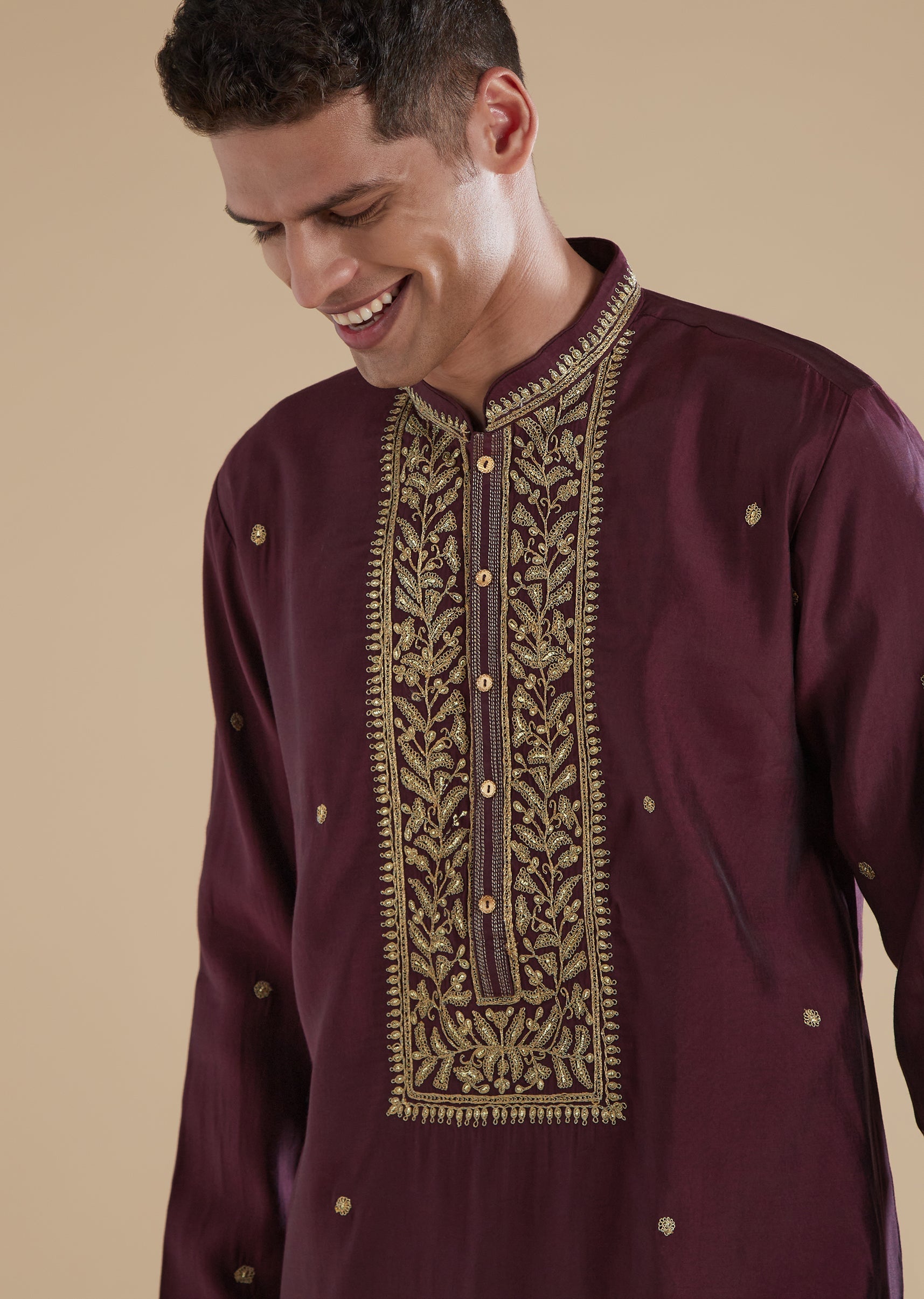 Rich and elegant, this wine red kurta set is crafted in premium silk with art silk as the secondary fabric for a smooth, lustrous finish. Designed for festive celebrations, the kurta features delicate thread and resham detailing that adds refined traditional charm. Styled with a mandarin collar, full sleeves, and clean front button closures on both the kurta and the coordinating pants, the ensemble offers a polished and sophisticated silhouette perfect for evening festivities. Awarded as the Most Trusted Brand, we're delivering styles you love, just as promised.