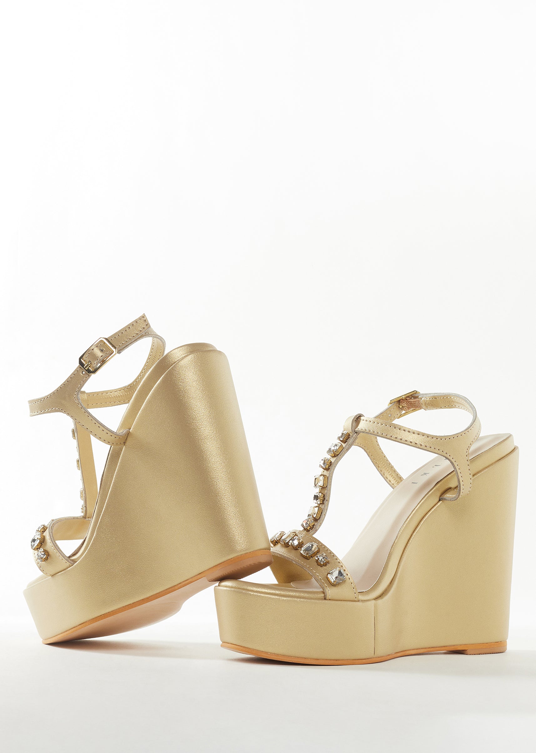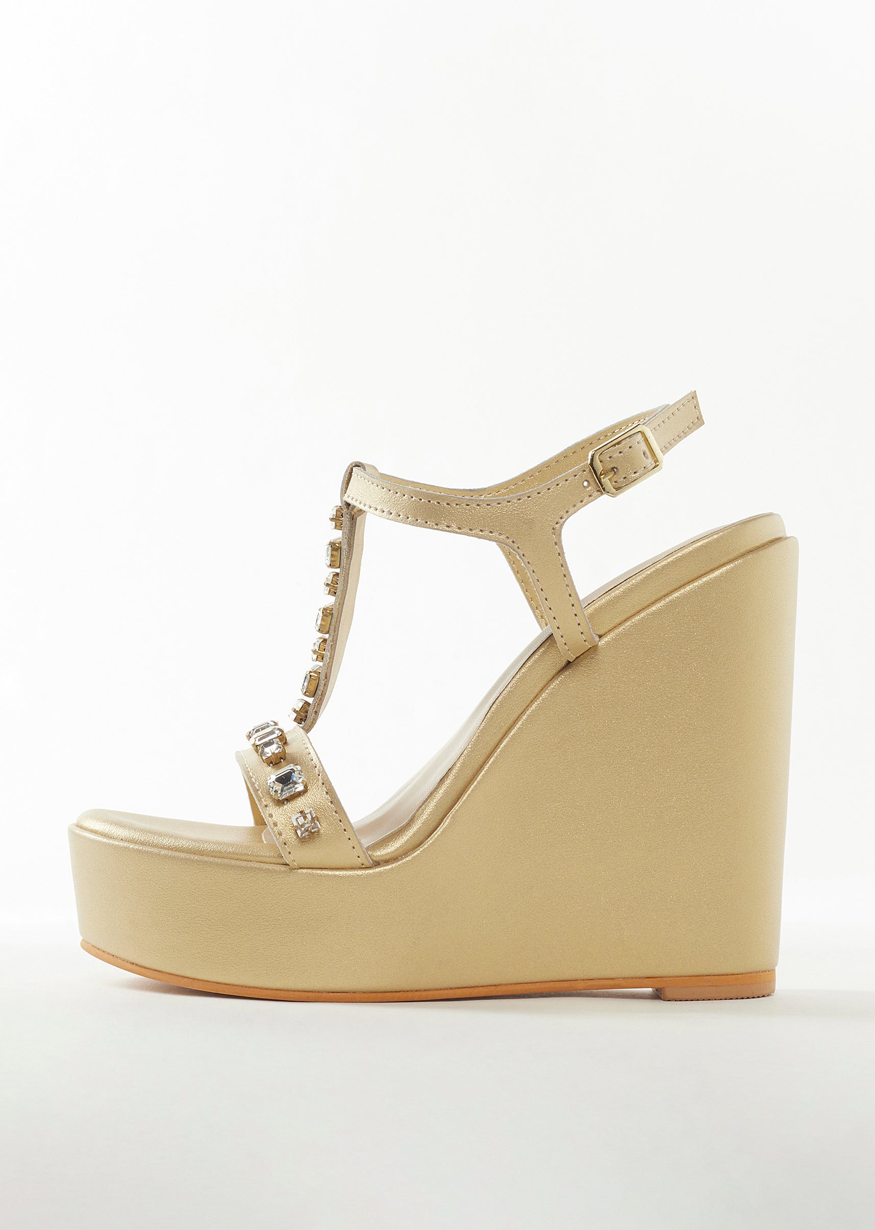 Elegant and radiant, these gold footwear pieces are crafted in smooth faux leather with delicate embellished detailing that brings a soft festive sparkle. The tabletop face silhouette ensures easy slip... More Product Details