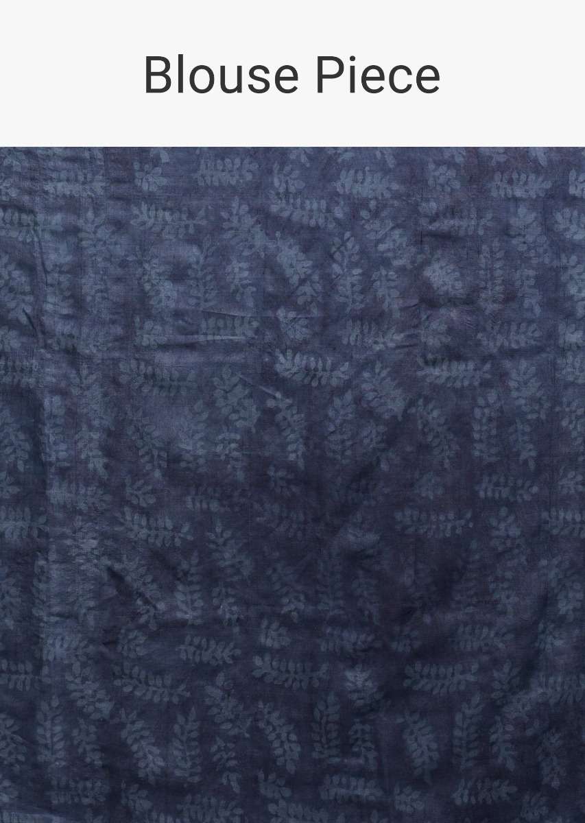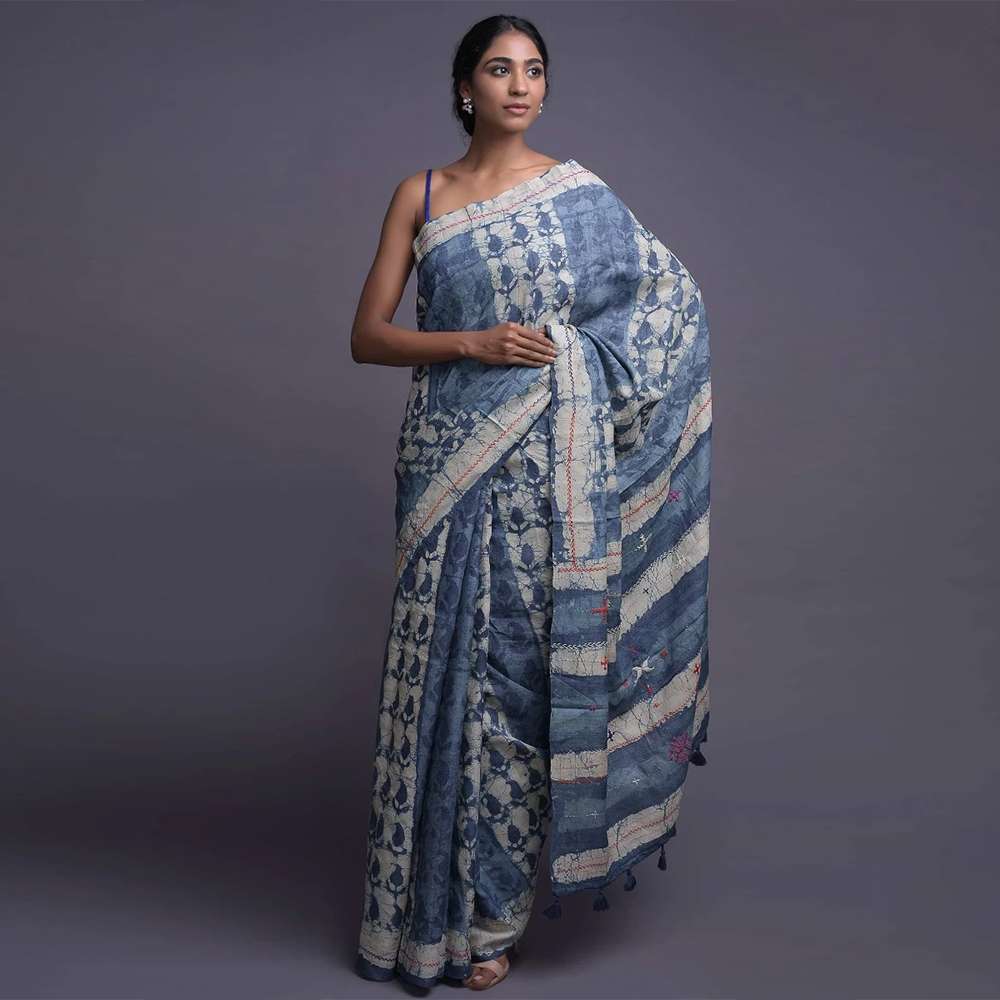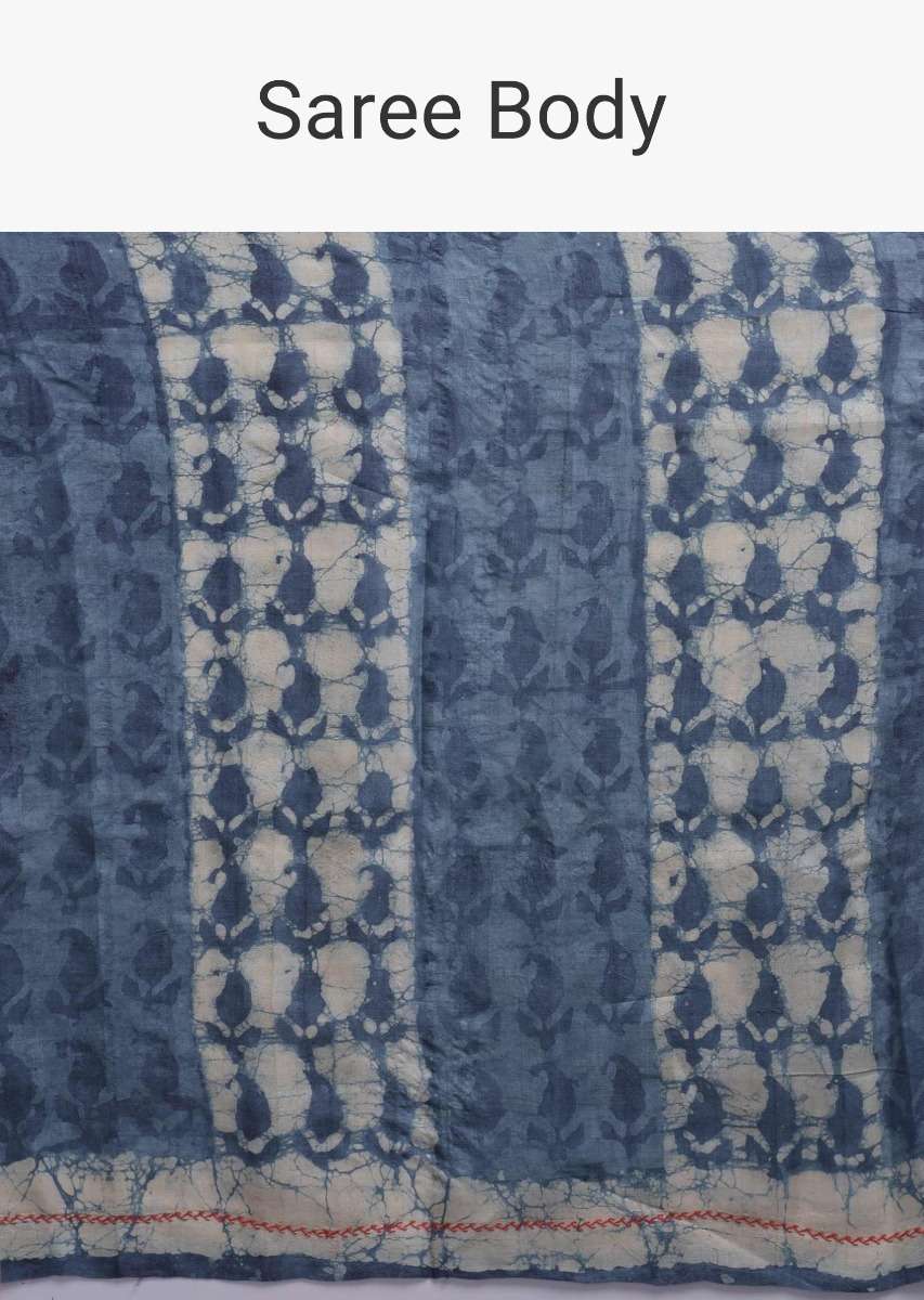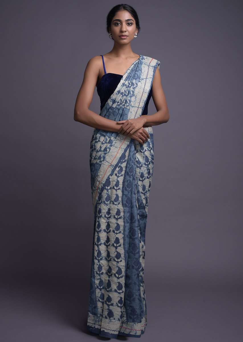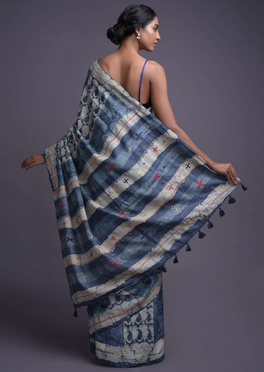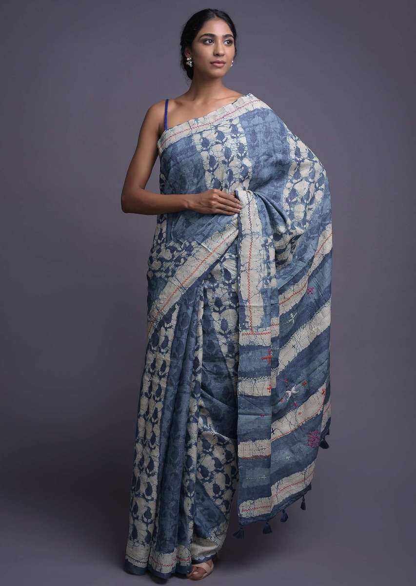 Yale Blue Saree In Tussar Silk With Batik Print And Hand Embroidered Thread Work Online - Kalki Fashion