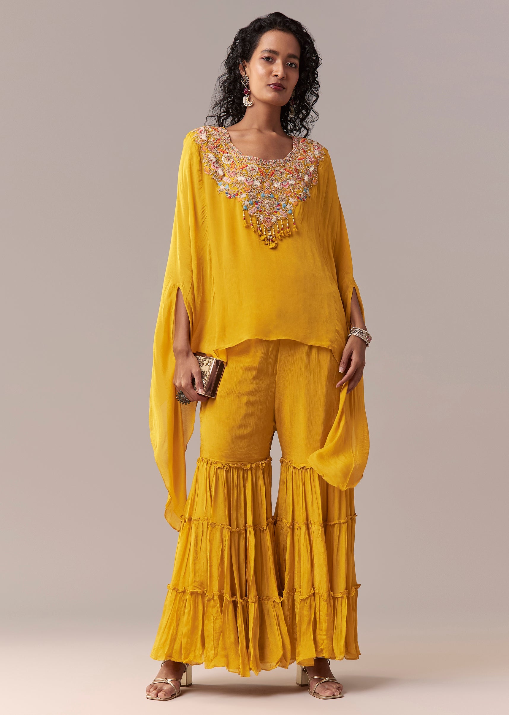 Yellow Asymmetric Sharara Cape Set