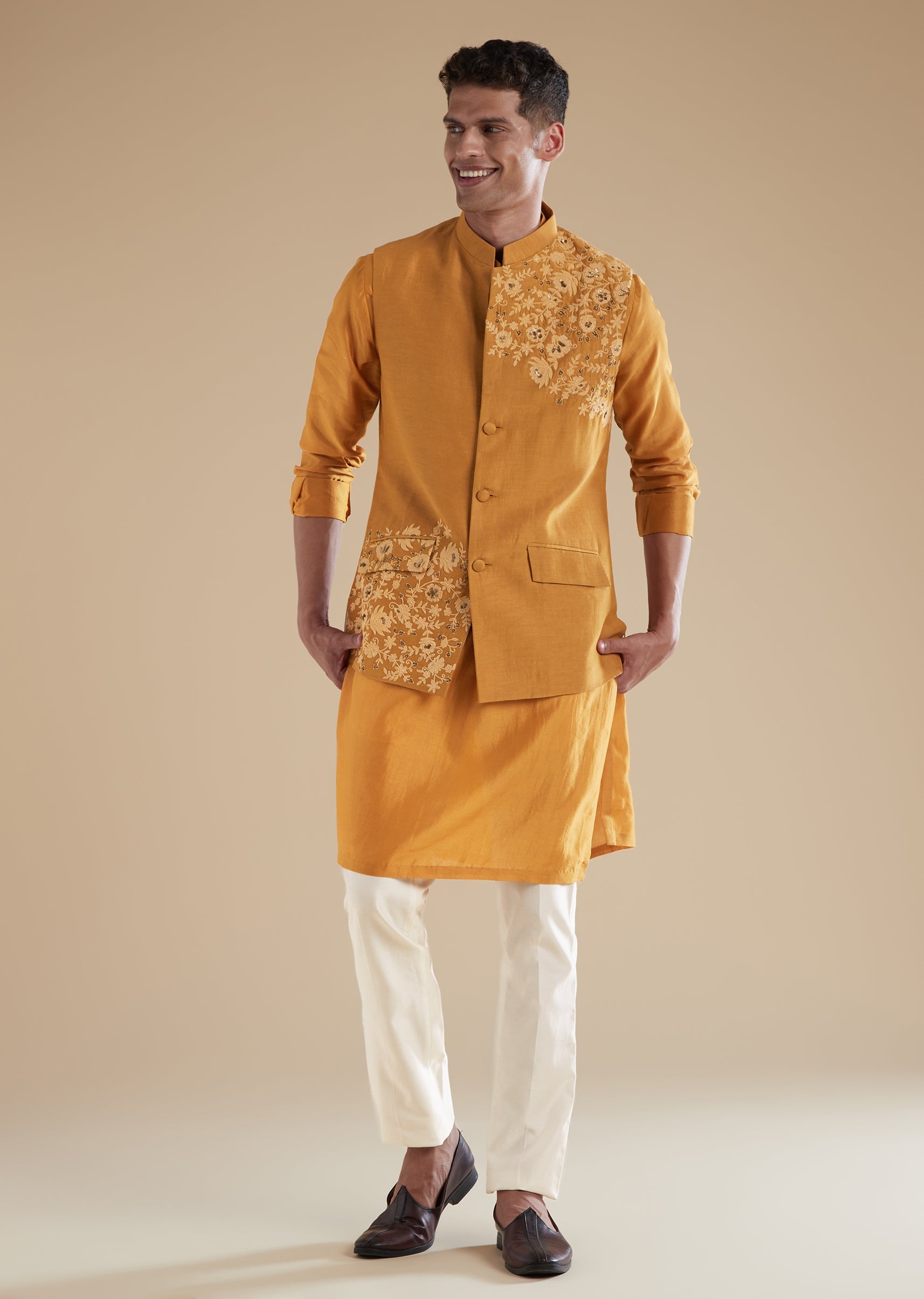 Bright and celebratory, this mustard yellow kurta jacket set is crafted in fine chanderi fabric that lends a soft sheen ideal for haldi and mehendi functions. Designed for grooms fathers... More Product Details