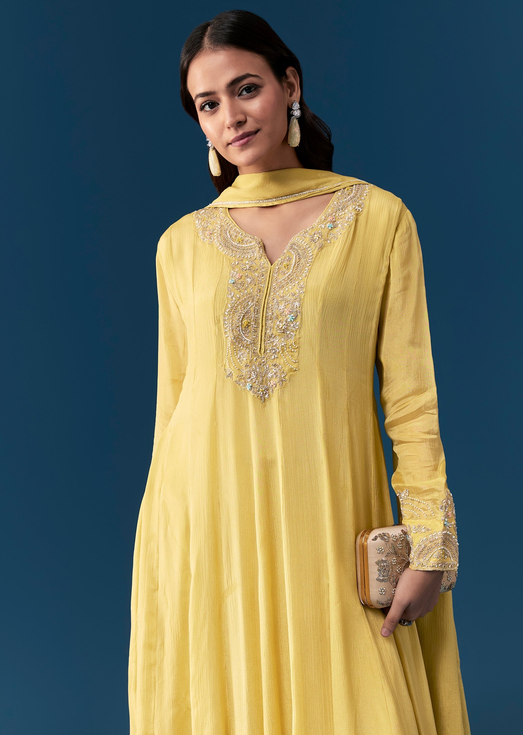 Step into sunny elegance with this pastel yellow anarkali set in a graceful A line silhouette. Crafted from soft chinon fabric, the anarkali features delicate moti and cut dana embroidery... More Product Details