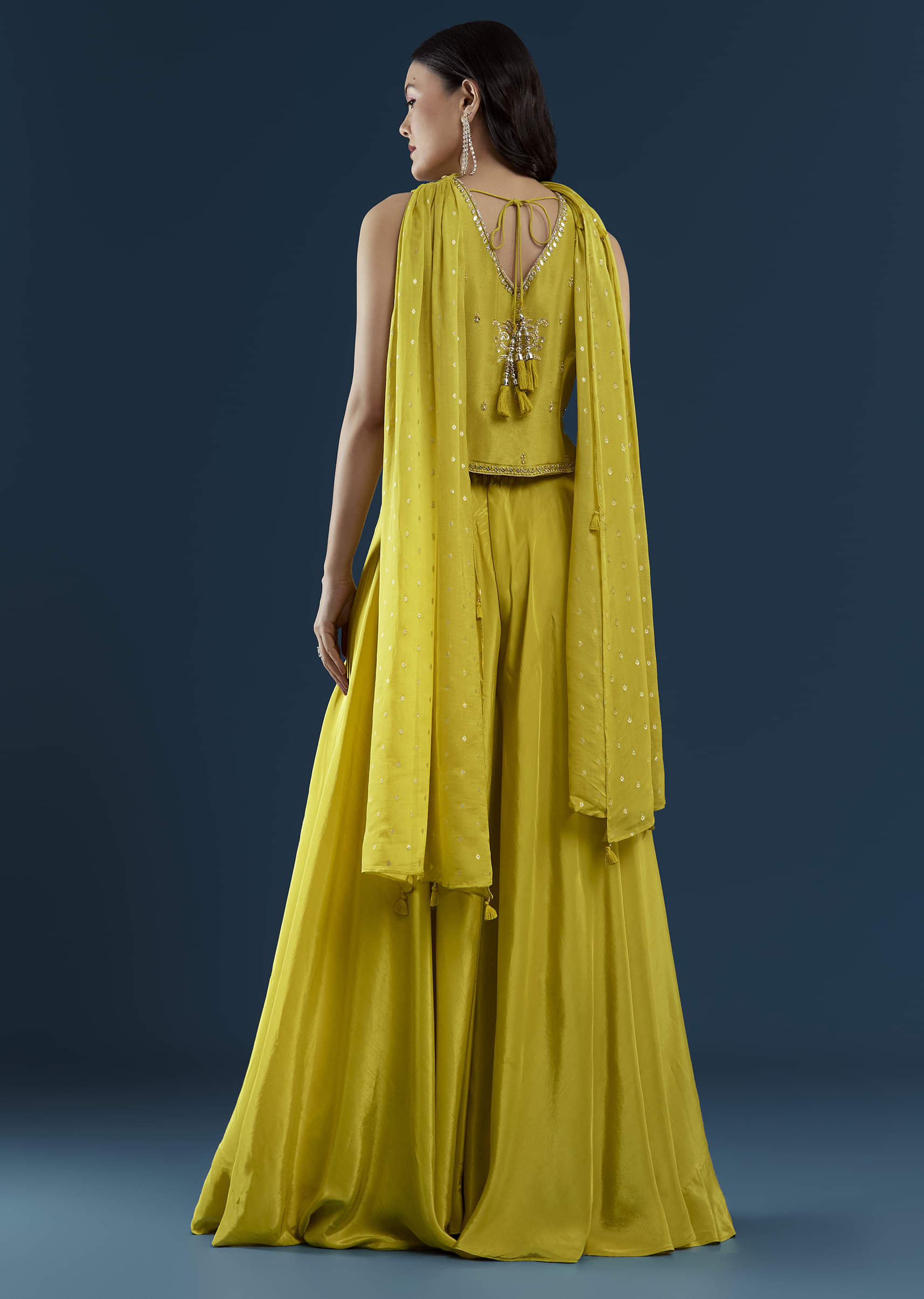 Blending festive vibrance with modern charm, the yellow crop top and palazzo set is a celebration of effortless elegance. The crop top is adorned with intricate gotta and moti work,... More Product Details