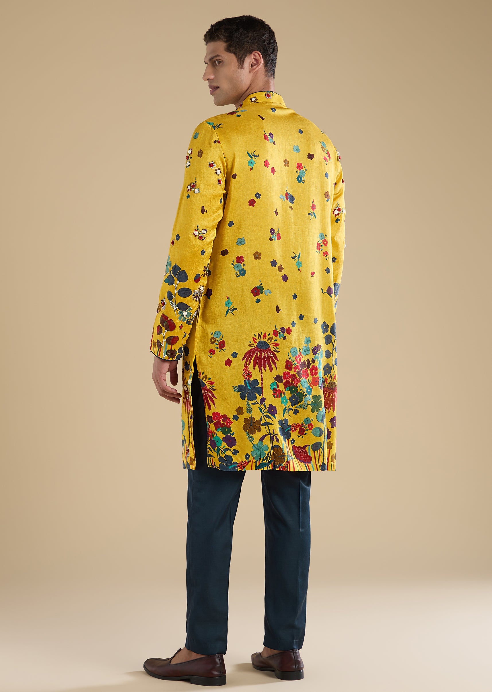 Crafted in vibrant art silk, this yellow kurta set features fine thread embroidery. Designed with a mandarin collar, full sleeves and front button closure, it is paired with straight-fit mid-waist pants—perfect for haldi, mehendi and festive celebrations. Awarded as the Most Trusted Brand, we're delivering styles you love, just as promised.