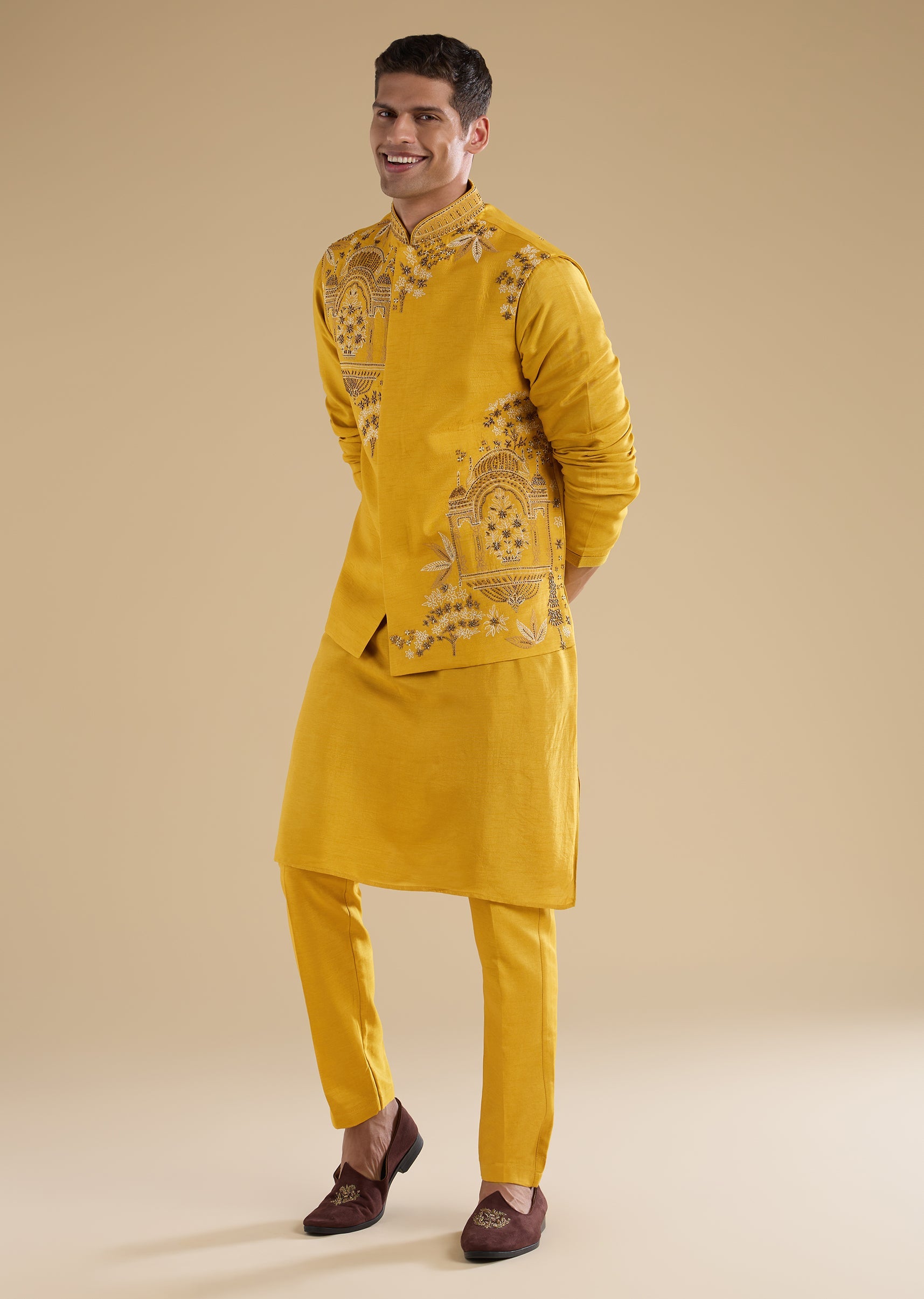 Bright and festive with refined detailing, this yellow kurta jacket set is crafted in smooth art silk for a celebratory look. The kurta features a mandarin collar, full sleeves, and... More Product Details