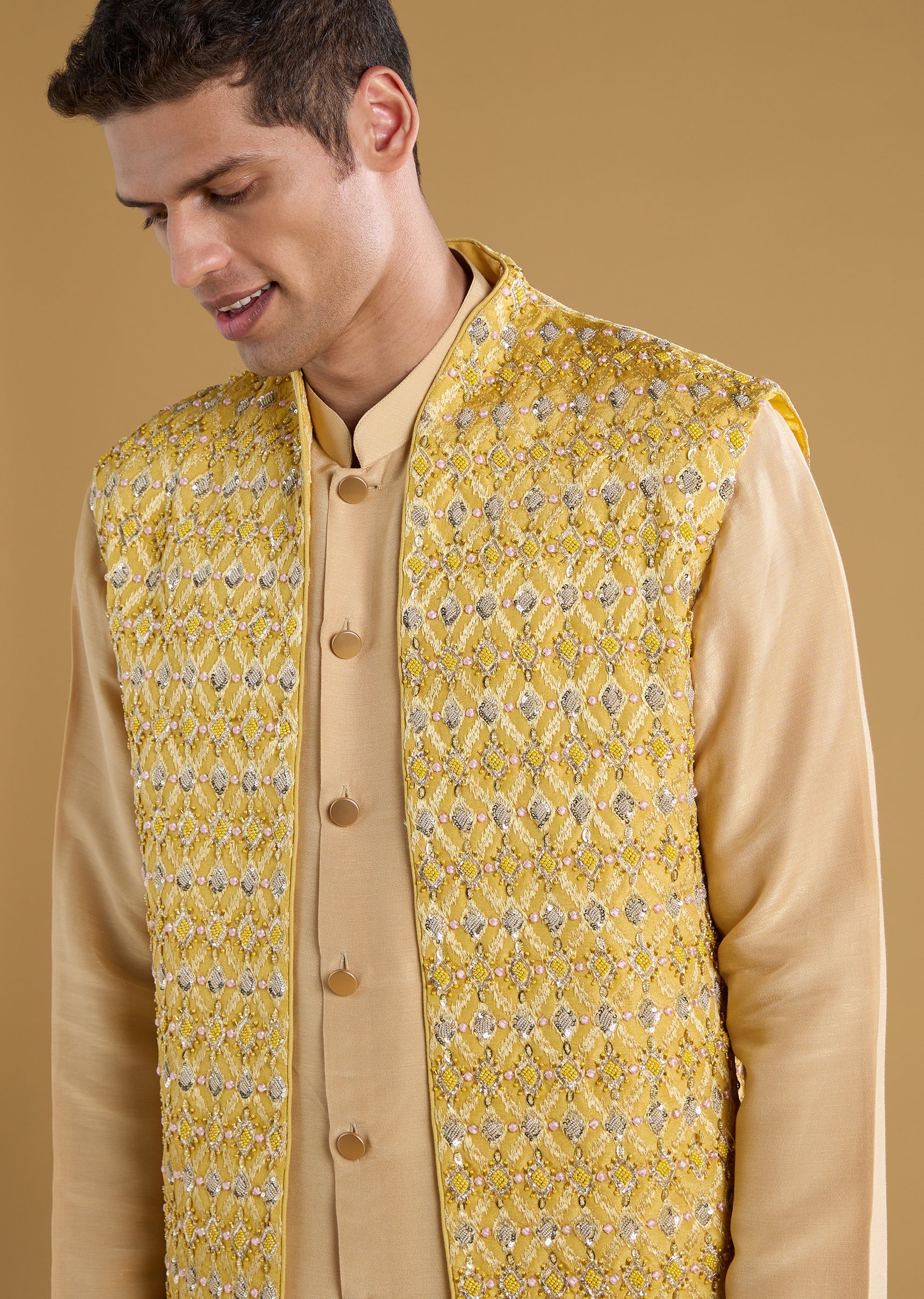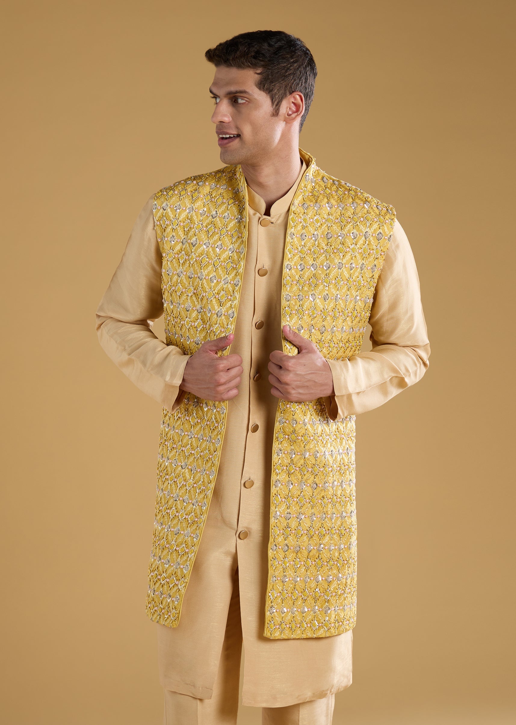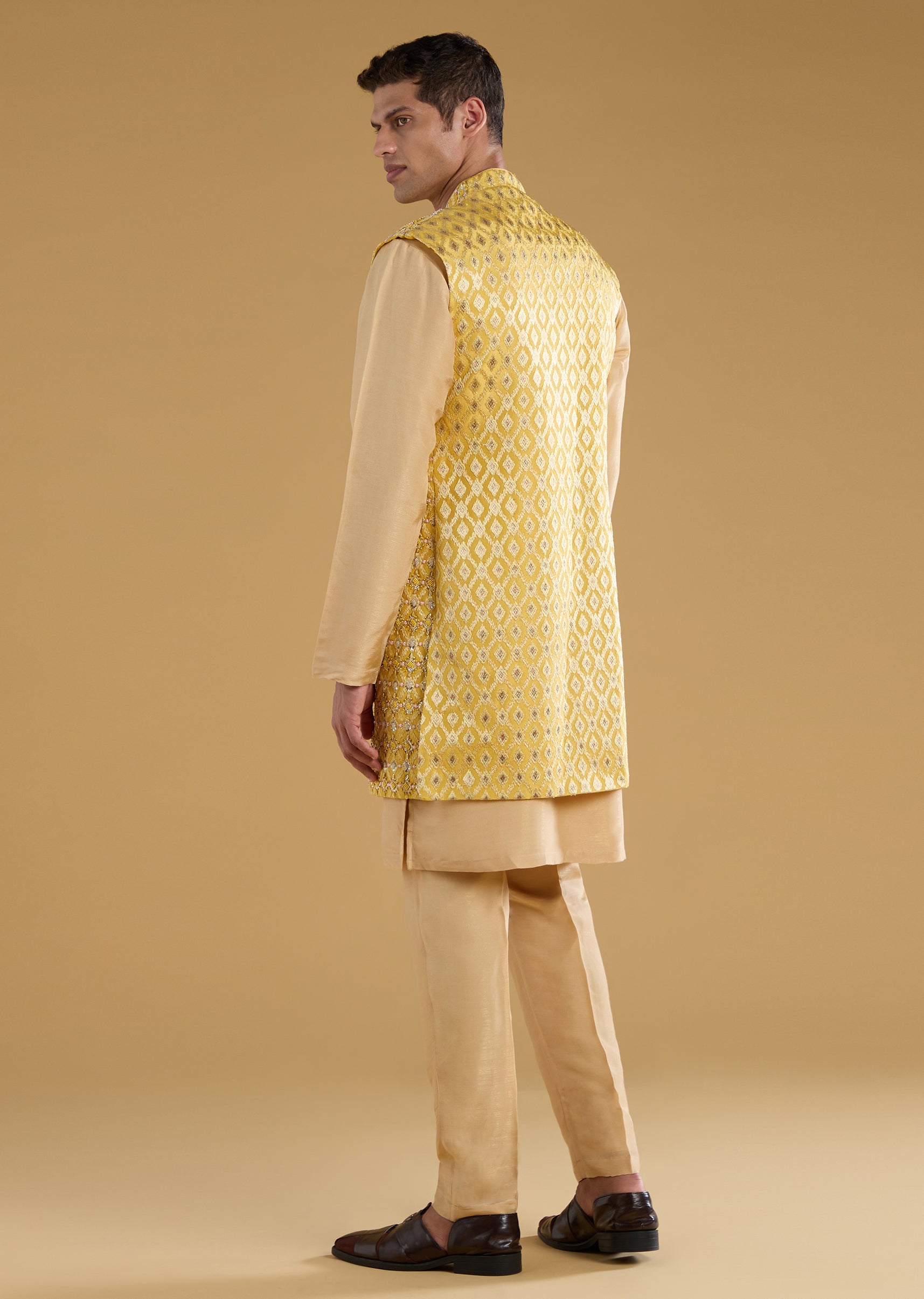 Yellow Jacquard Embroidered Jacket and Kurta Set