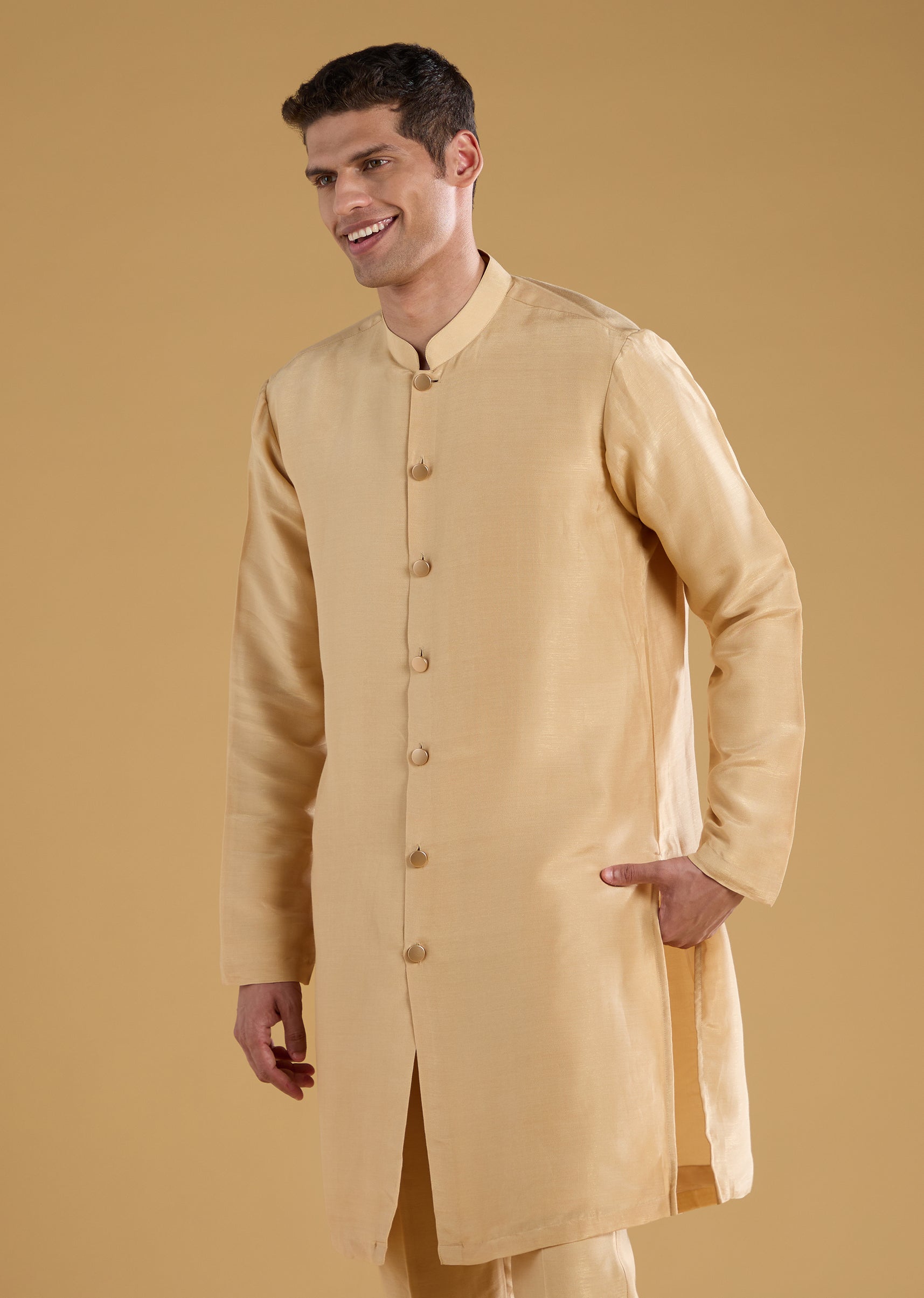 This jacquard jacket set brings a beautifully textured twist to traditional menswear, elevated with intricate resham work and delicate French knot detailing. The mandarin collar jacket pairs seamlessly with the classic kurta and tailored pants, creating a polished and sophisticated ensemble. Ideal for weddings, receptions, sangeet nights, or festive celebrations, it strikes the perfect balance between regal craftsmanship and contemporary charm. Awarded as the Most Trusted Brand, we're delivering styles you love, just as promised.