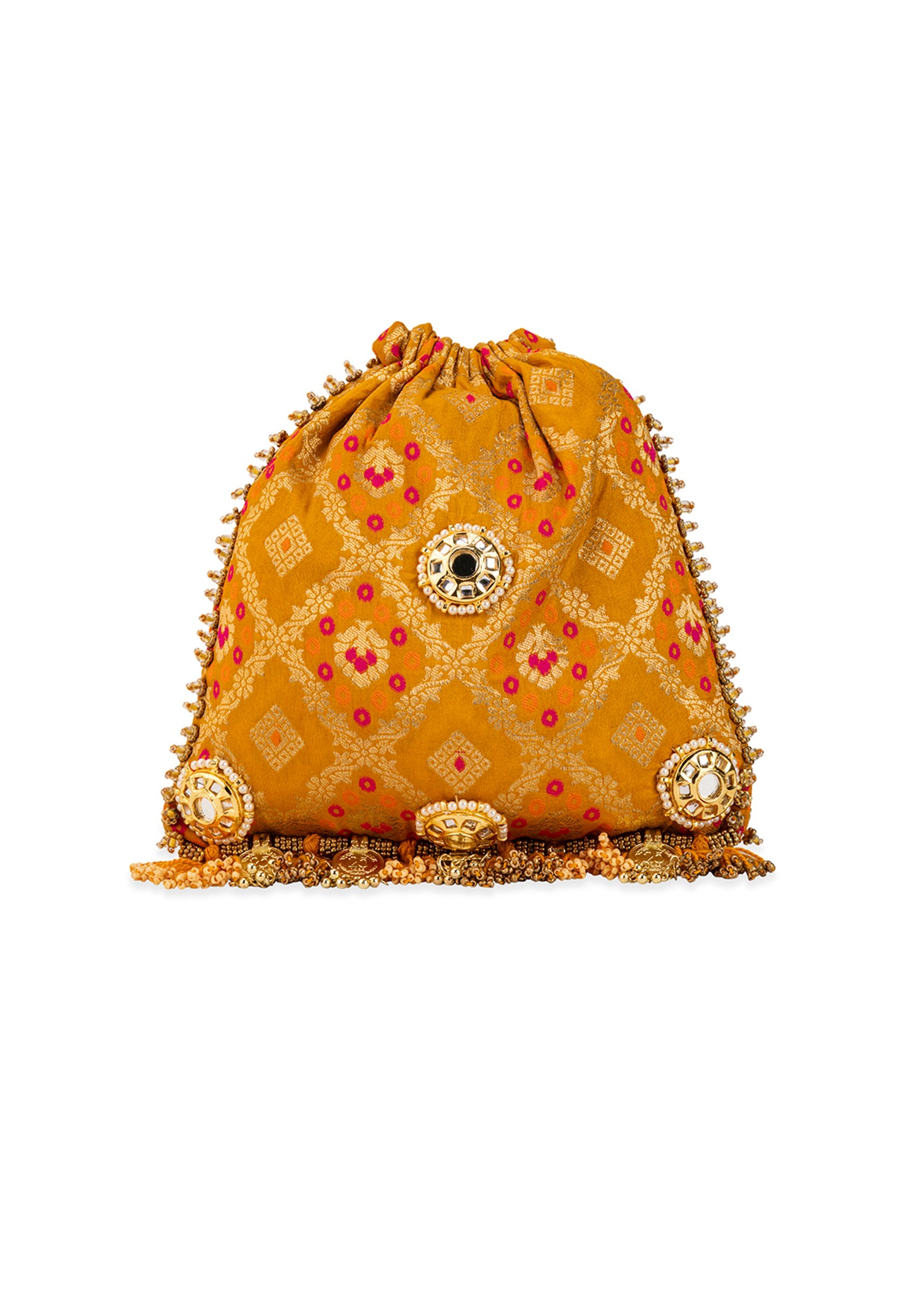 Yellow Mirror Embellished Silk Potli Bag