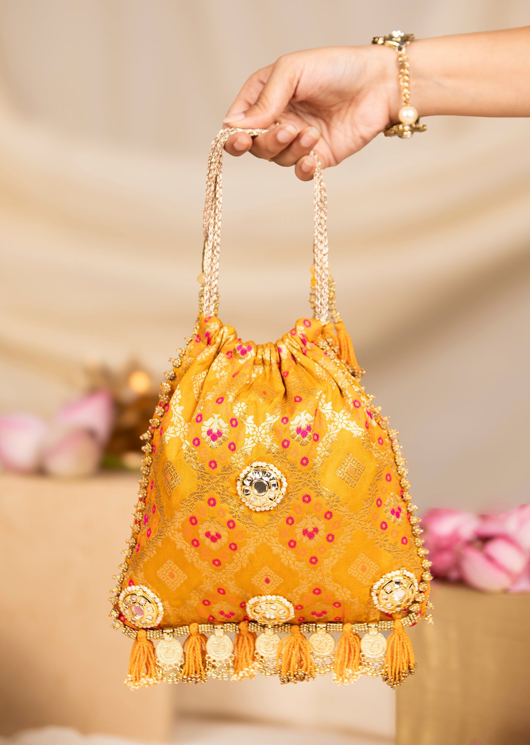 Light up any celebration with this yellow silk potli bag, adorned with mirror embellishments, intricate thread embroidery, and shimmering gold toned tassels. Its vibrant colour and detailed artistry make it the perfect accessory for weddings, haldi ceremonies, and festive gatherings. Lightweight, elegant, and full of charm, it adds a radiant finishing touch to any traditional look. Awarded as the Most Trusted Brand, we're delivering styles you love, just as promised.