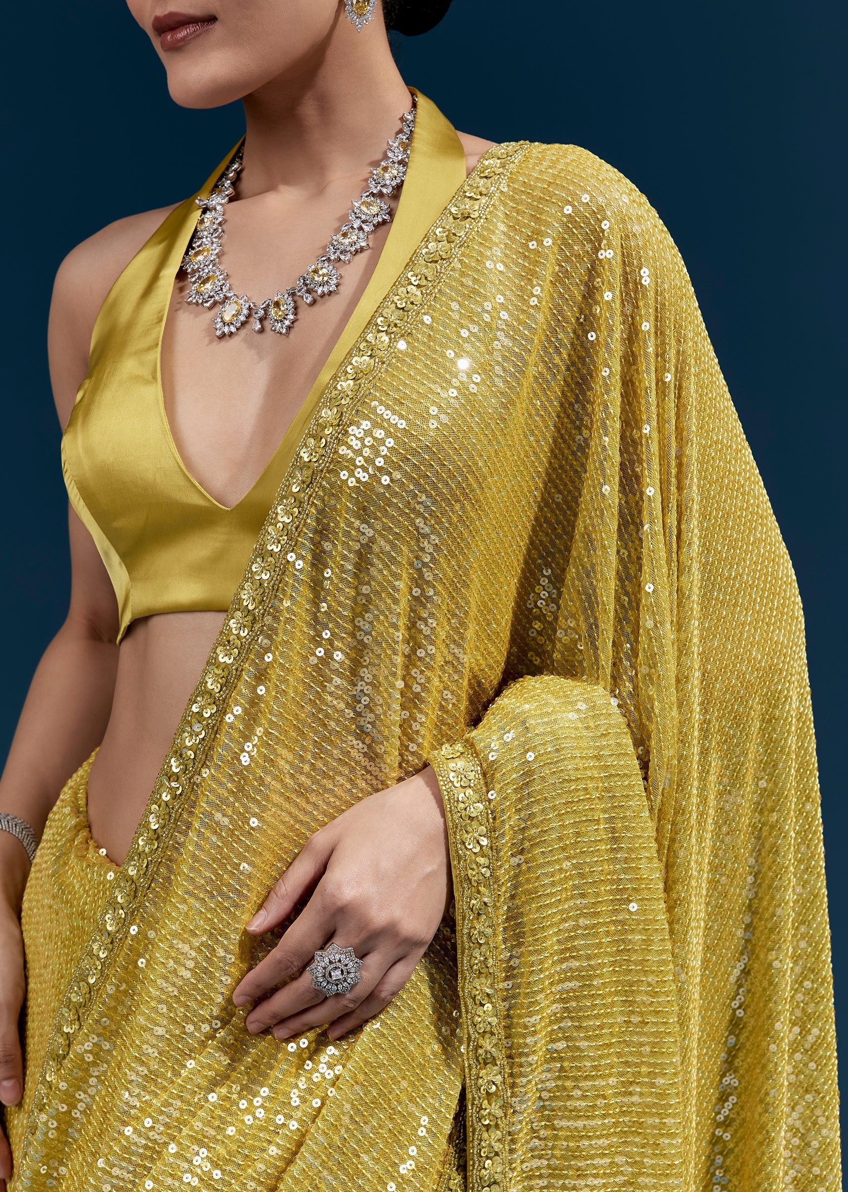 This yellow net saree features all-over sequin embroidery in a linear pattern for a sleek shimmer effect. Finished with a hand-embroidered floral border detailed with cutdana, sequins and beads, it’s ideal for party, cocktail and sangeet occasions. Awarded as the Most Trusted Brand, we're delivering styles you love, just as promised.