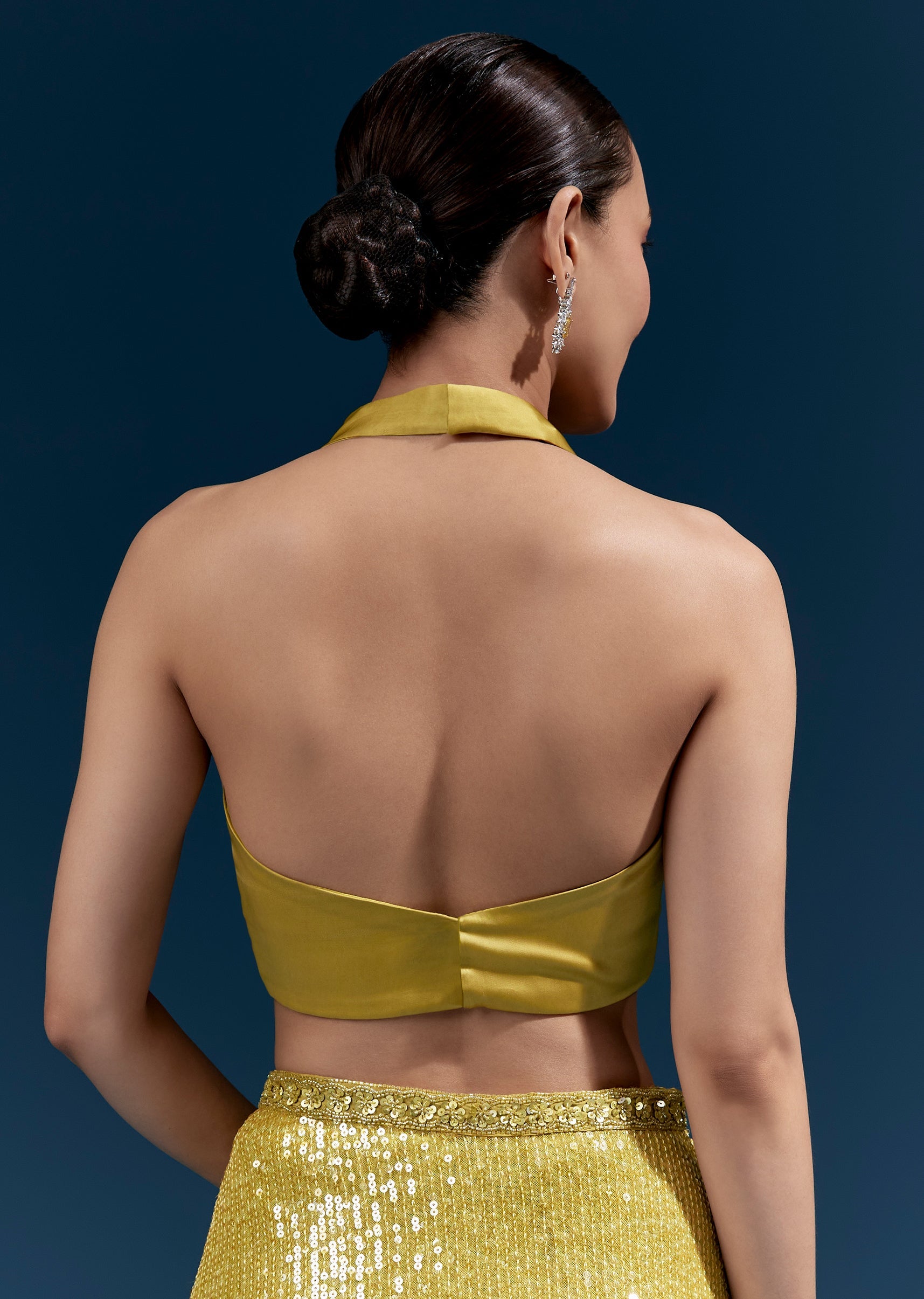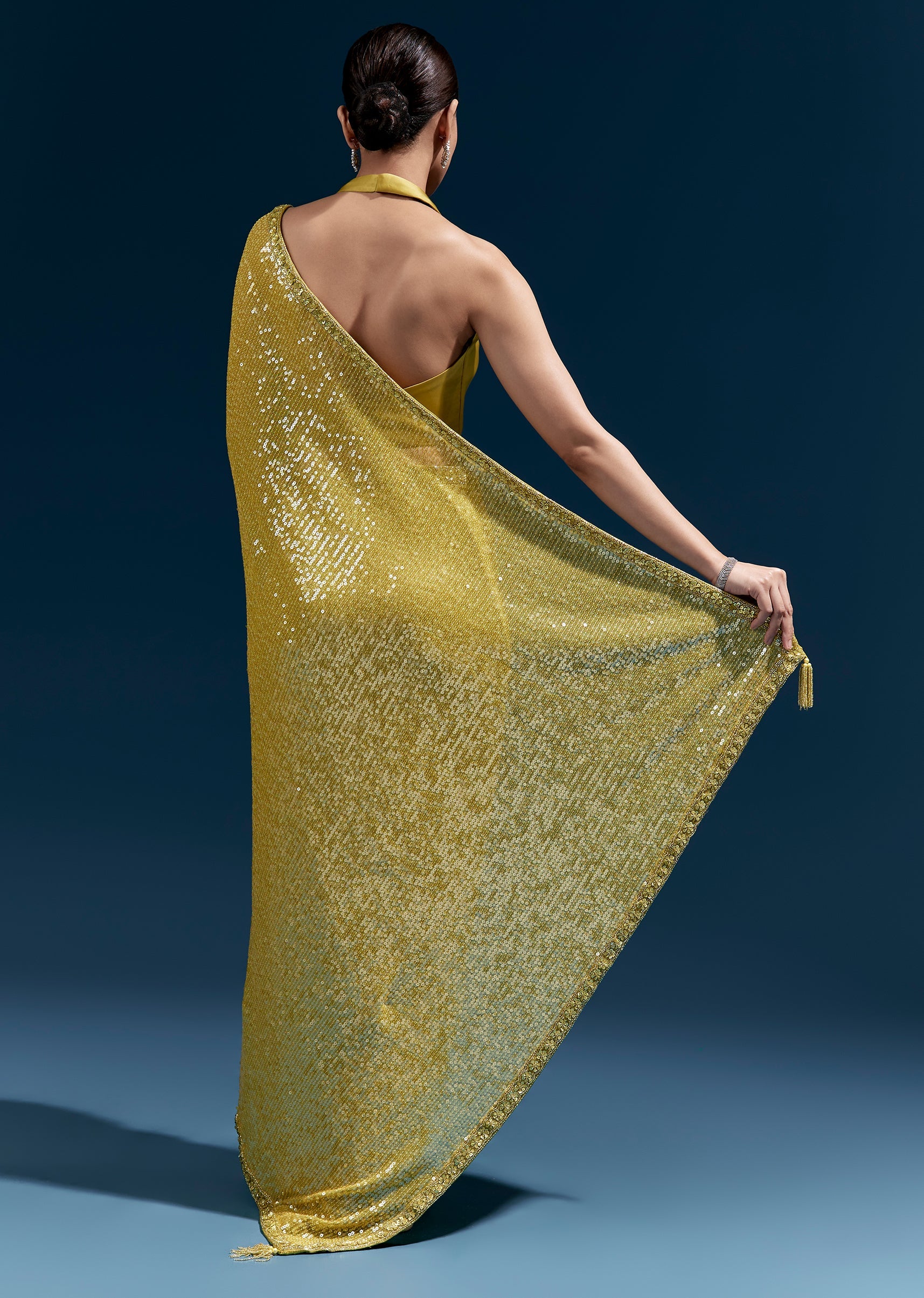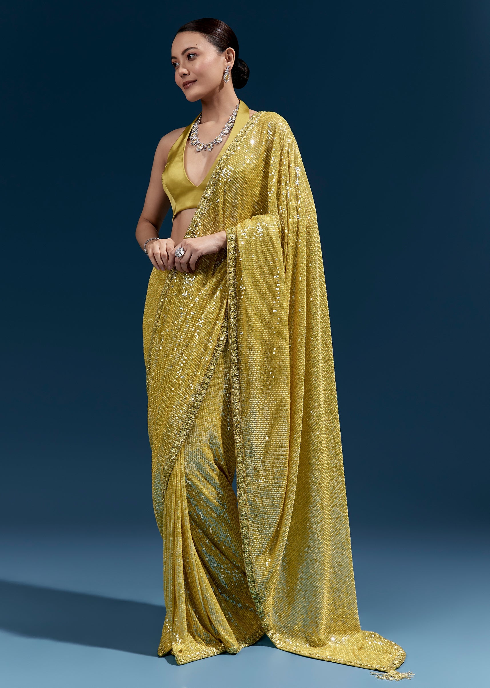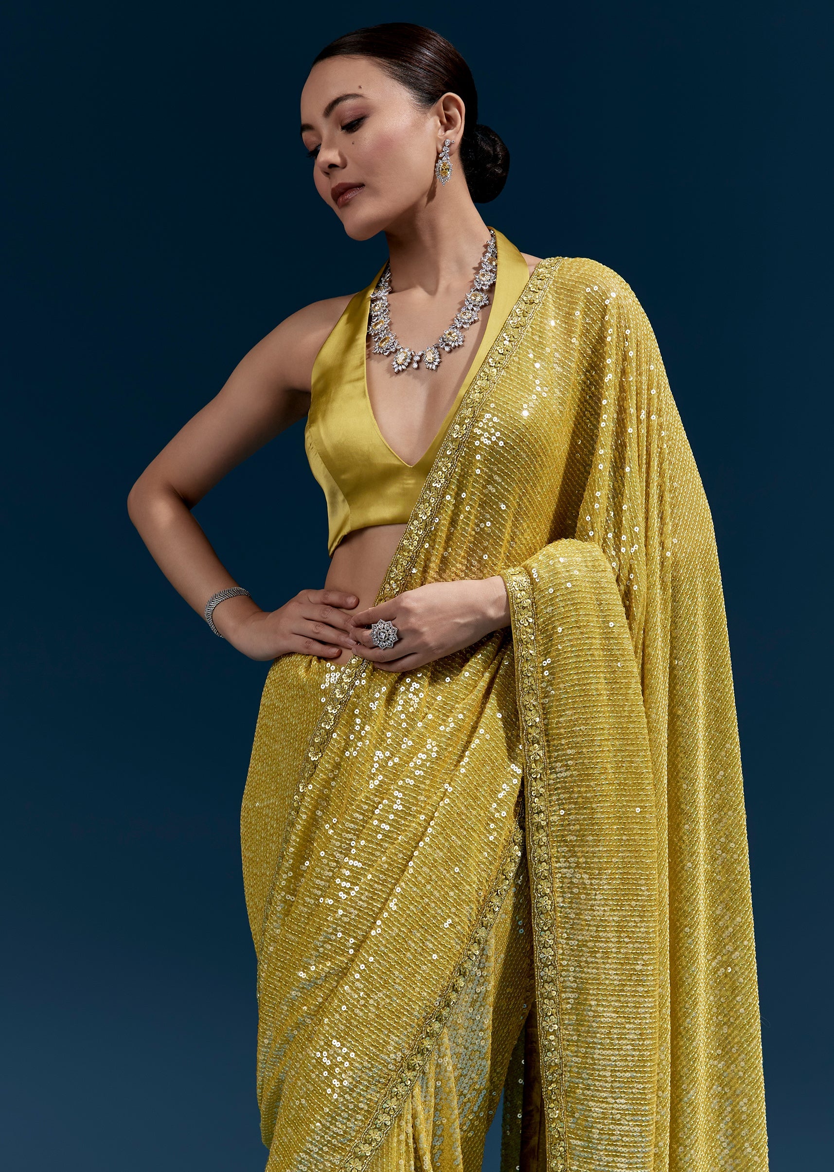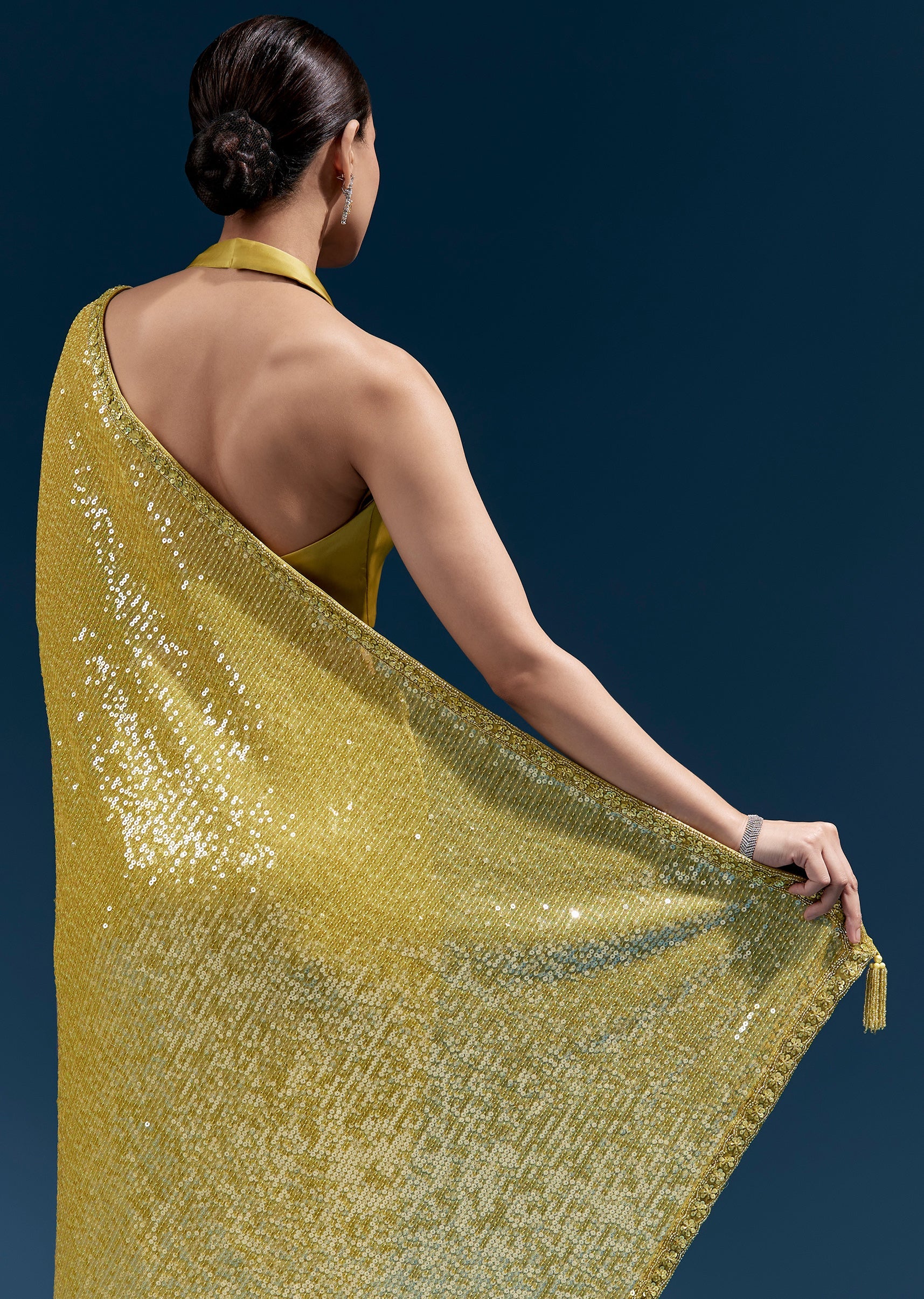 Fit Tips:Use pins along the pallu edge so the linear sequin pattern stays smooth and aligned.