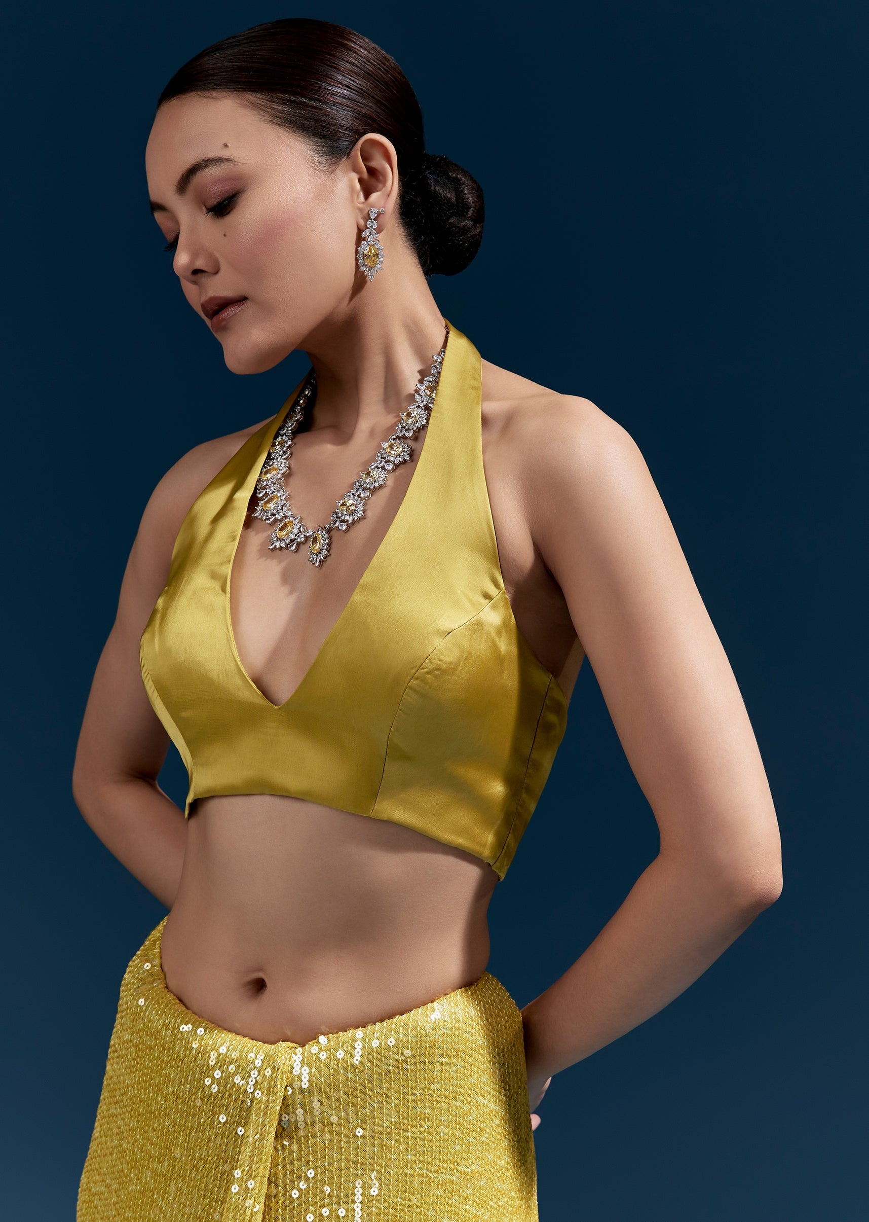 This yellow net saree features all-over sequin embroidery in a linear pattern for a sleek shimmer effect. Finished with a hand-embroidered floral border detailed with cutdana, sequins and beads, it’s... More Product Details