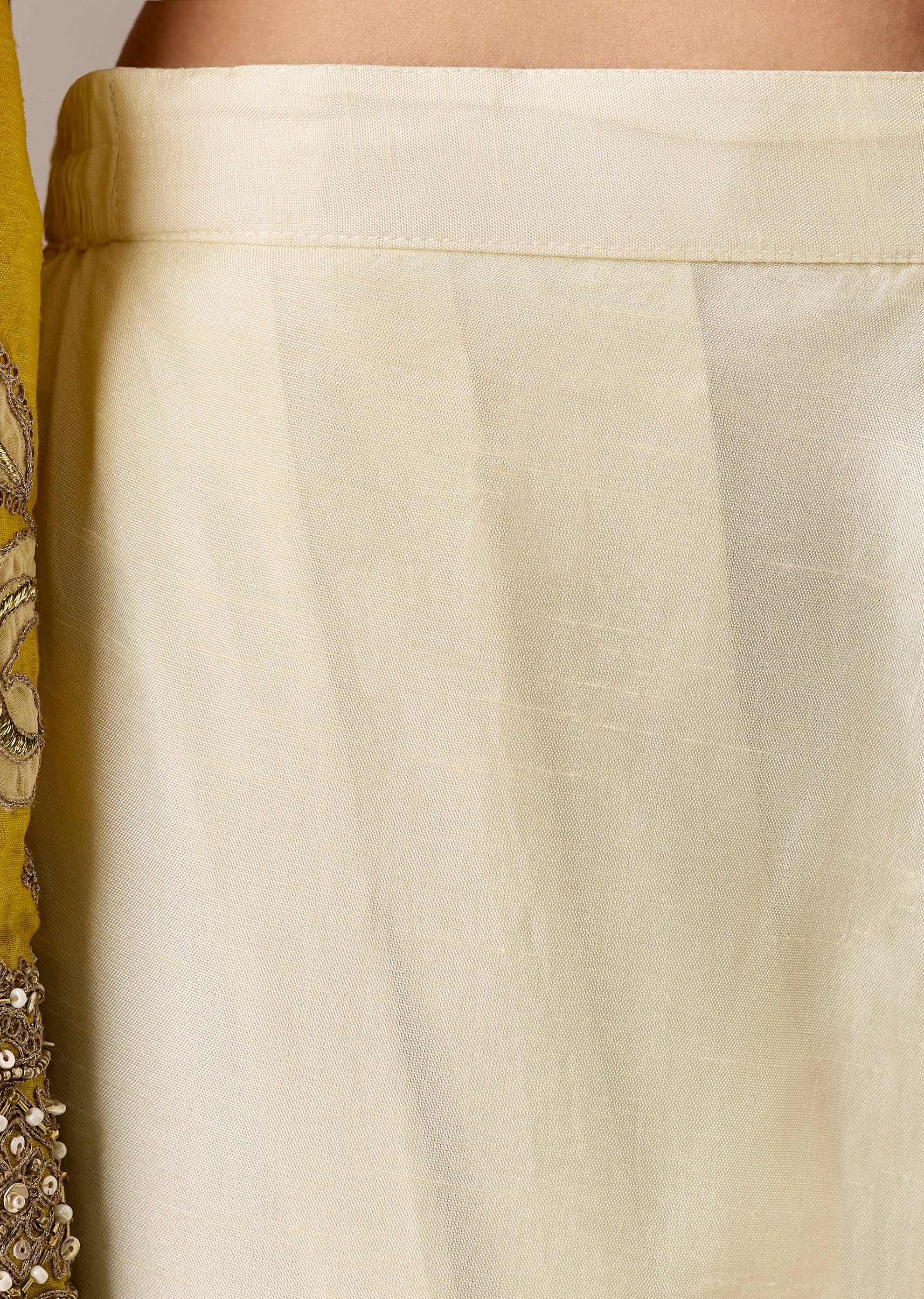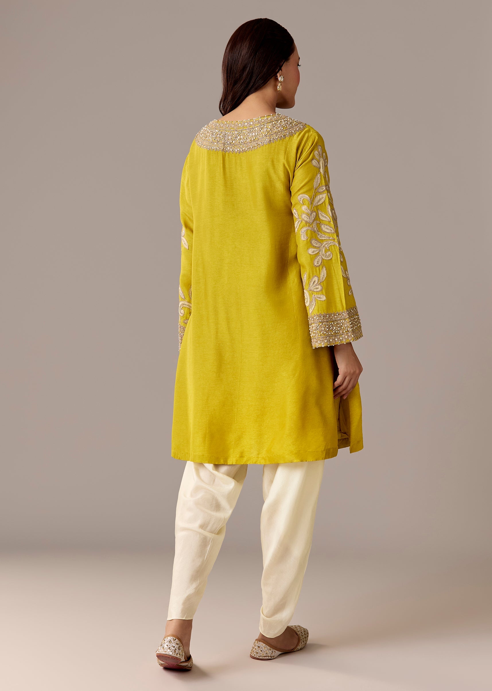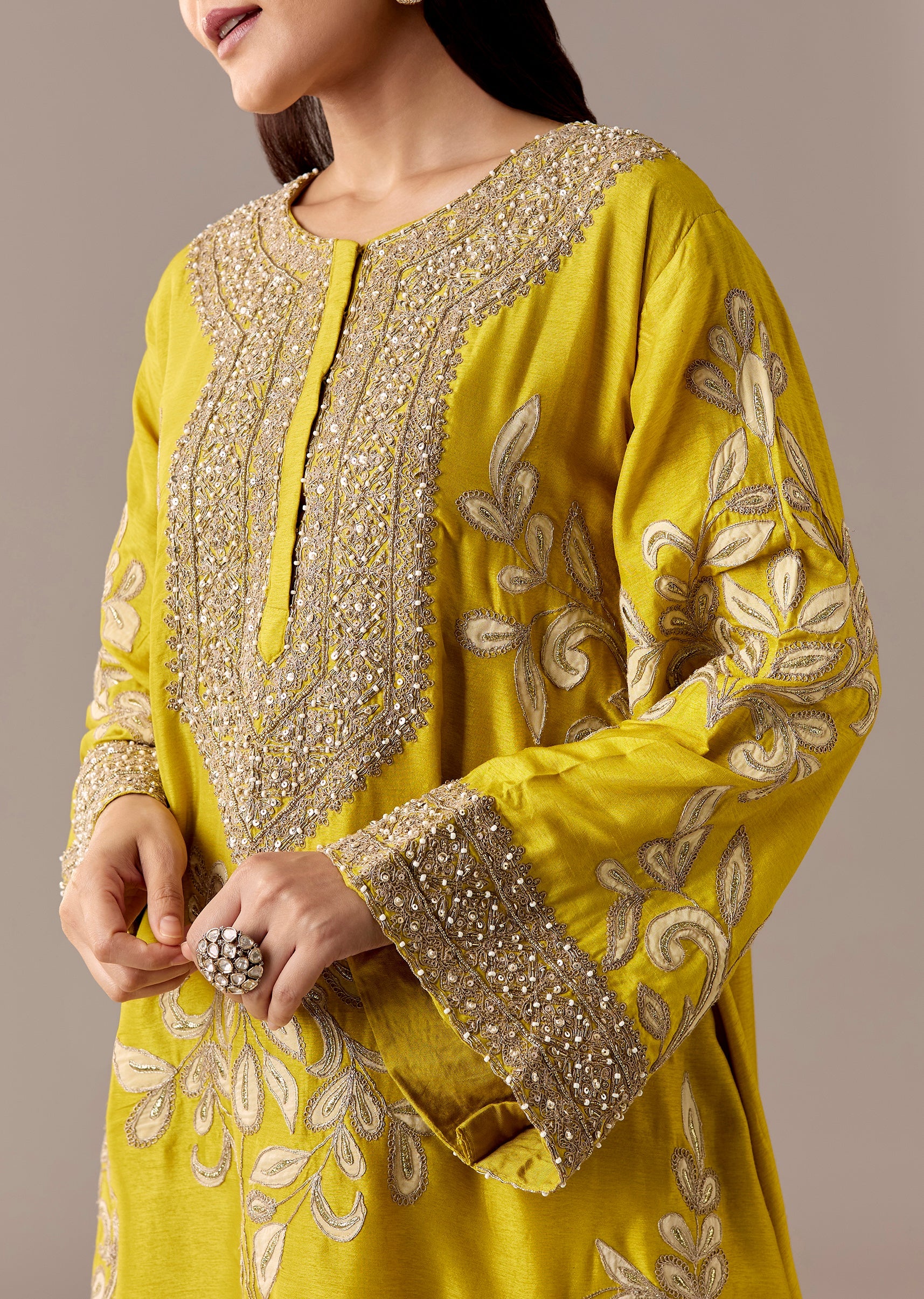 A vibrant yellow A-line kurta with patchwork and zari thread accents, paired with a cream dhoti for a festive twist. Flared sleeves and a relaxed shape make it a great... More Product Details