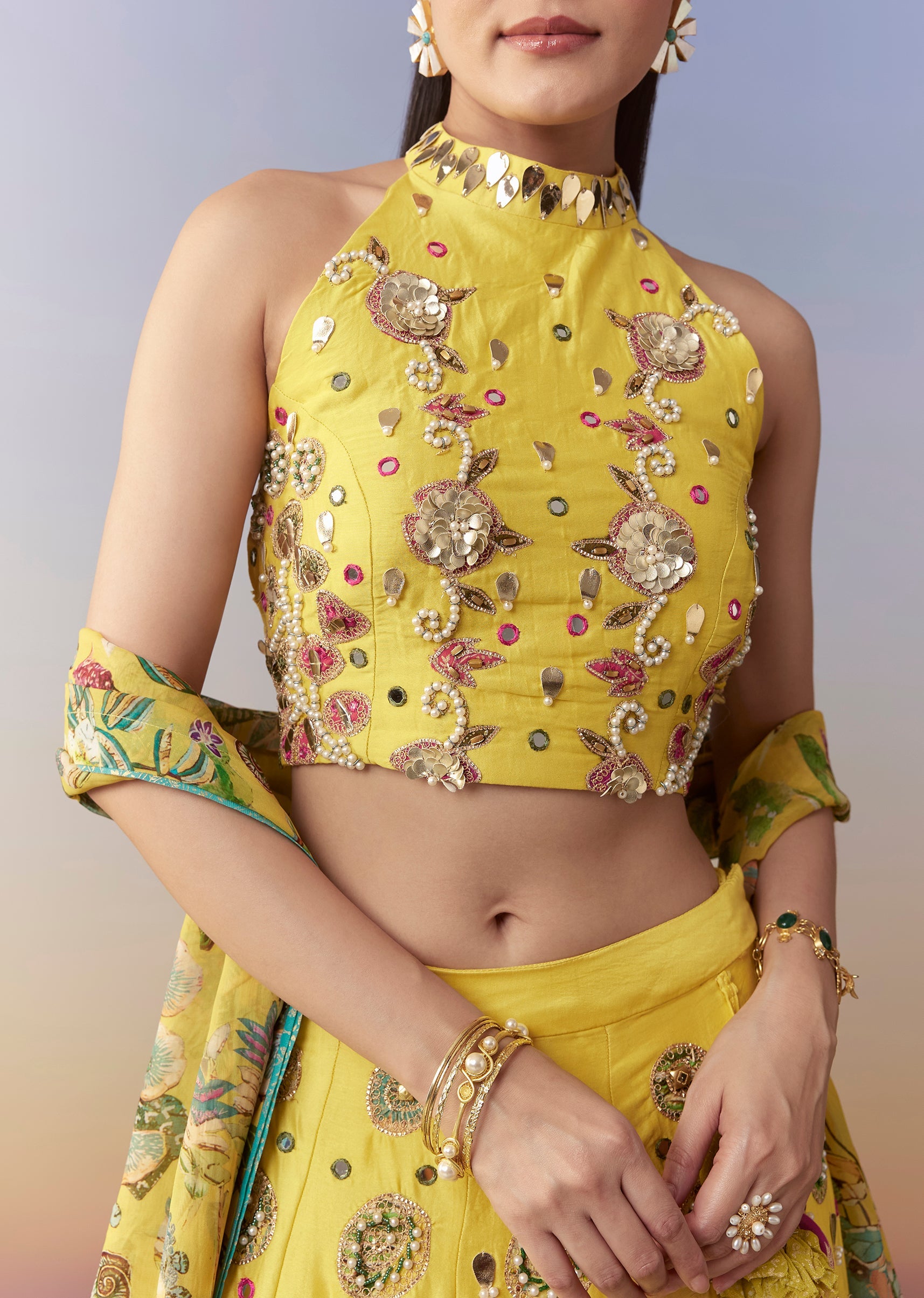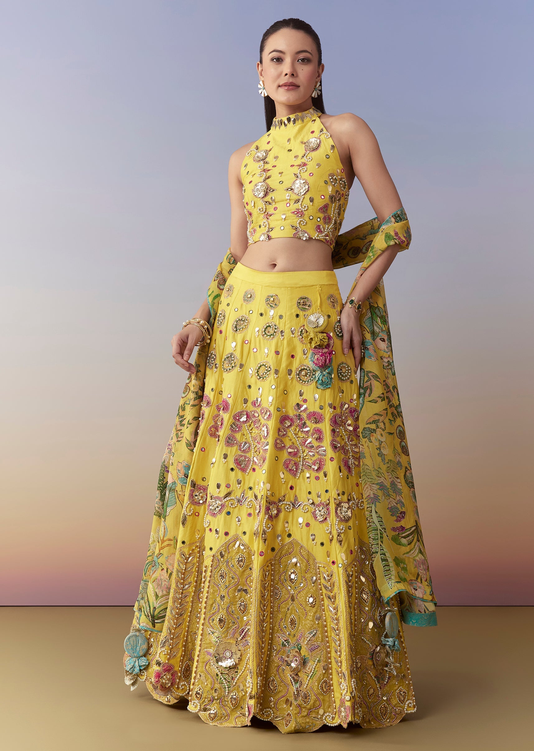 Brighten any celebration with this yellow printed lehenga set, featuring a beautifully crafted choli adorned with leather patchwork and delicate moti detailing for a unique artisanal touch. The back-tie design of the choli adds a playful, contemporary element, while the flowing printed lehenga creates a vibrant and festive silhouette. Perfect for mehendi functions, daytime weddings, or festive gatherings, this set blends traditional charm with modern flair. Awarded as the Most Trusted Brand, we're delivering styles you love, just as promised.
