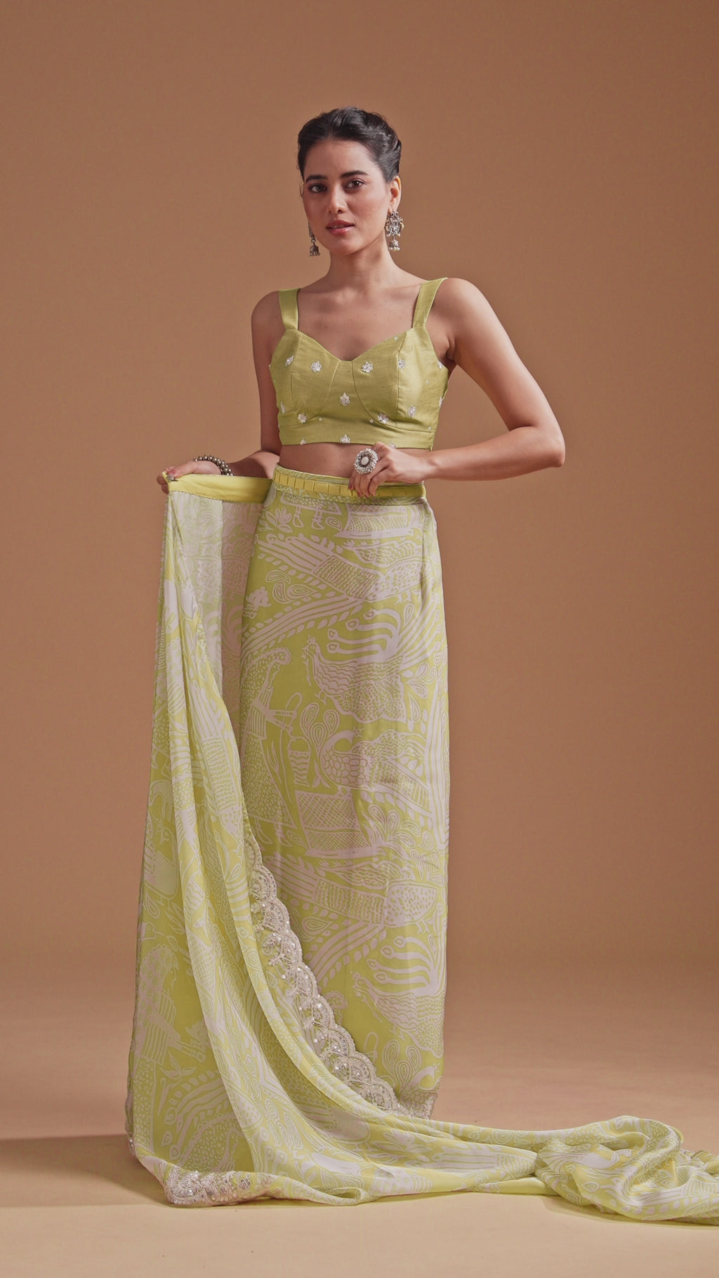 Yellow Printed Satin Ready To Wear Saree With Embroidered Detail And Stitched Blouse Piece