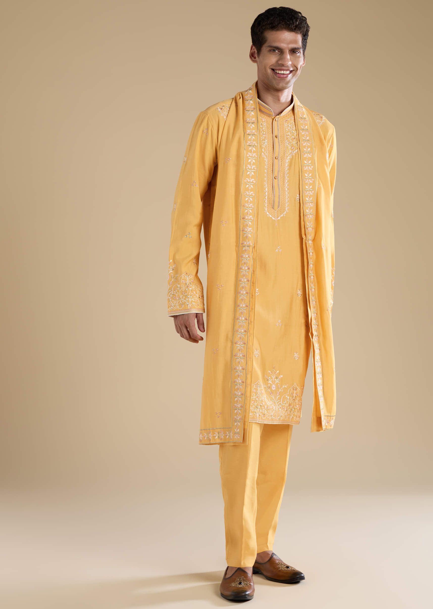 Yellow Resham Work Mens Kurta Set with Dupatta