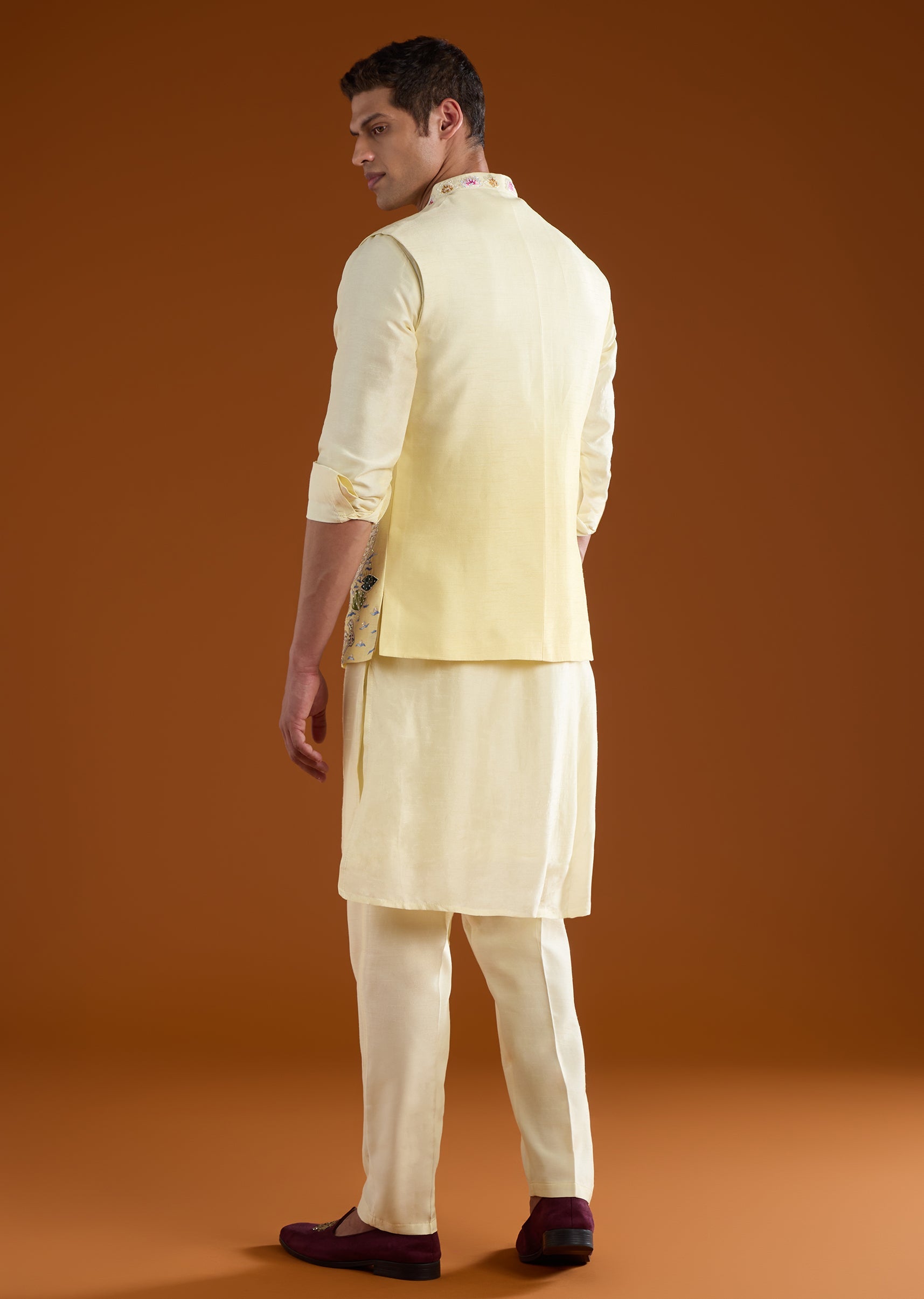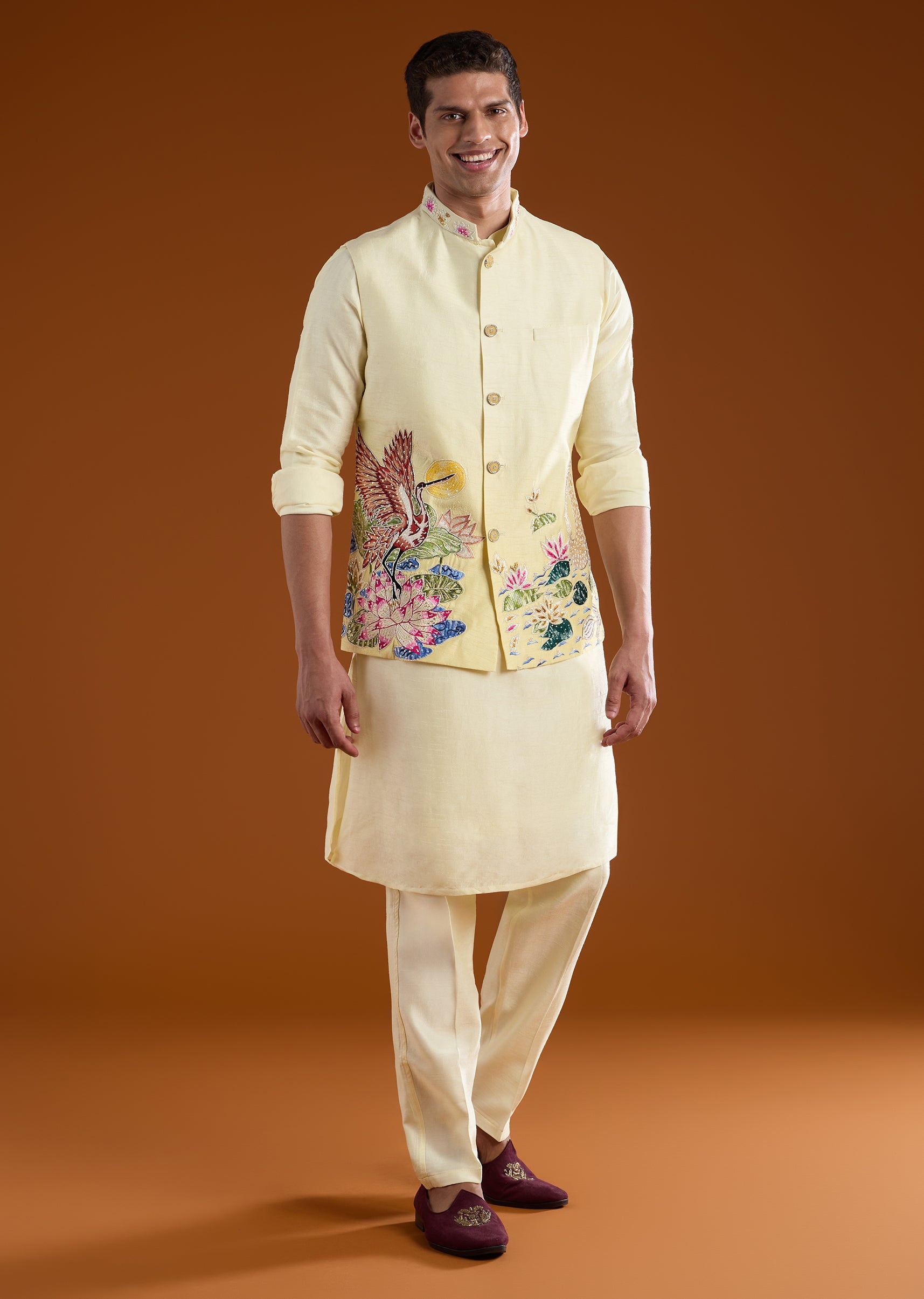 Steeped in traditional craftsmanship, this silk jacket kurta set is elevated with intricate thread, resham, and zardosi embroidery that adds a rich, ceremonial character. The full sleeves and mandarin collar create a sharp, structured silhouette, while the layered jacket lends depth and sophistication to the look. Designed to balance heritage detailing with modern styling, this ensemble includes a jacket, kurta, and coordinated pants. An ideal choice for weddings, festive celebrations, and refined cultural occasions.Awarded as the Most Trusted Brand, we're delivering styles you love, just as promised.