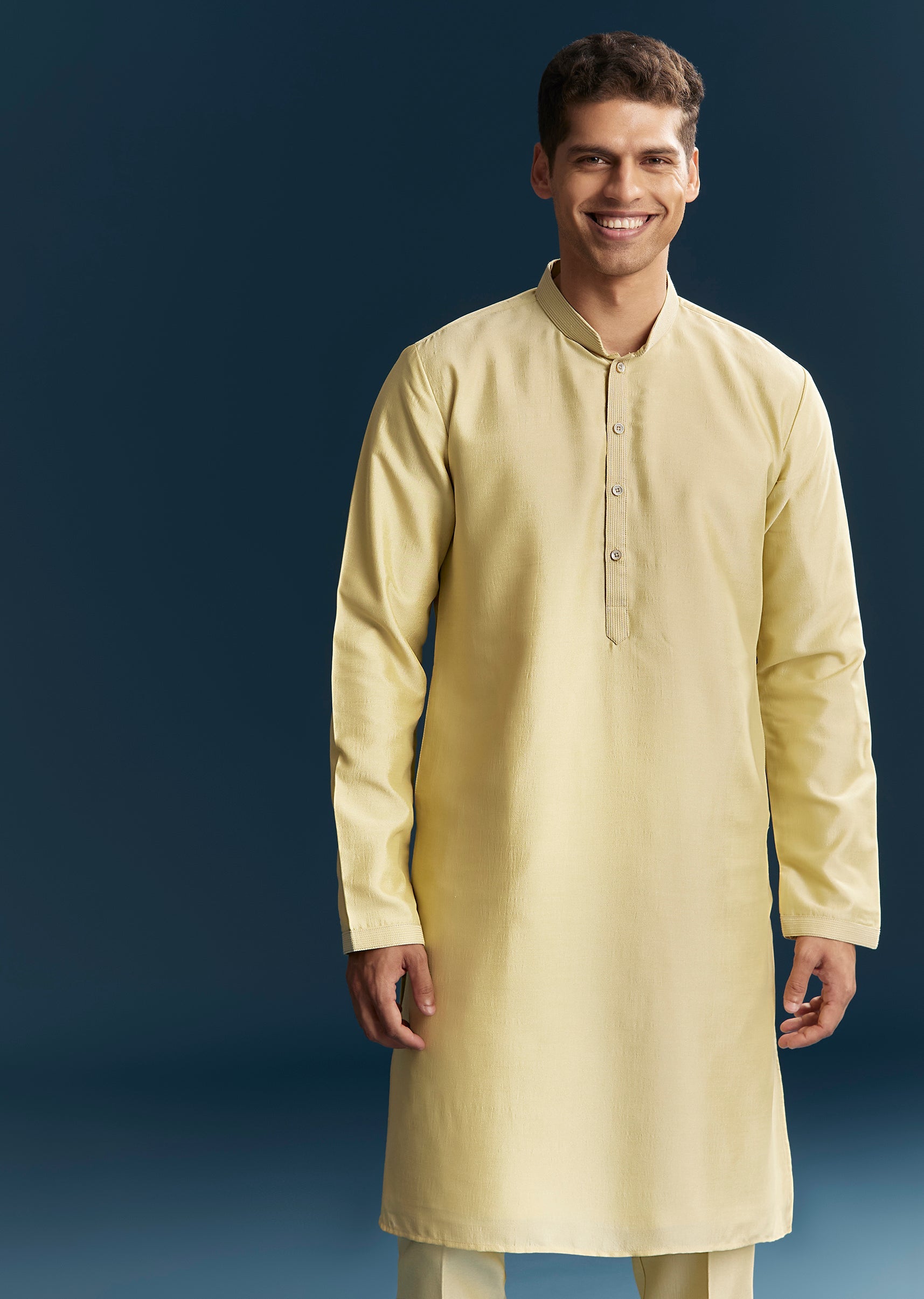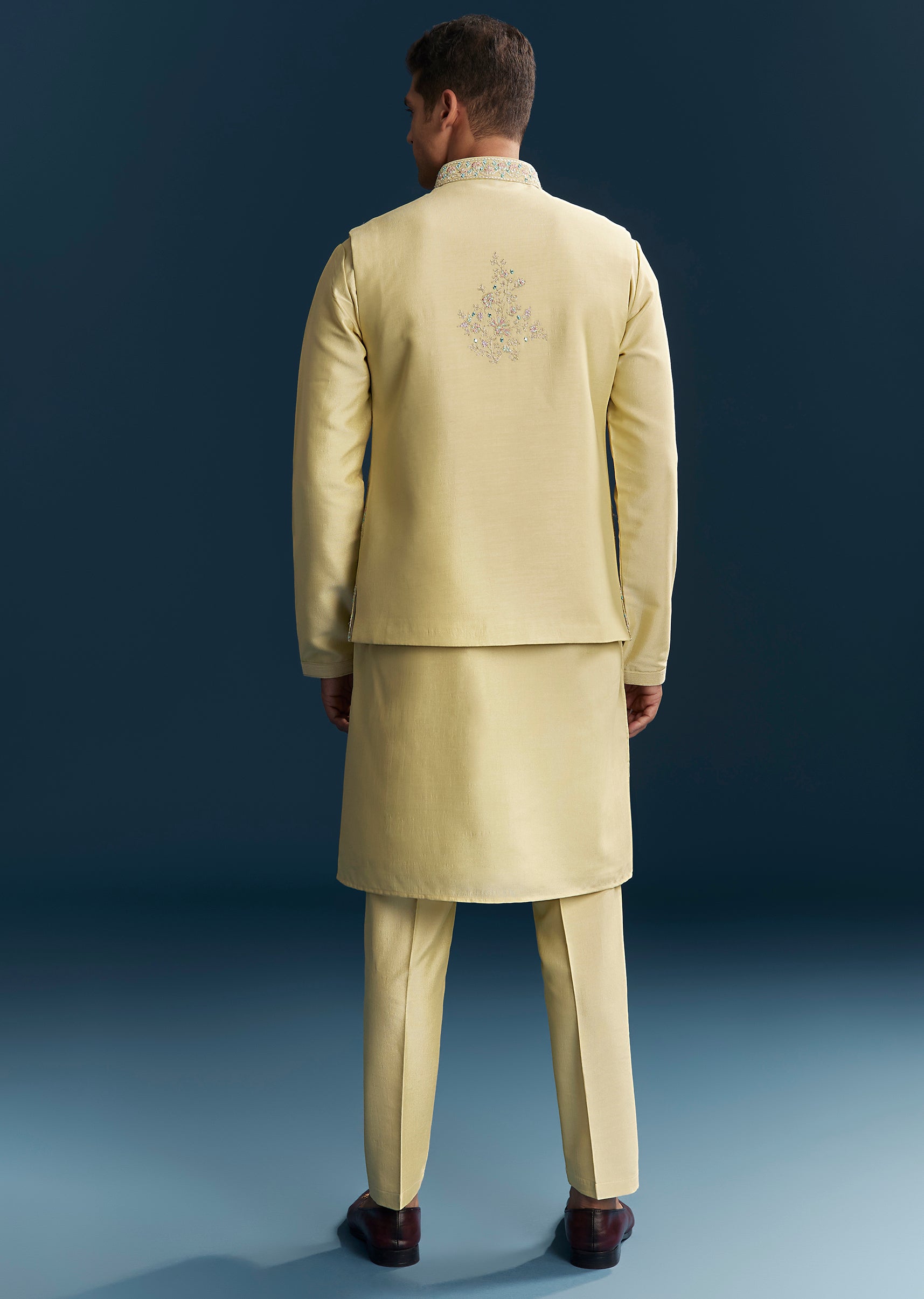 Bright and cheerful, this yellow kurta jacket set in festive pastels is perfect for haldi and mehendi celebrations. Crafted in smooth silk fabric, it features delicate thread work paired with... More Product Details