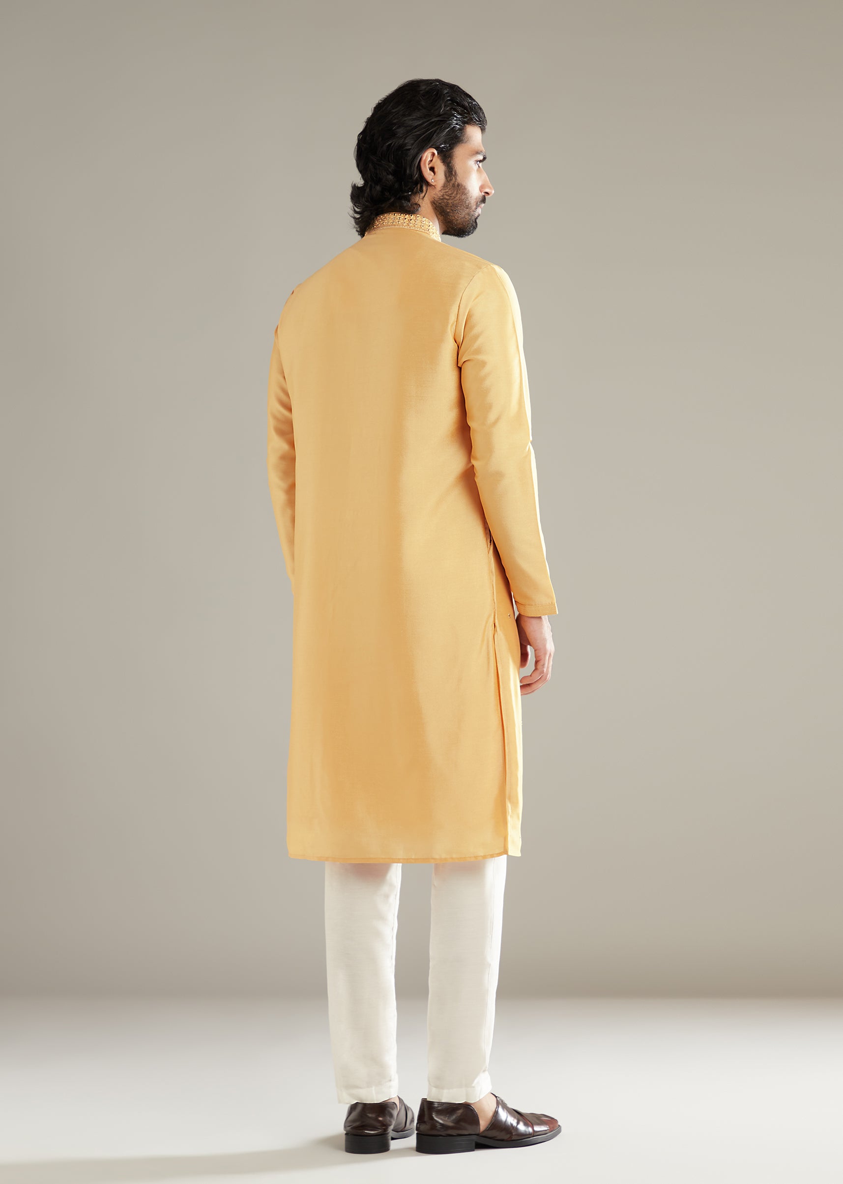 This yellow art silk men’s kurta set lines mirror detailing along the placket and collar, letting the glow sit close to the face for a bright, upbeat read. The base... More Product Details