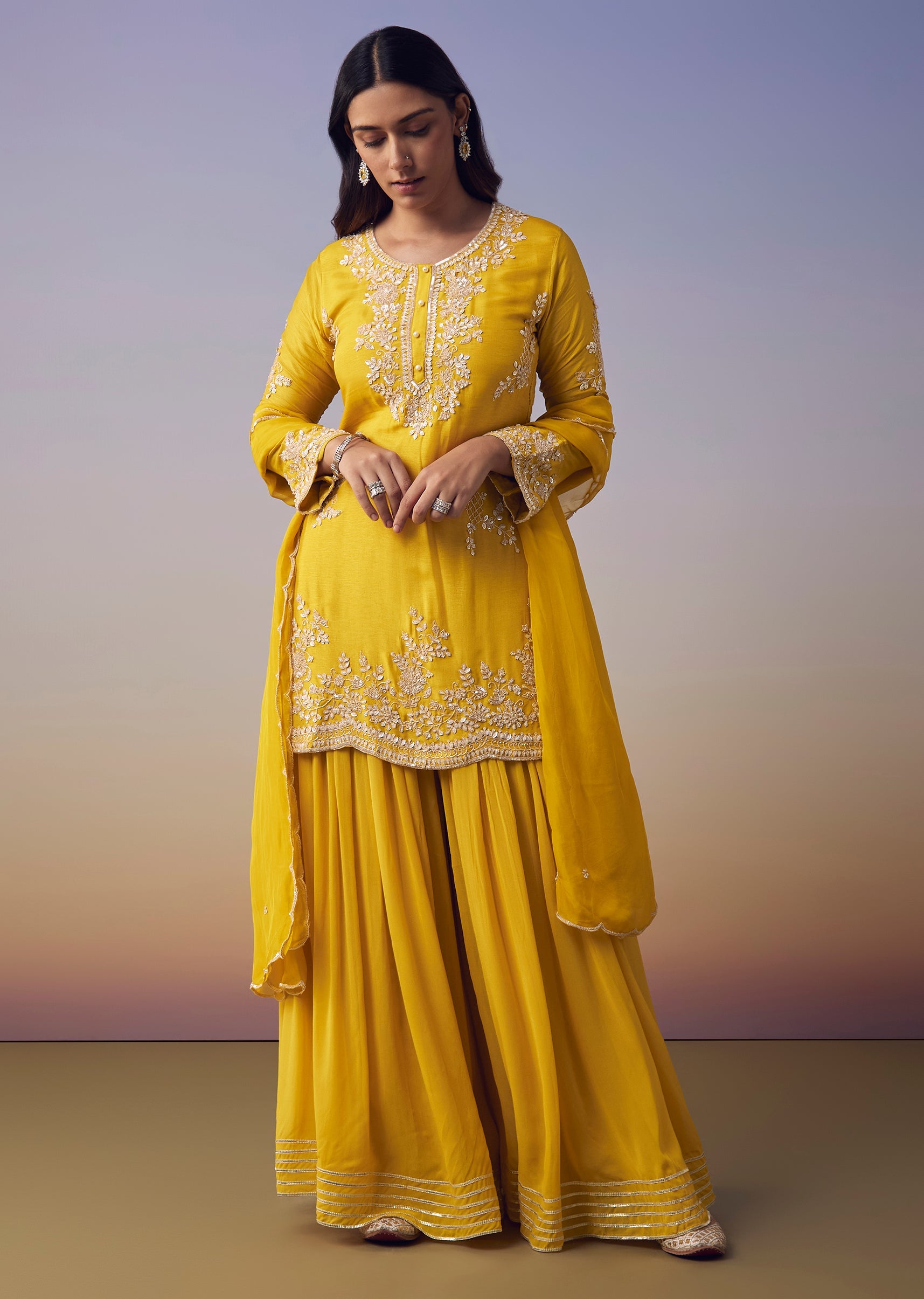 Yellow Silk Sequin Kurta and Palazzo Set