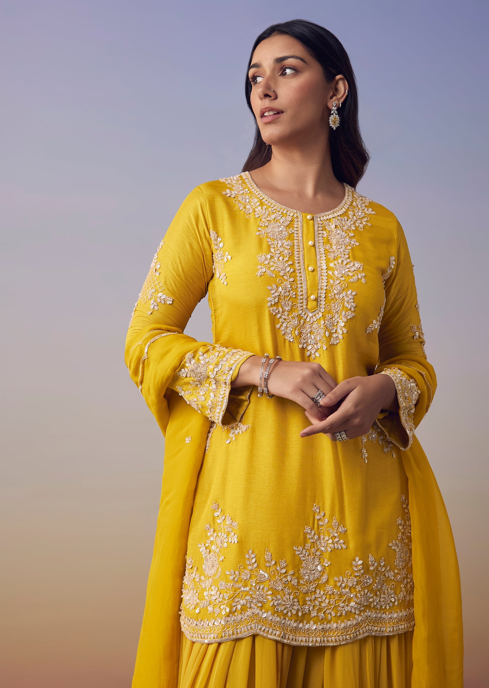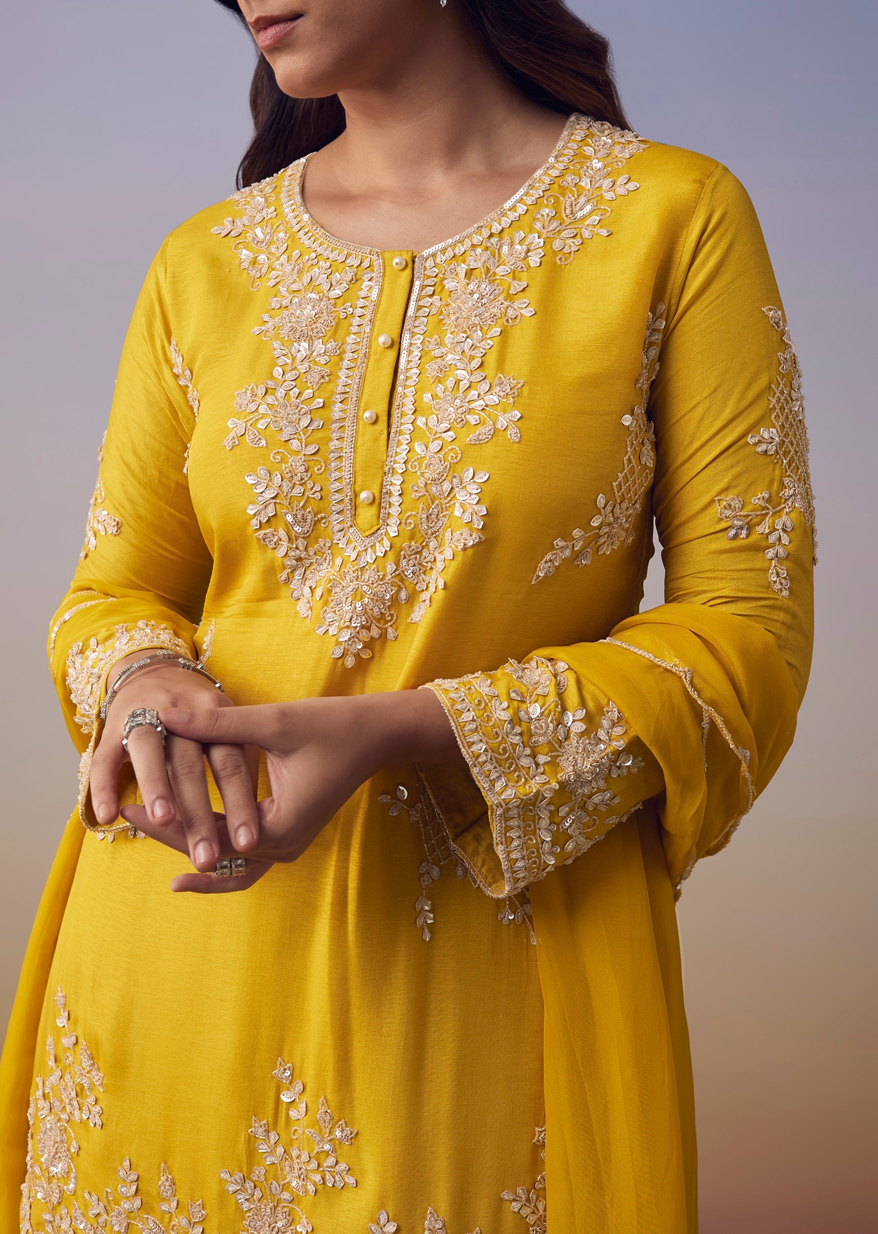 Brighten any celebration with this yellow silk kurta set adorned with sparkling sequins, fine cut dana detailing, and delicate embroidery that add a lively festive glow. The full sleeve round... More Product Details