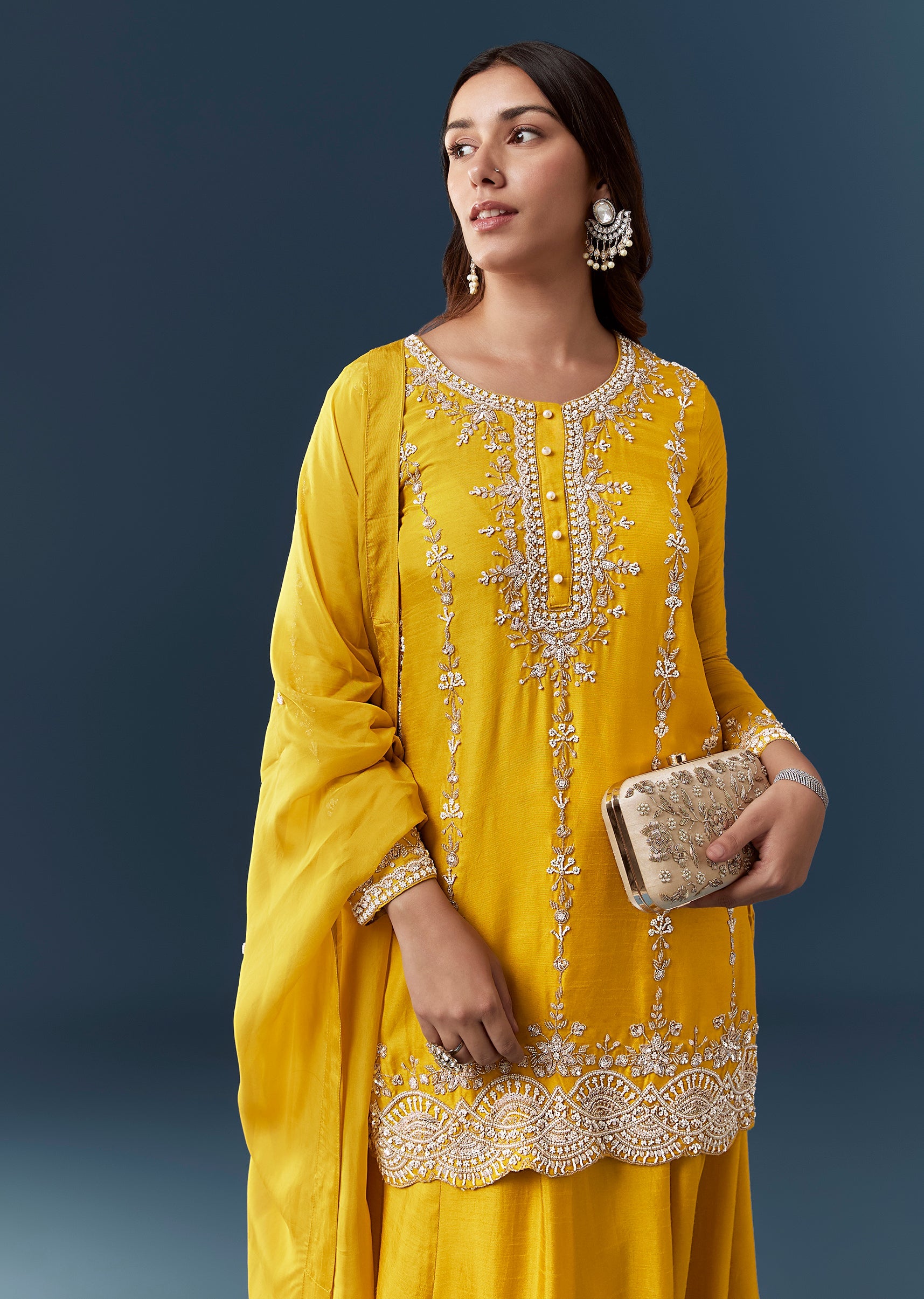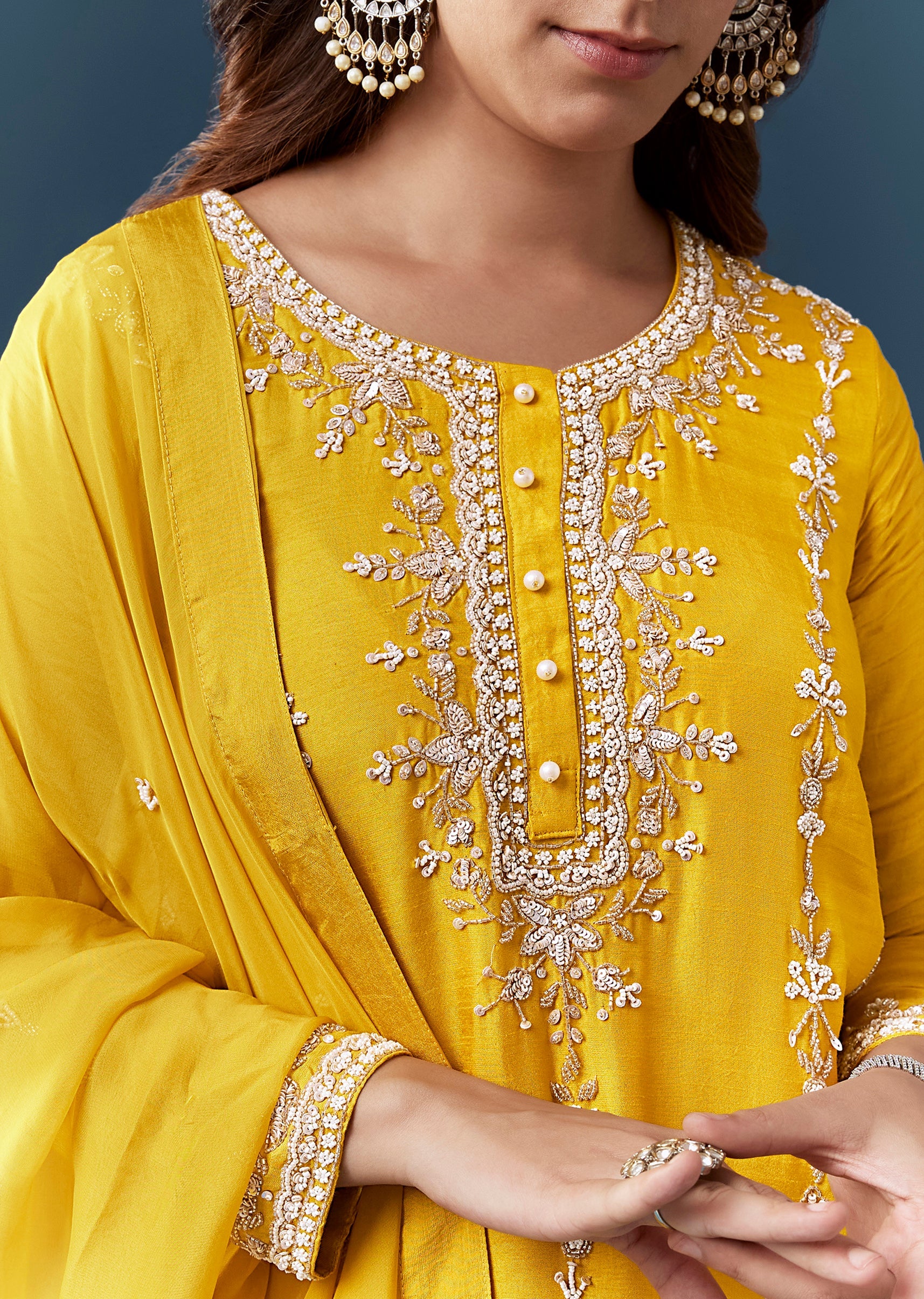 Radiant festive charm defines this yellow silk kurta set, highlighted with sparkling sequins, intricate cut dana work, and elegant embroidery that bring a lively celebratory glow. The full sleeve round... More Product Details