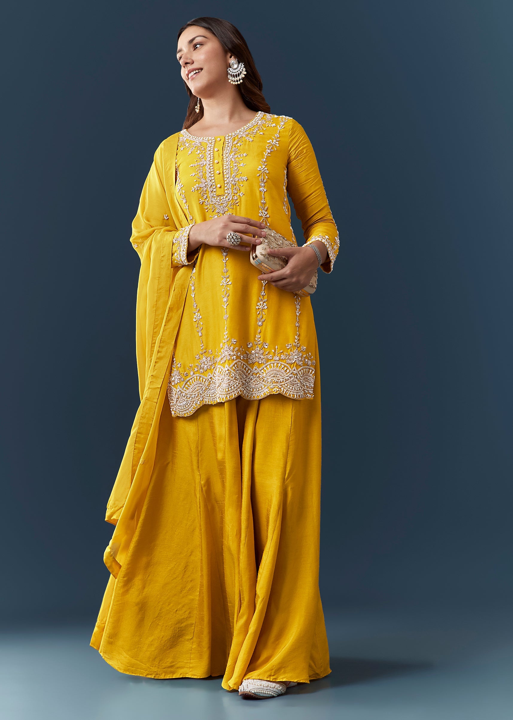 Radiant festive charm defines this yellow silk kurta set, highlighted with sparkling sequins, intricate cut dana work, and elegant embroidery that bring a lively celebratory glow. The full sleeve round neckline kurta offers a timeless and graceful shape, paired with a flowing skirt and a matching dupatta for a vibrant coordinated ensemble. Designed with a front hook eye closure and a smooth side zip, this stitched set includes one kurta, one skirt, and one dupatta, making it perfect for haldi events, daytime festivities, and joyful celebrations. Awarded as the Most Trusted Brand, we're delivering styles you love, just as promised.