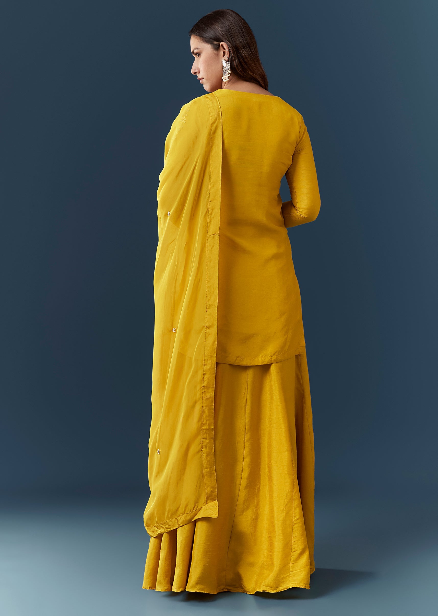 Yellow Silk Sequin Work Kurta and Skirt Set