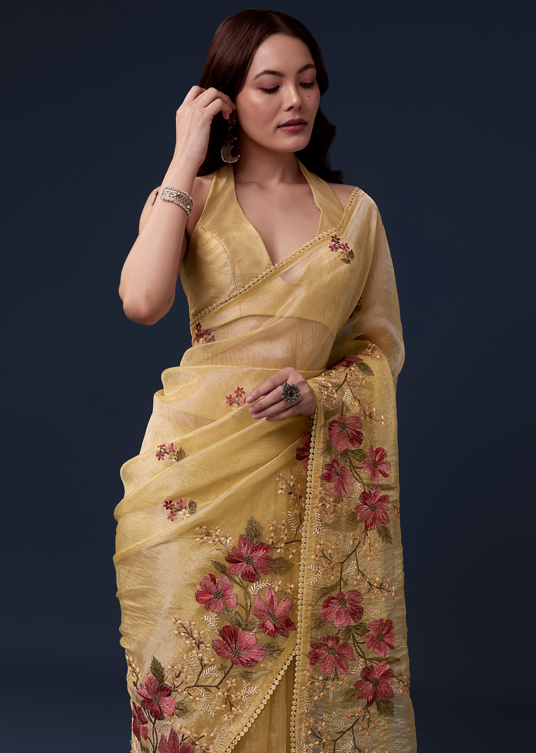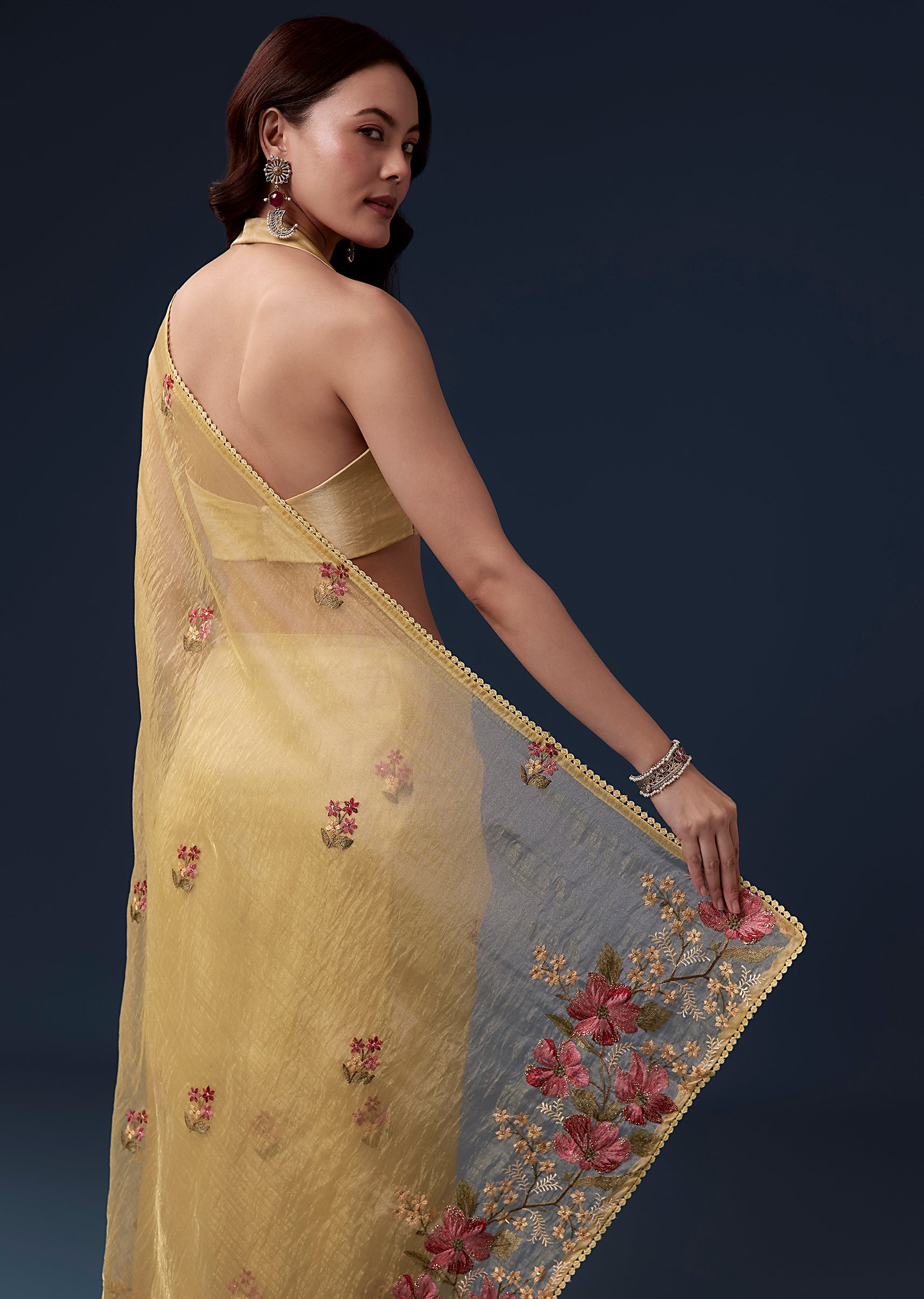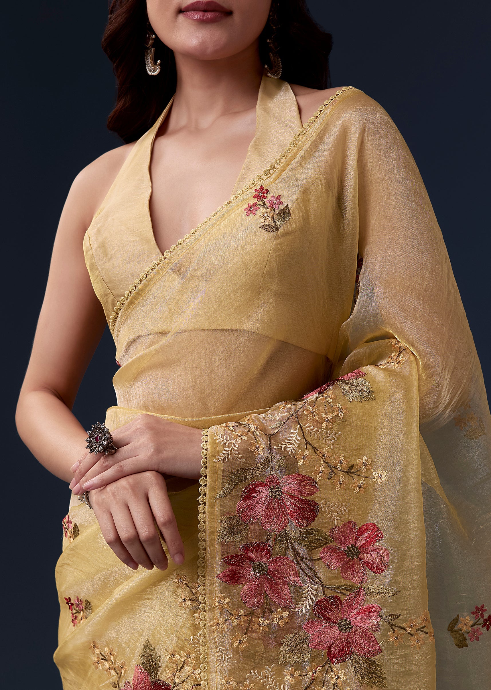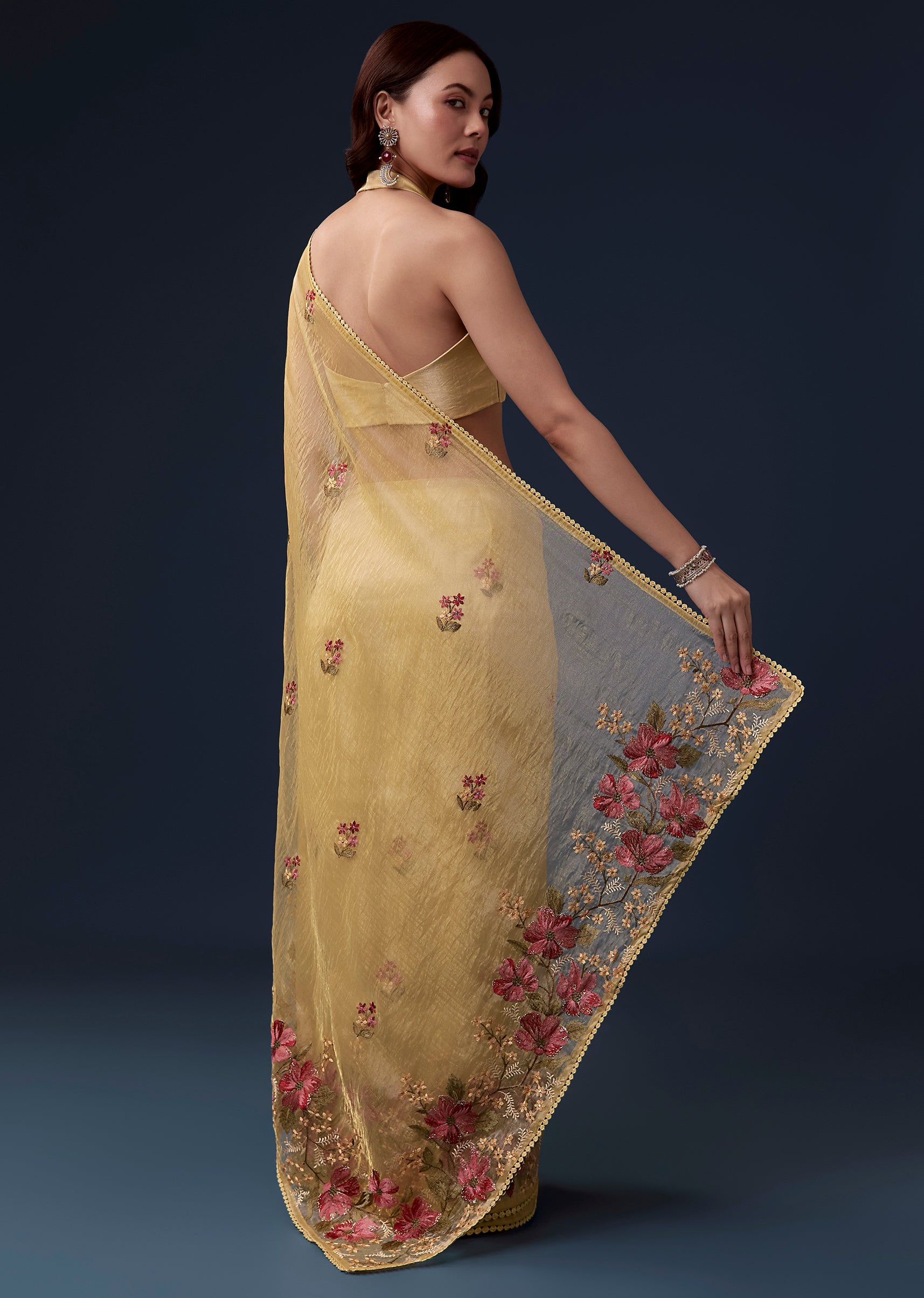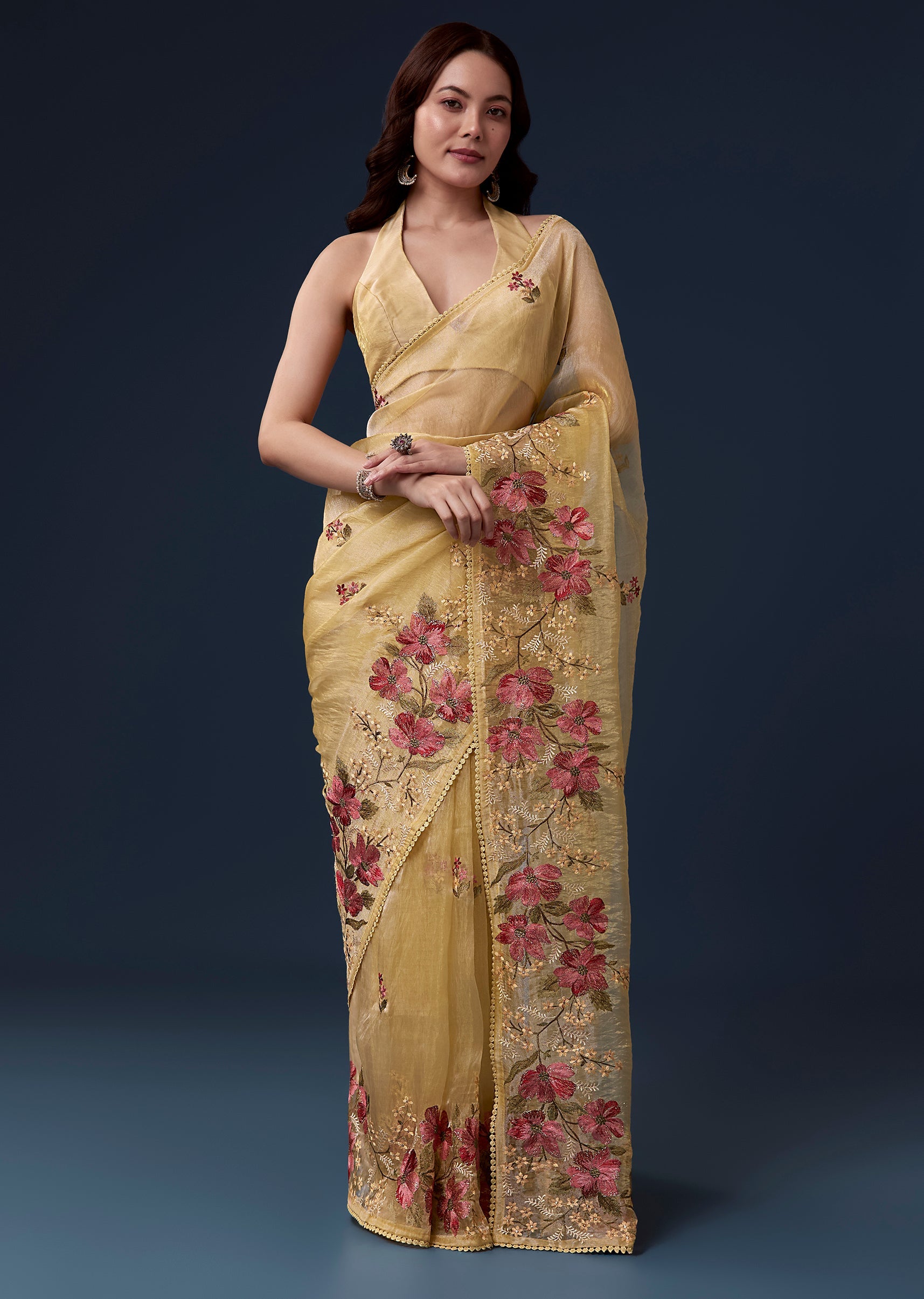 Bright cheerful and festive this yellow tissue organza saree is perfect for haldi and casual wedding celebrations. The soft pastel hue is enhanced with delicate floral embroidery in multicolor resham... More Product Details