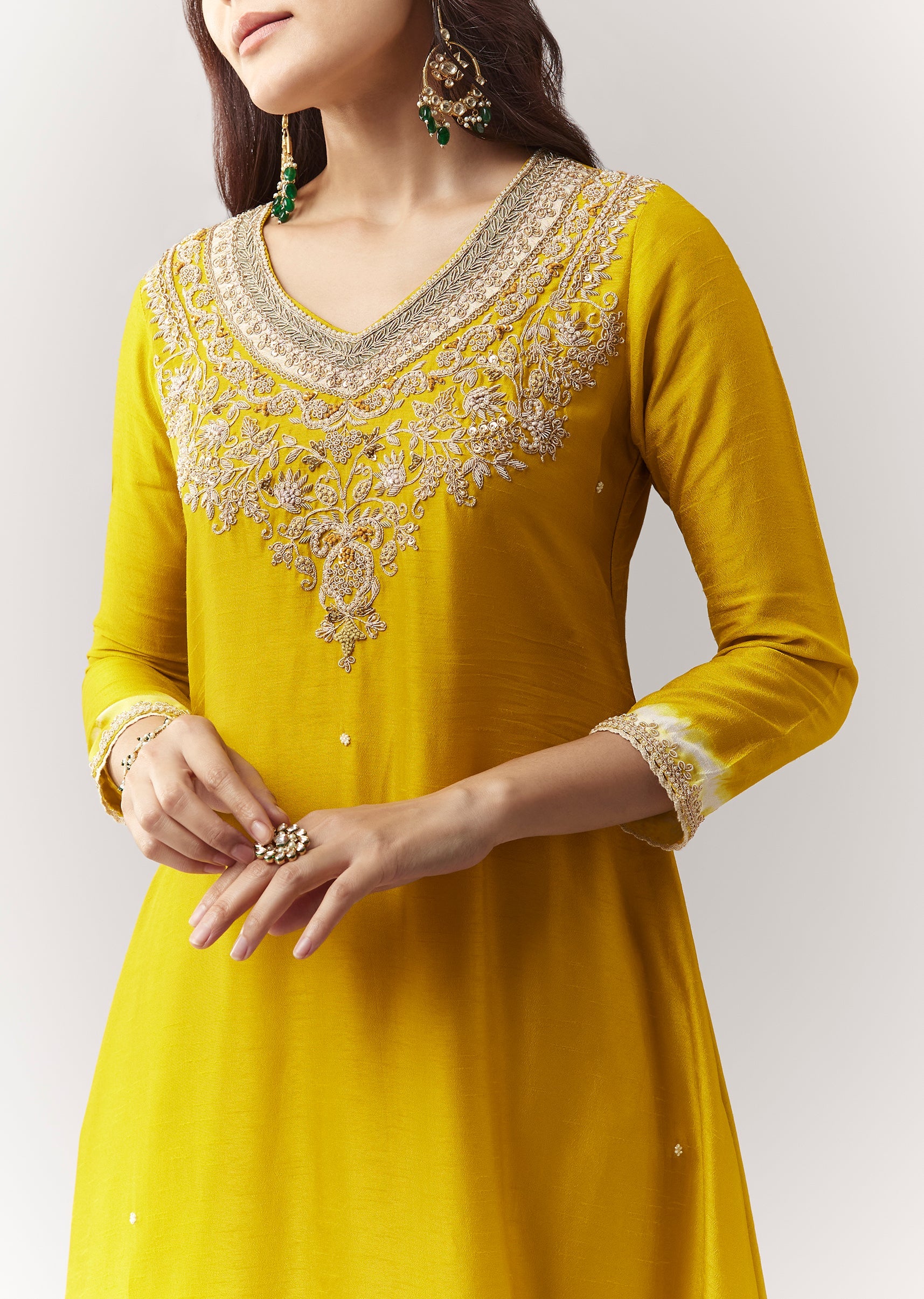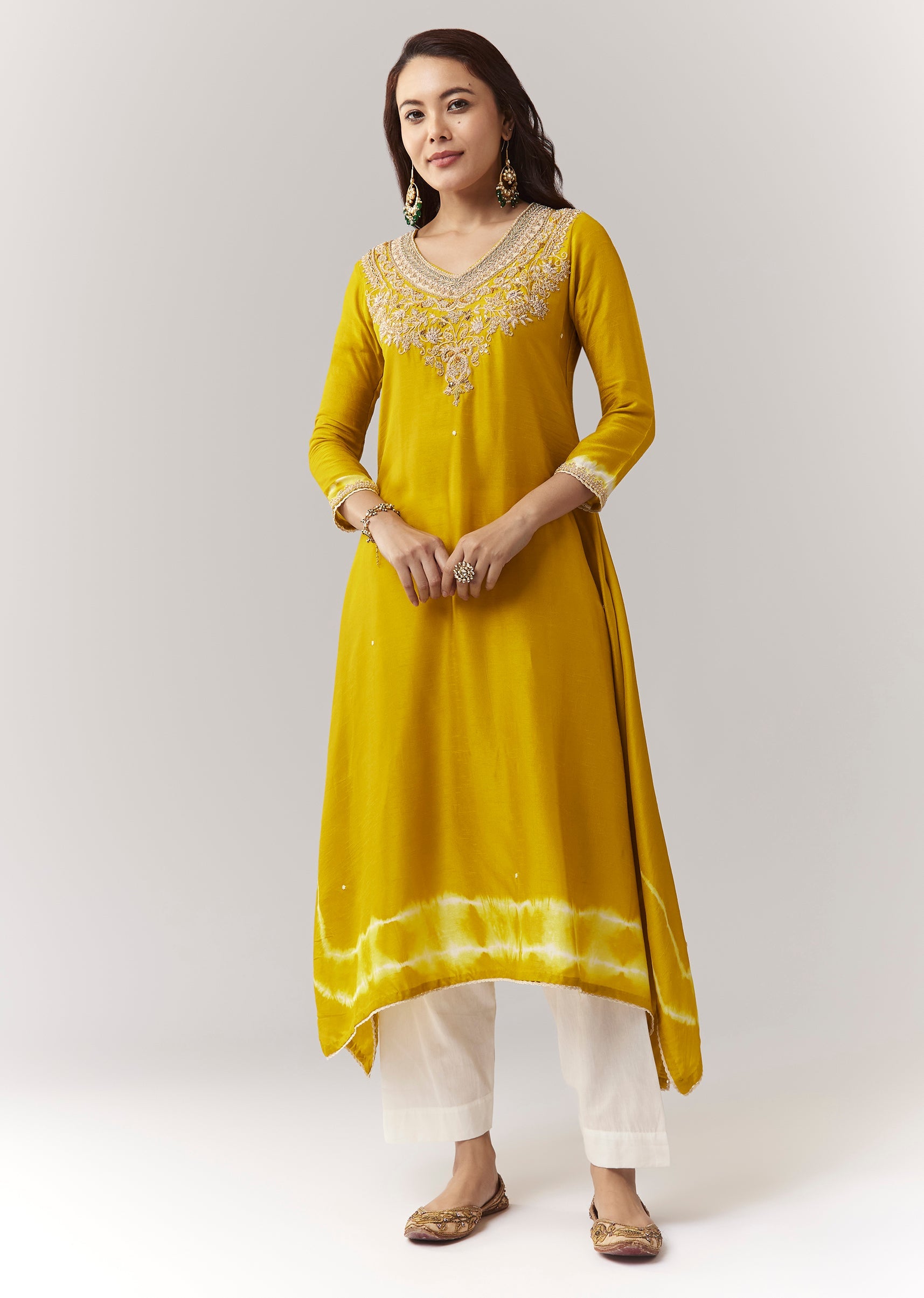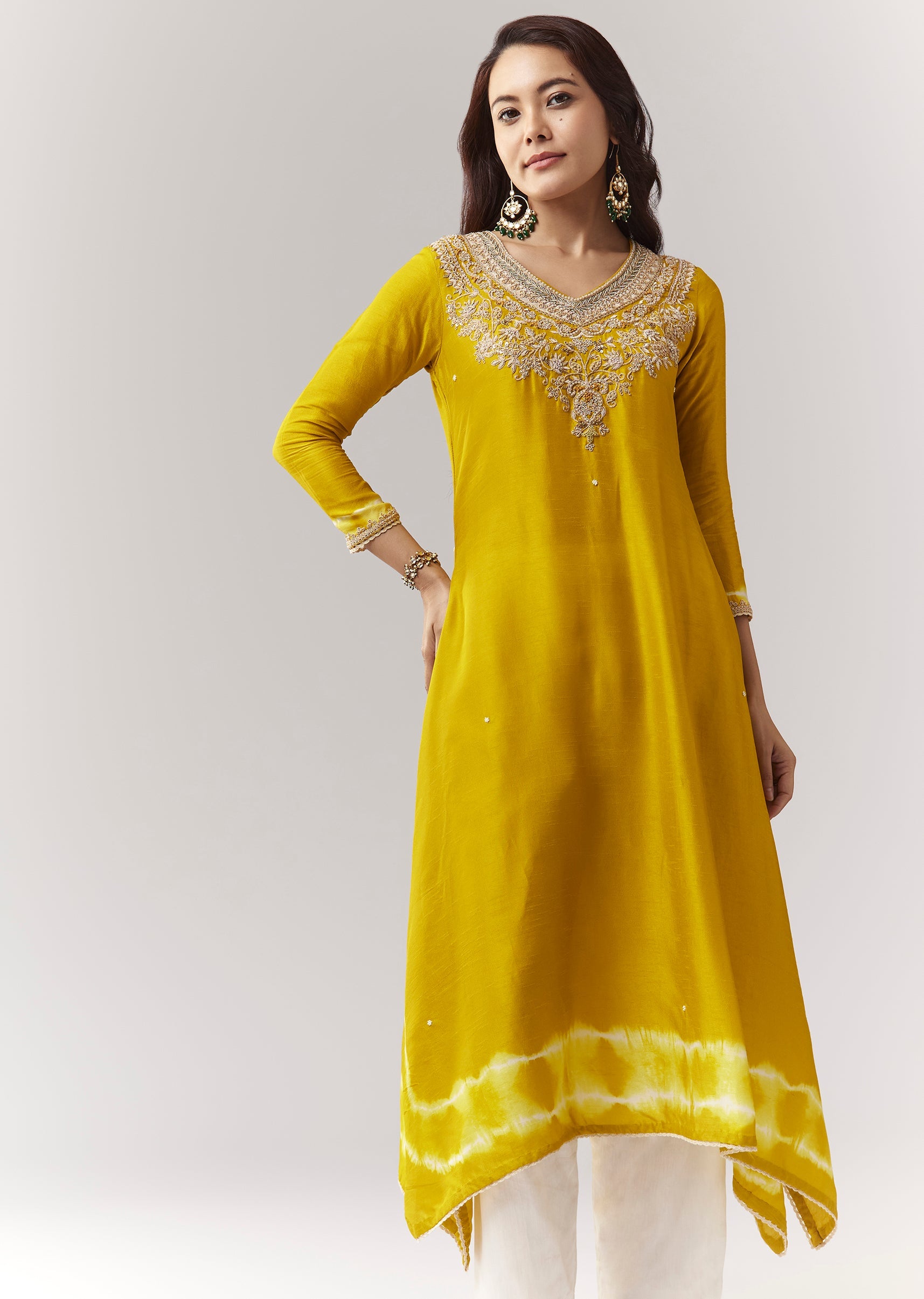 A festive yellow asymmetric kurta with zardosi work and leheriya border, paired with straight pants. Awarded as the Most Trusted Brand, we're delivering styles you love, just as promised.